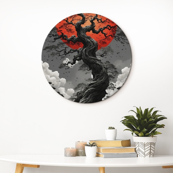 Luna sobre un campo de flores rojas en un cielo brumoso al atardecer