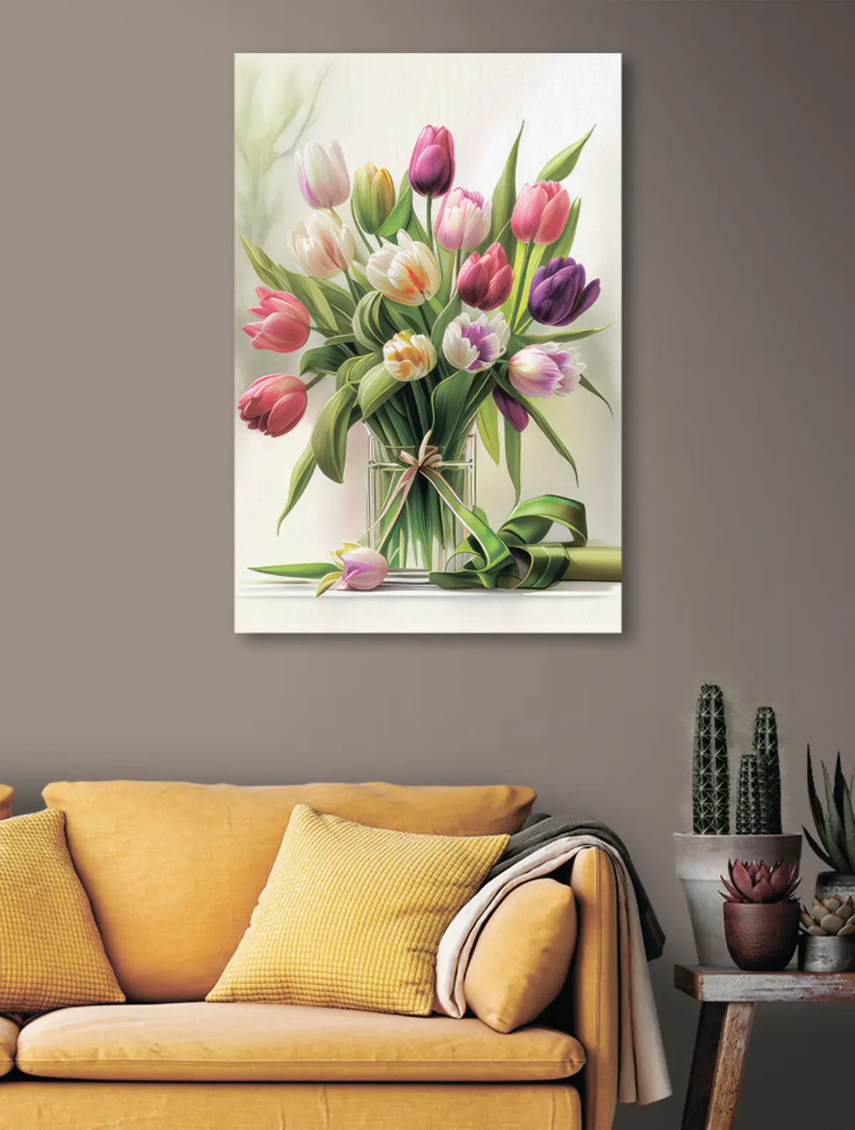 Hay tres tipos de material disponibles para pedidos: Lienzo Económico - material denso y duradero para impresión digital, idéntico al lienzo de pintor, superficie impermeable, reproducción realista de los detalles, material de grano medio. Lienzo Premium - la textura se asemeja a la de un lienzo de pintor (pequeños hilos entrelazados). Reproducción suave y detallada de la imagen sobre una superficie mate. Eco-Premium - tejido 100% algodón de alta calidad. Gracias a las fibras naturales de algodón, el material es duradero y resistente al desgaste. Excelente reproducción del color y el detalle.