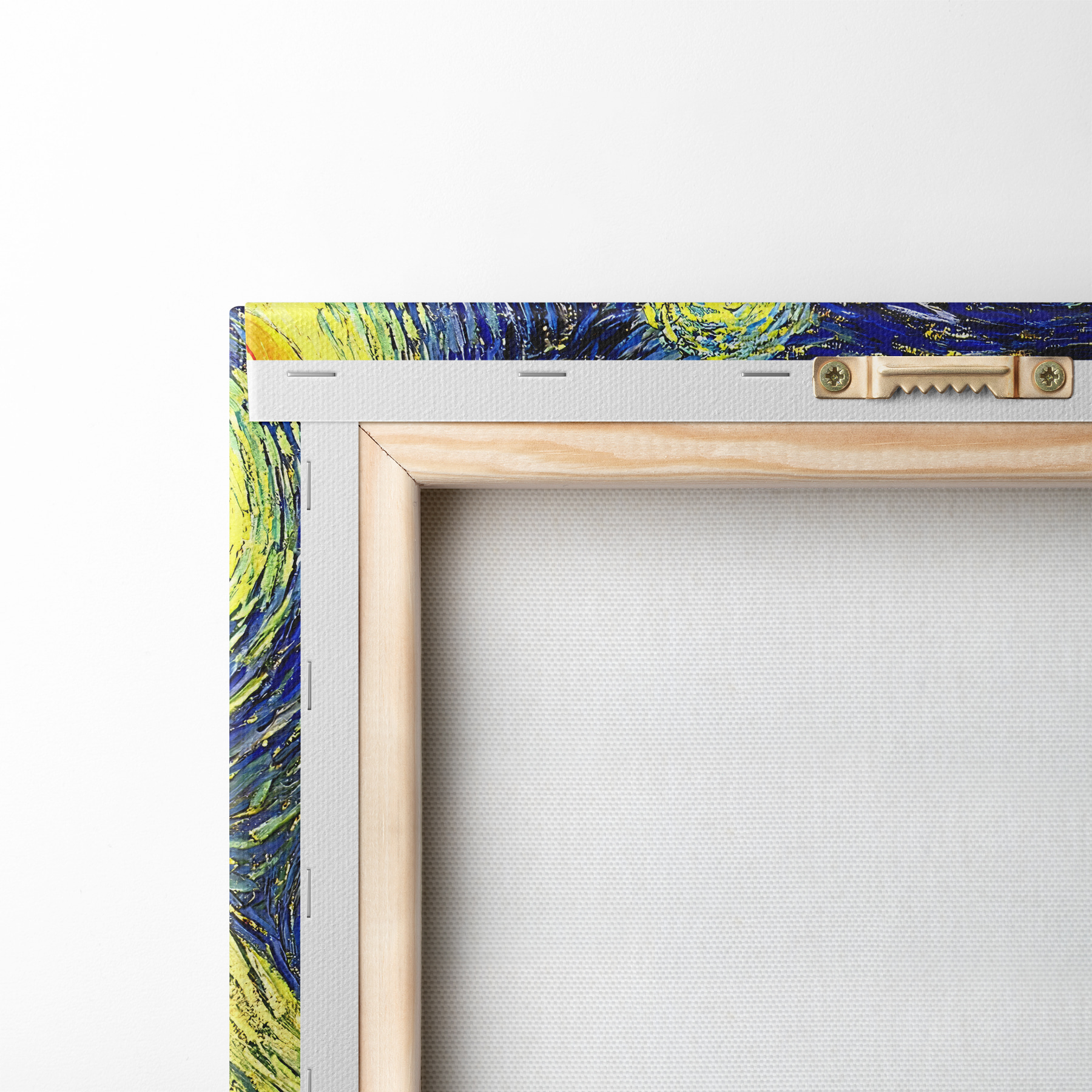 Vendemos cuadros en bastidor: se trata de un marco de madera sobre el que se extiende el lienzo. Este cuadro no necesita marco; puedes colgarlo directamente en la pared.