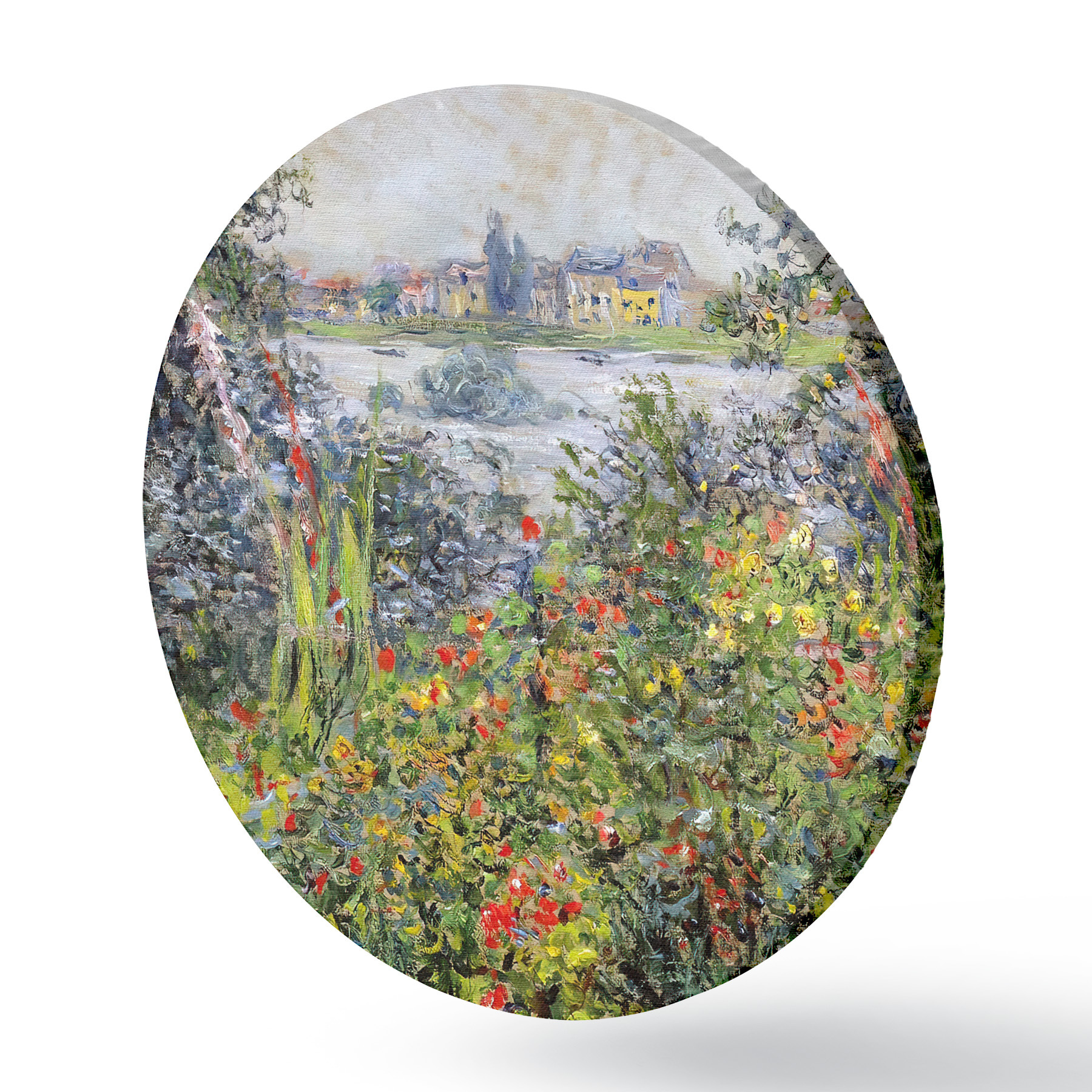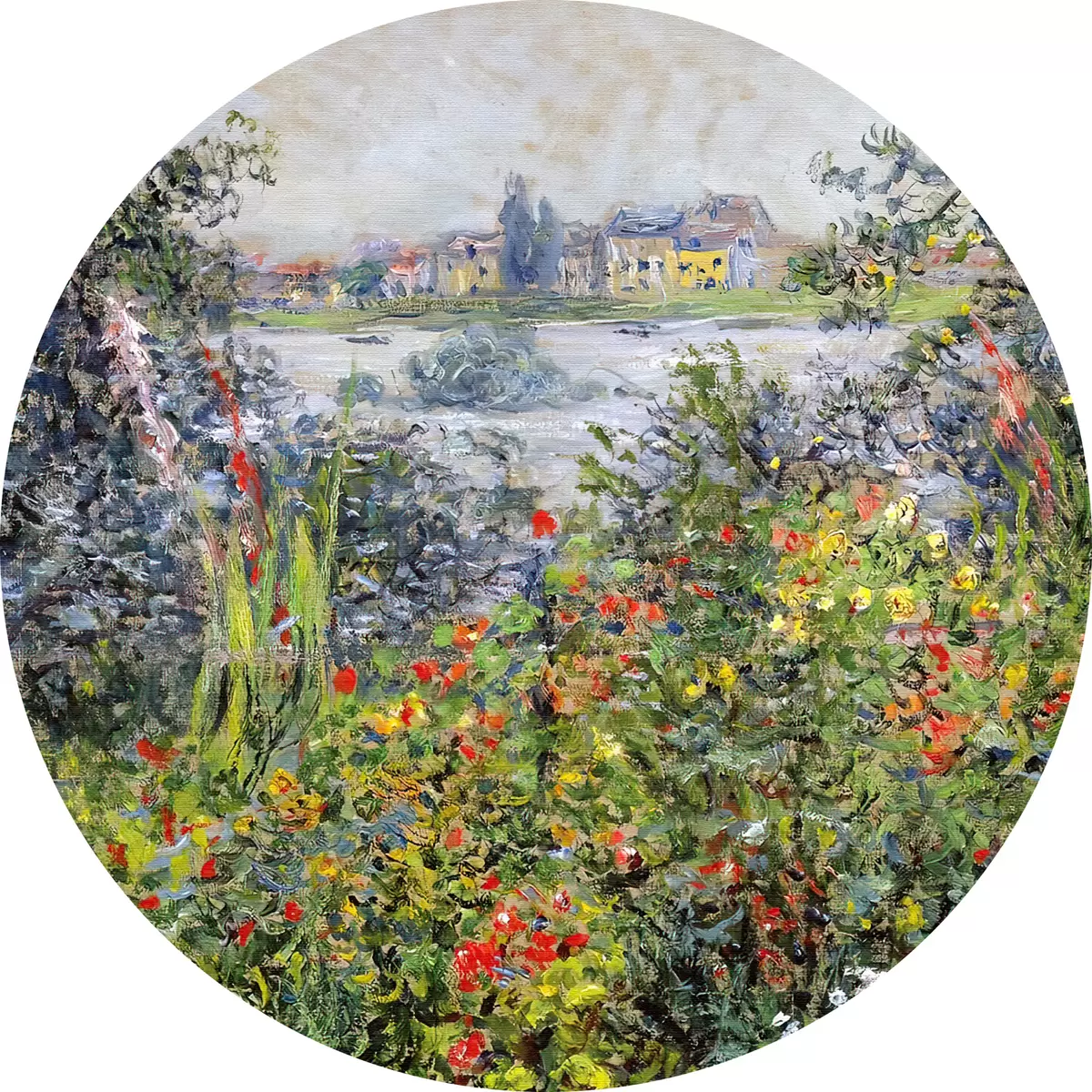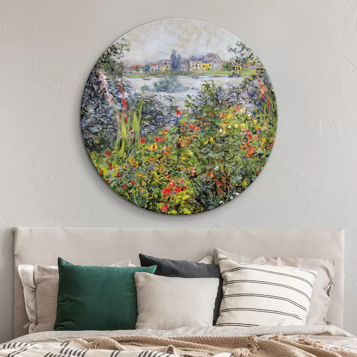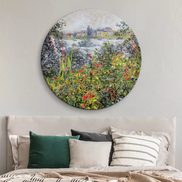 Cuadros redondos Flores vibrantes junto a un lago tranquilo r04136