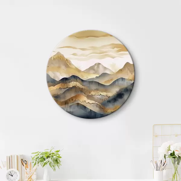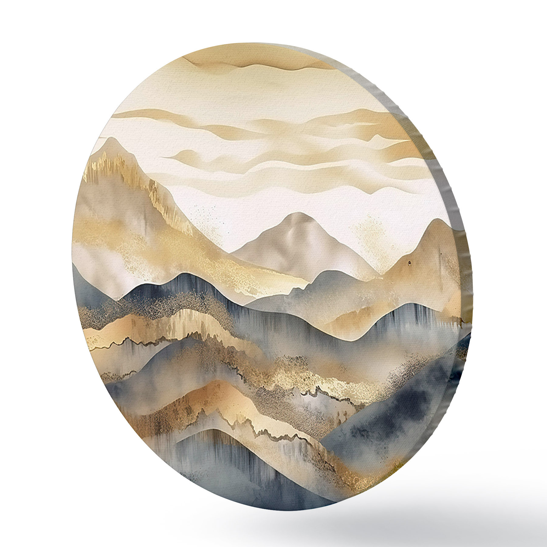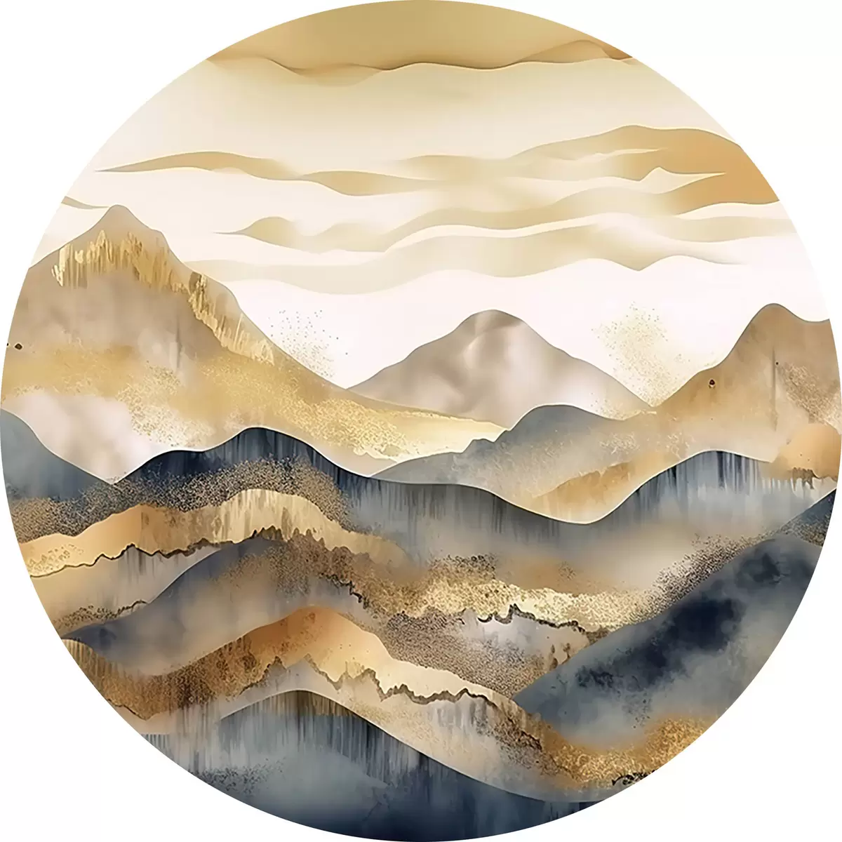 Cuadros redondos Fondo abstracto de montañas en beige y gris con elementos dorados sobre fondo blanco r34462