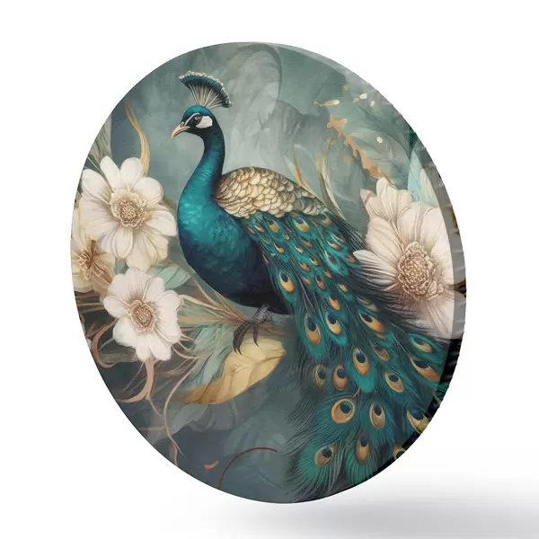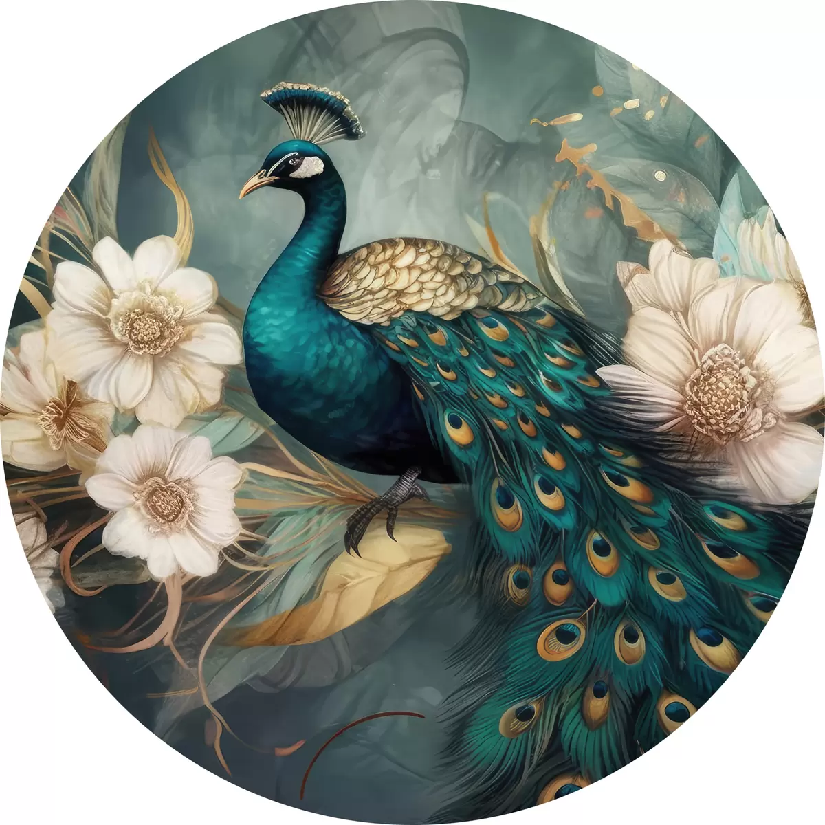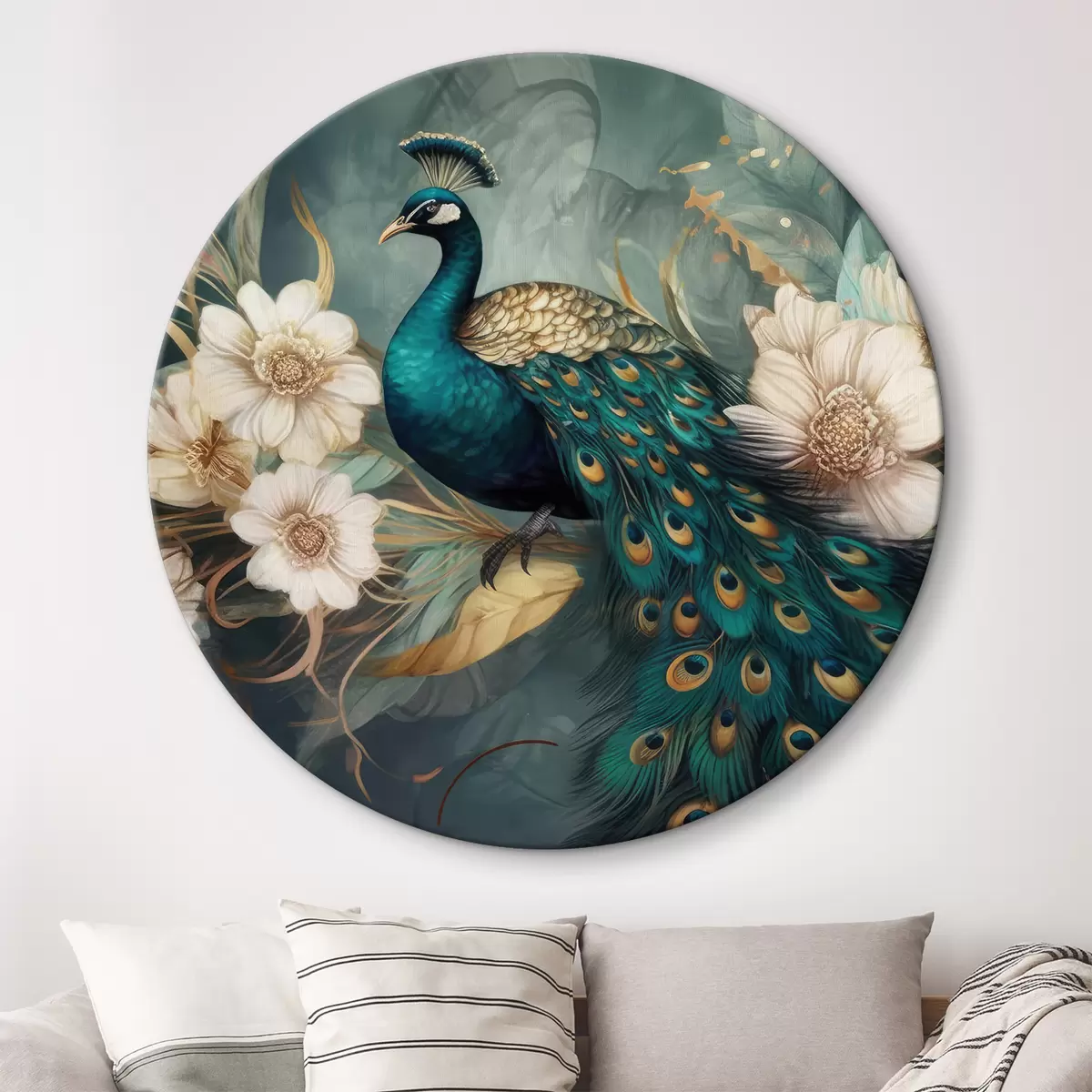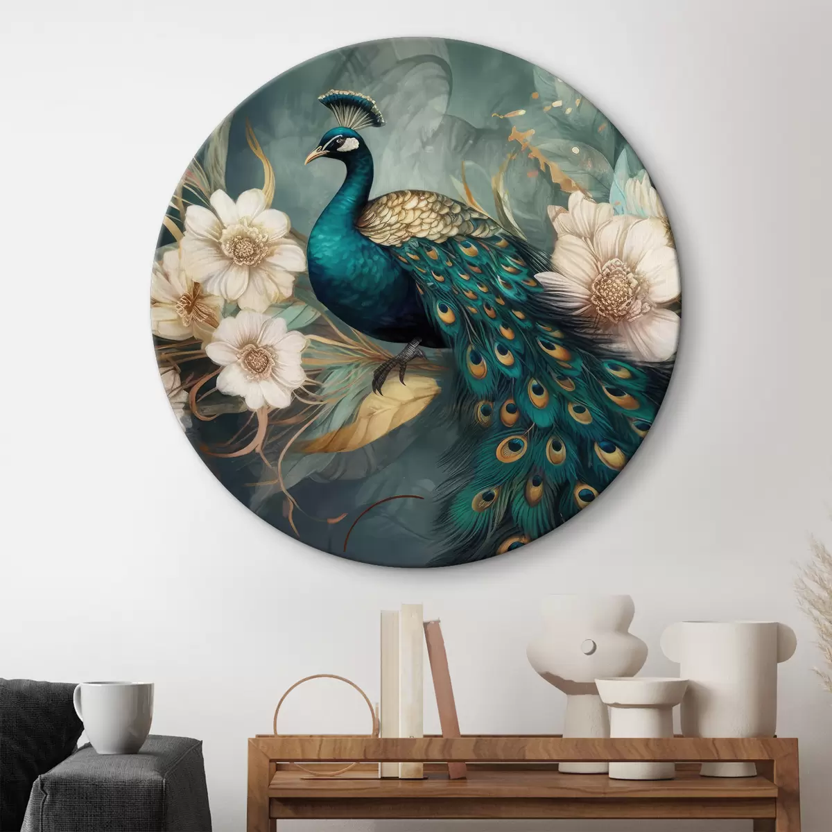 Cuadros redondos Un hermoso pavo real en una rama en flor r34866