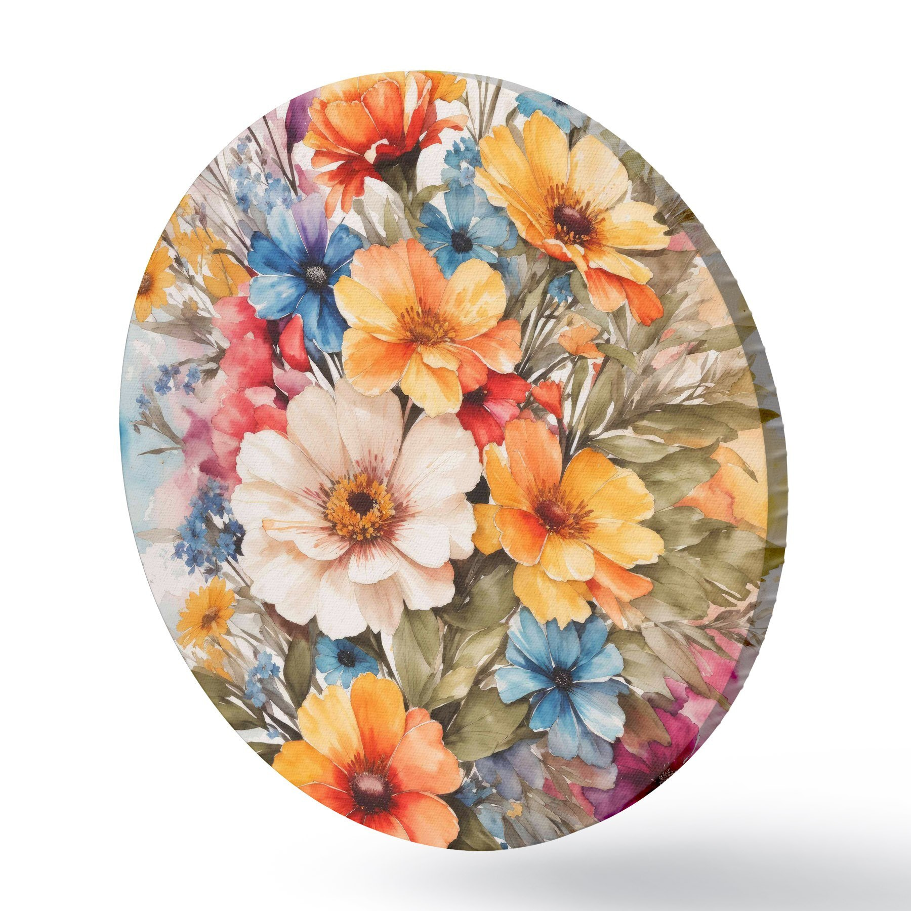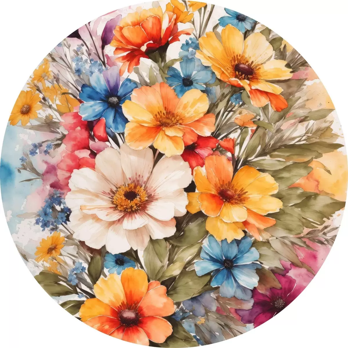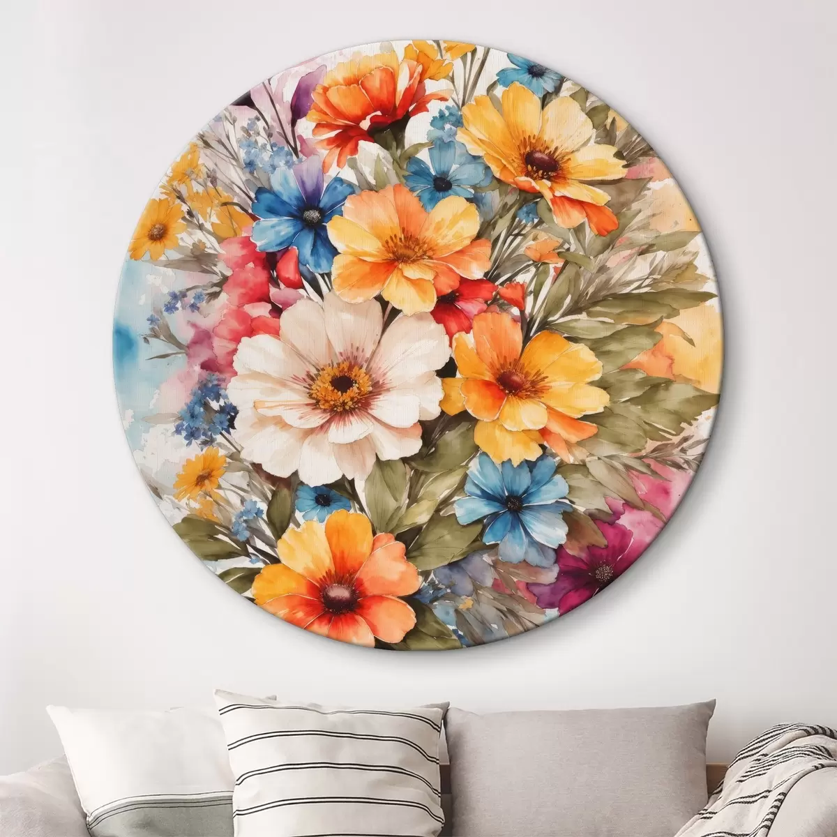 Cuadros redondos Ramo de acuarela de flores rosas, amarillas, azules y rojas r36121