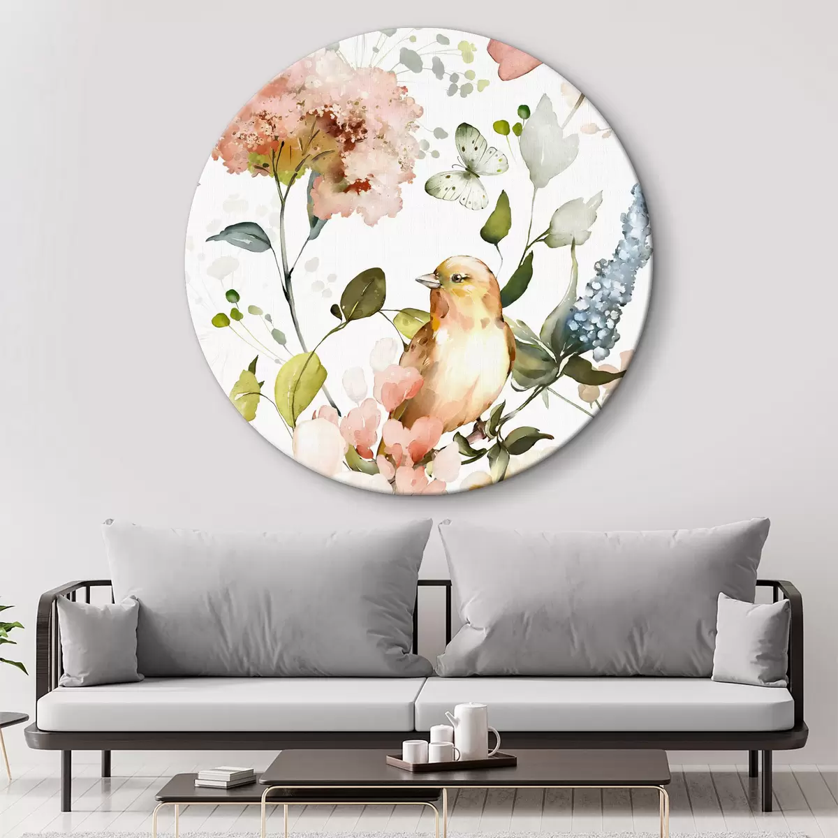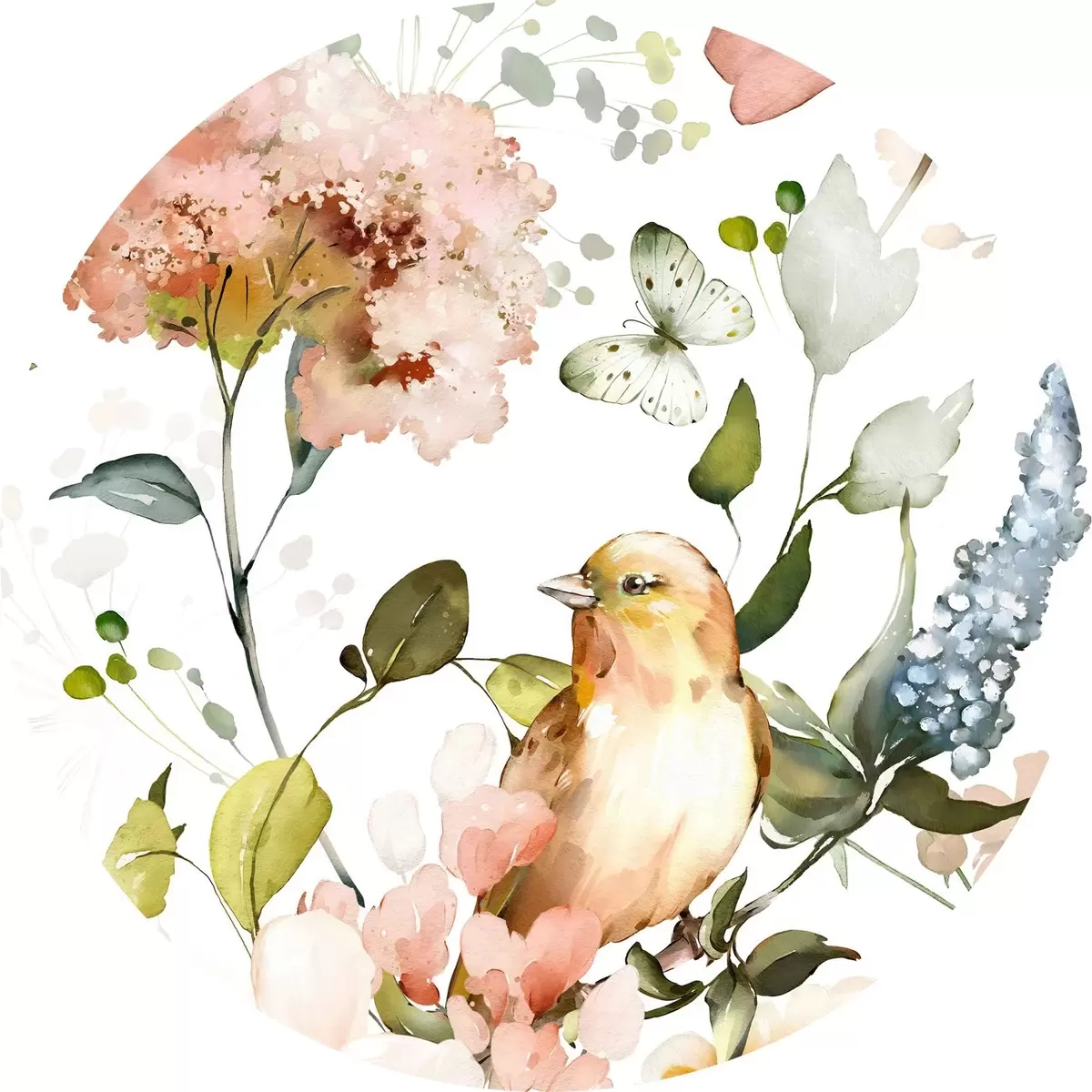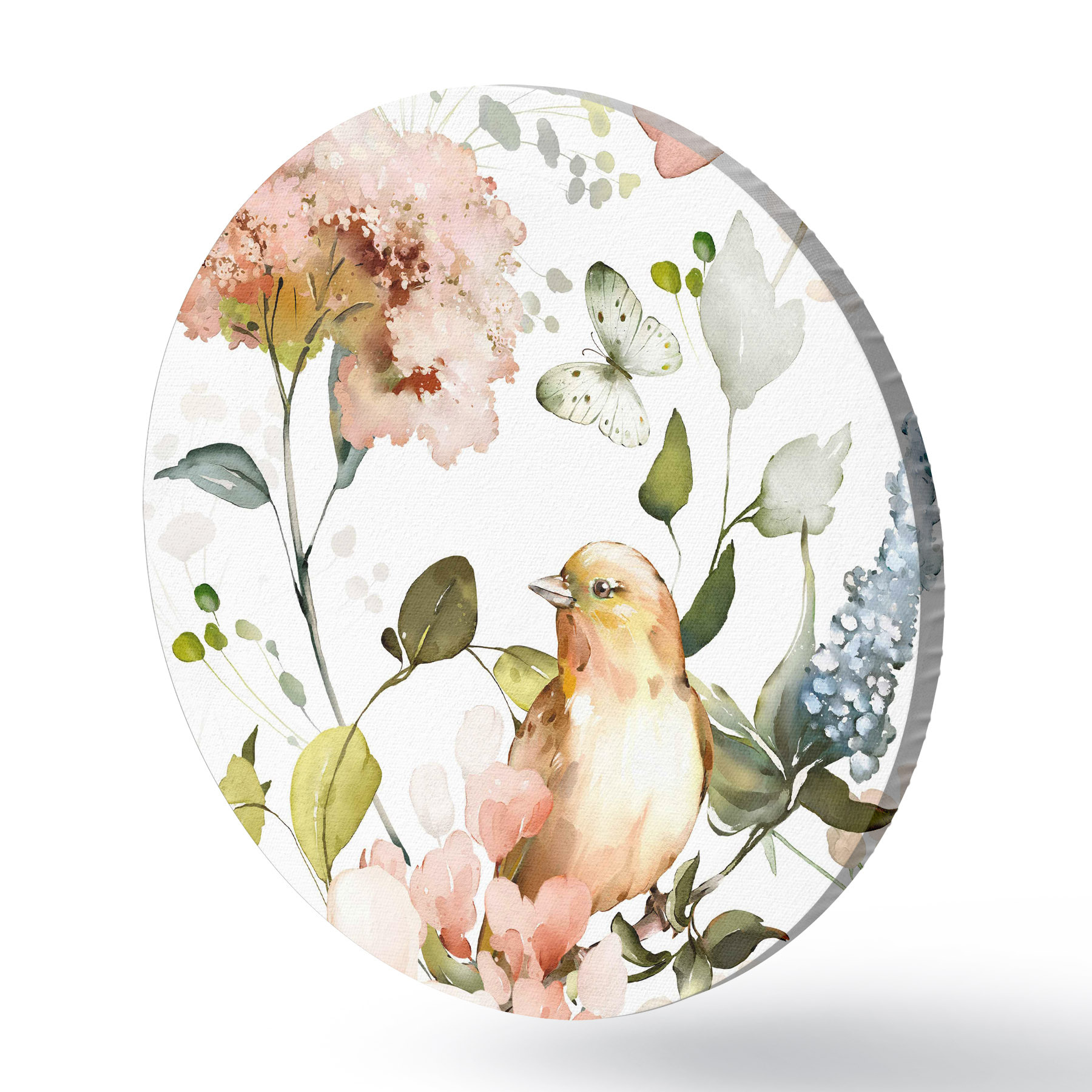 Cuadros redondos Acuarela con flores, pájaros y mariposas sobre fondo blanco r36153