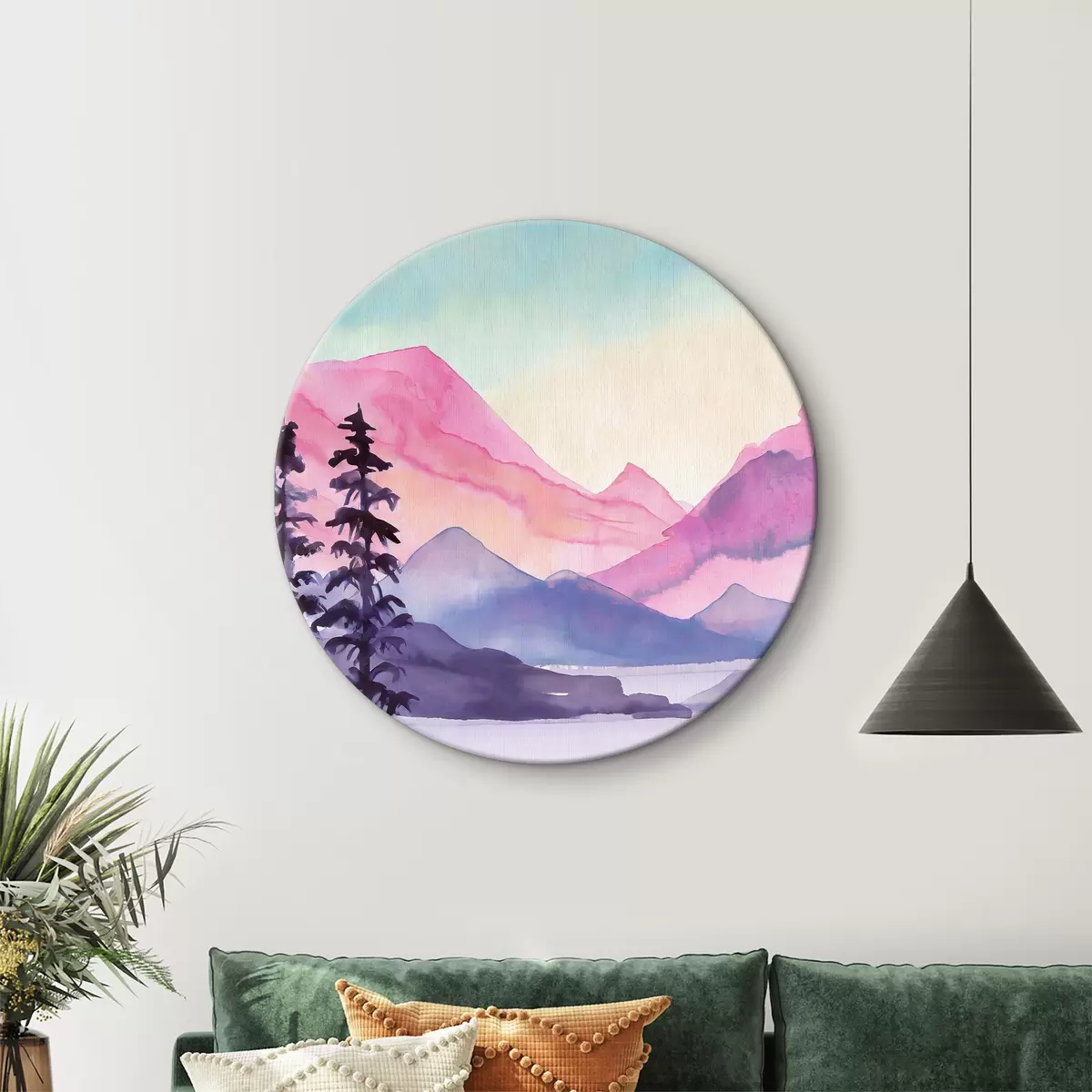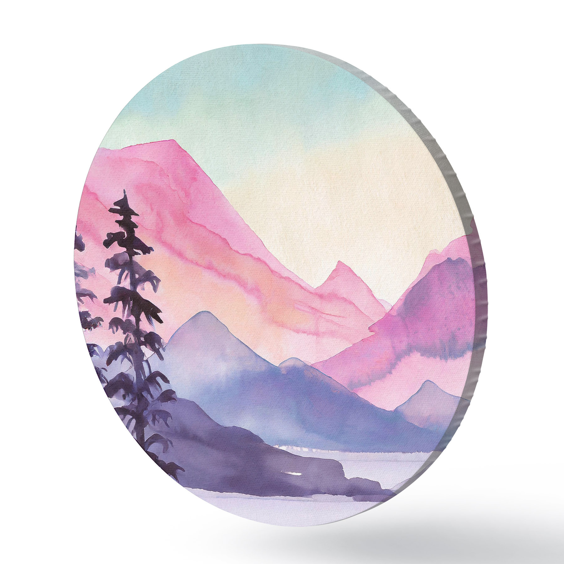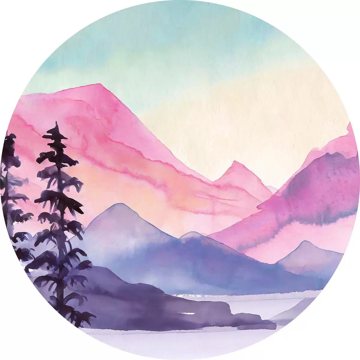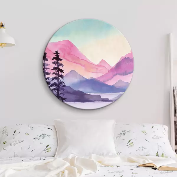 Cuadros redondos Paisaje de montaña en acuarela, amanecer, suaves colores púrpura, rosa y azul r36496