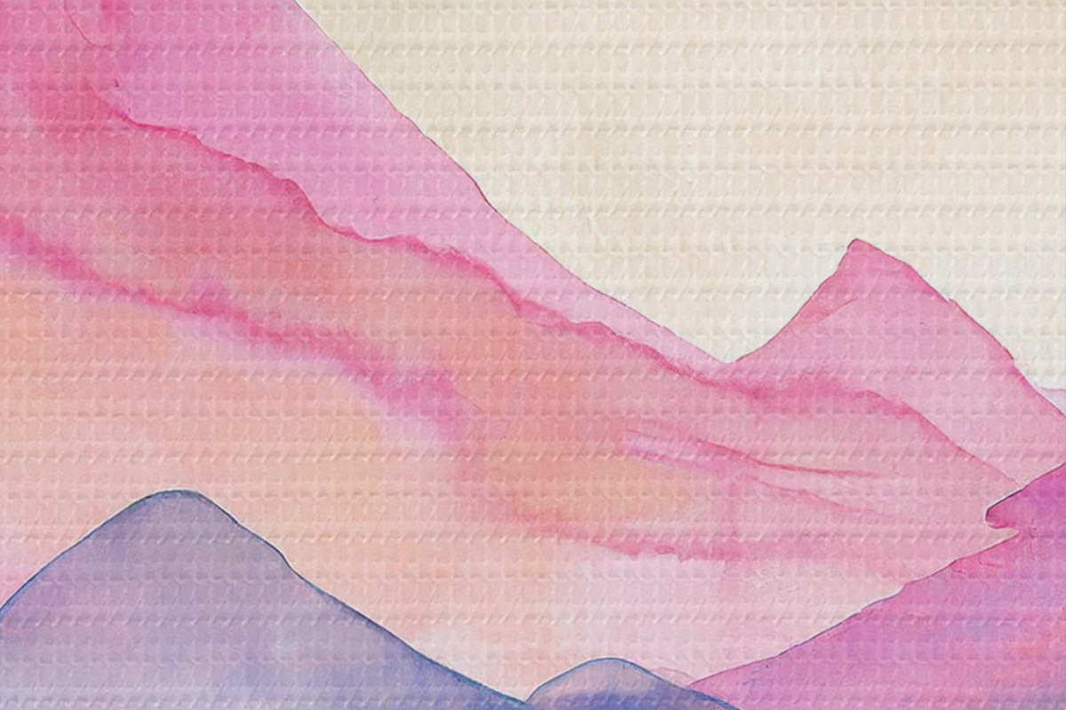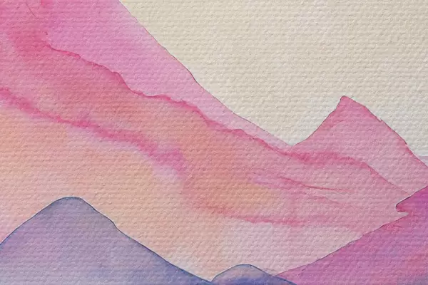 Foto Paisaje de montaña en acuarela, amanecer, suaves colores púrpura, rosa y azul Nr r36496