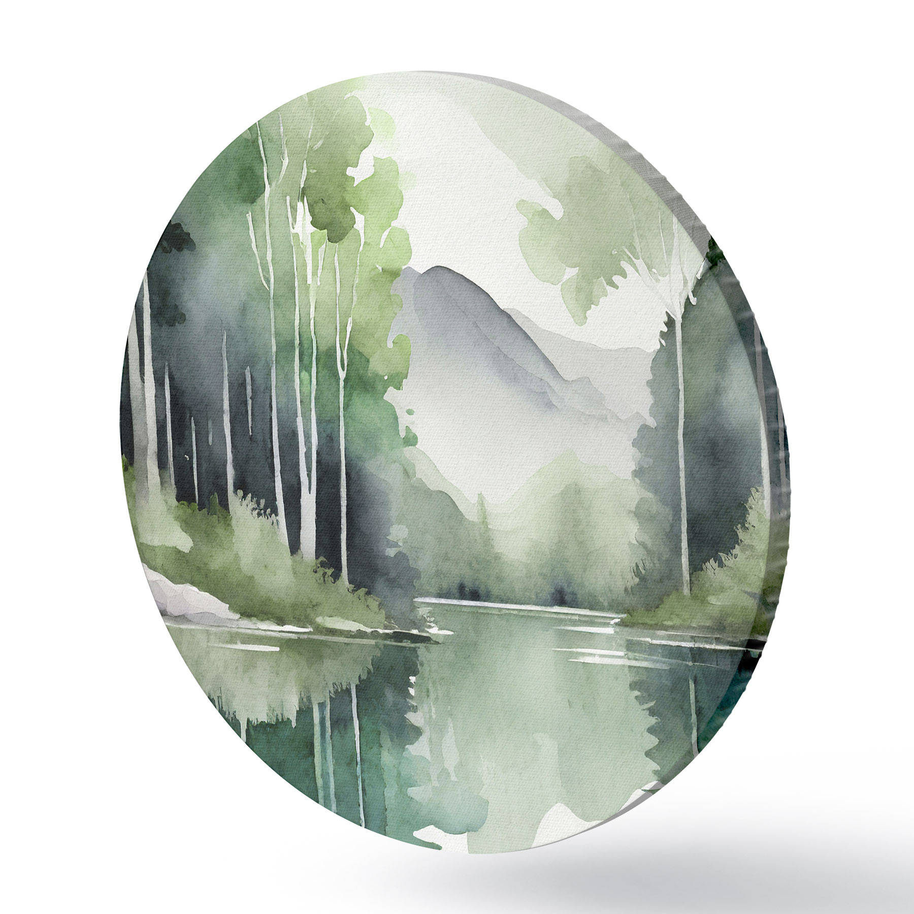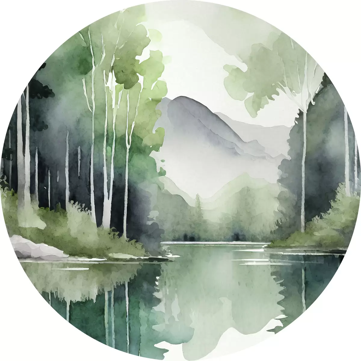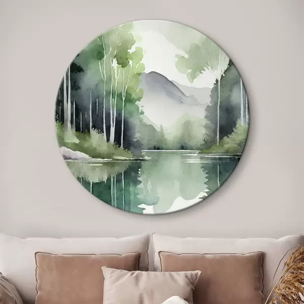 Cuadros redondos Acuarela paisaje de lago y bosque, primavera, verde natural colores suaves r36503