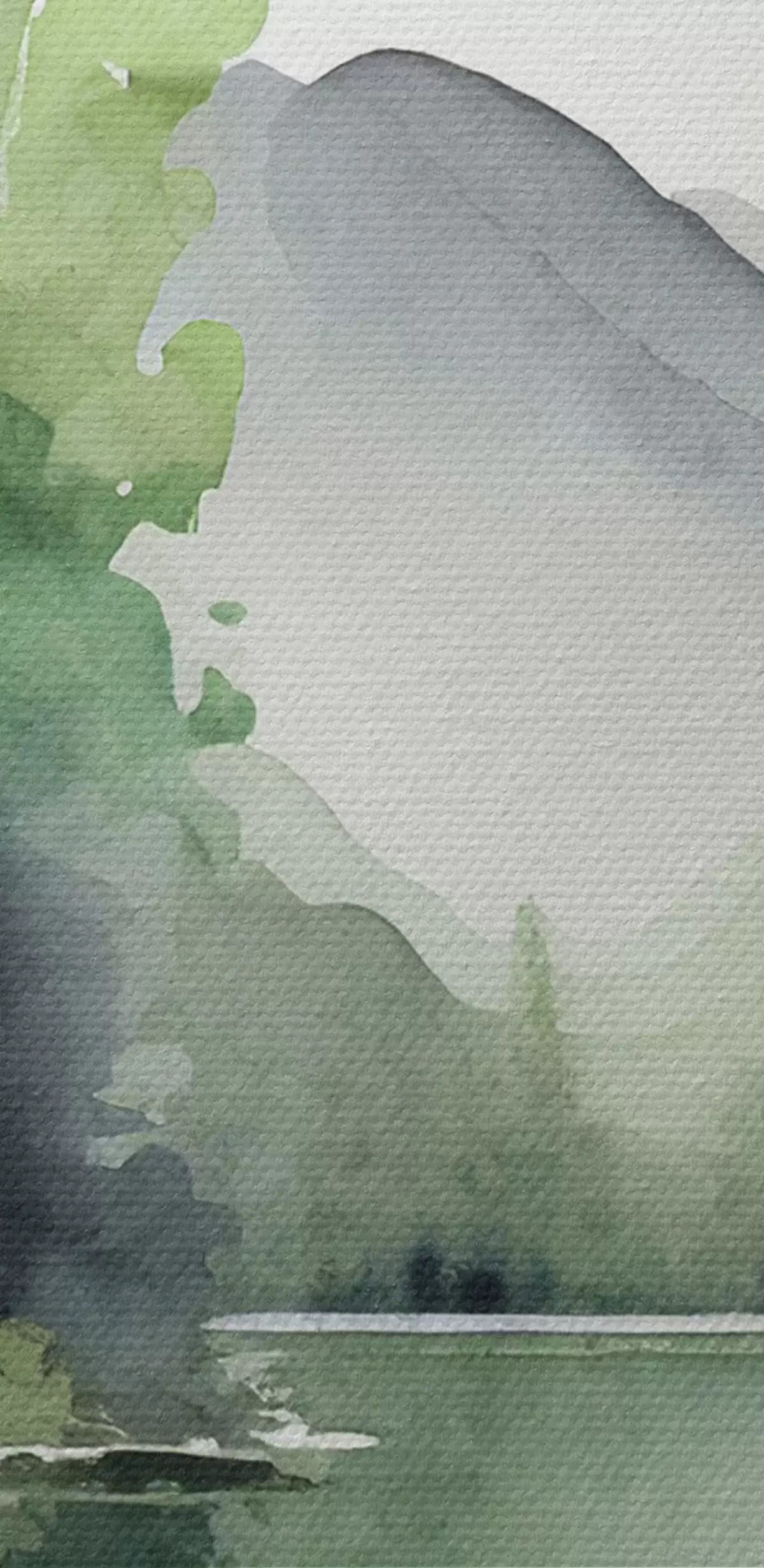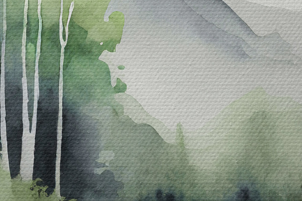 Foto Acuarela paisaje de lago y bosque, primavera, verde natural colores suaves Nr r36503