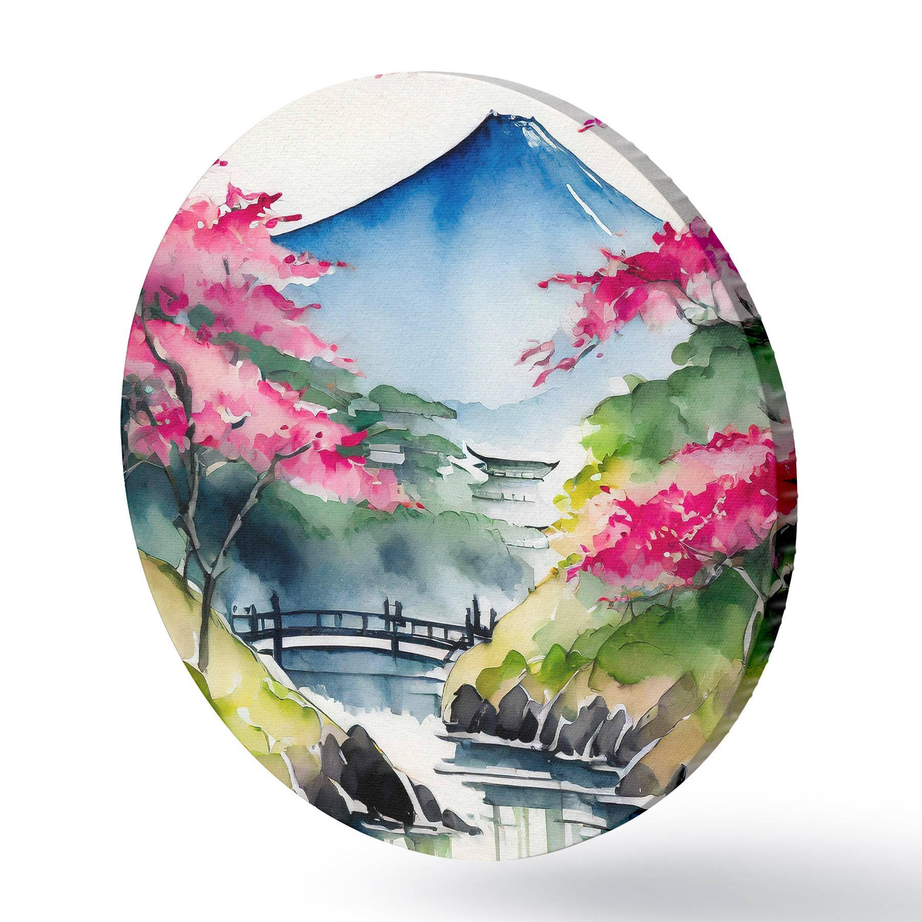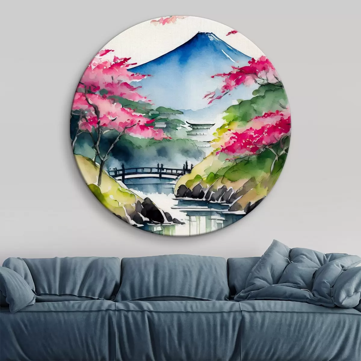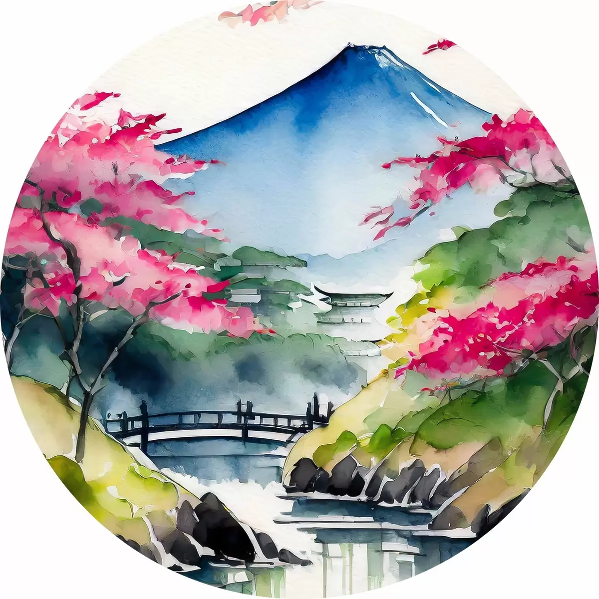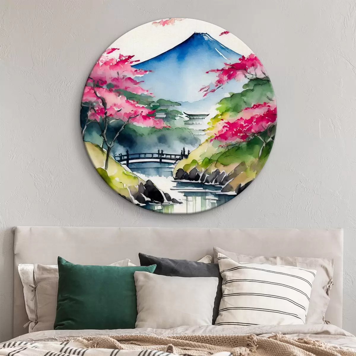 Cuadros redondos Acuarela Japón, cerezo, montañas r36691