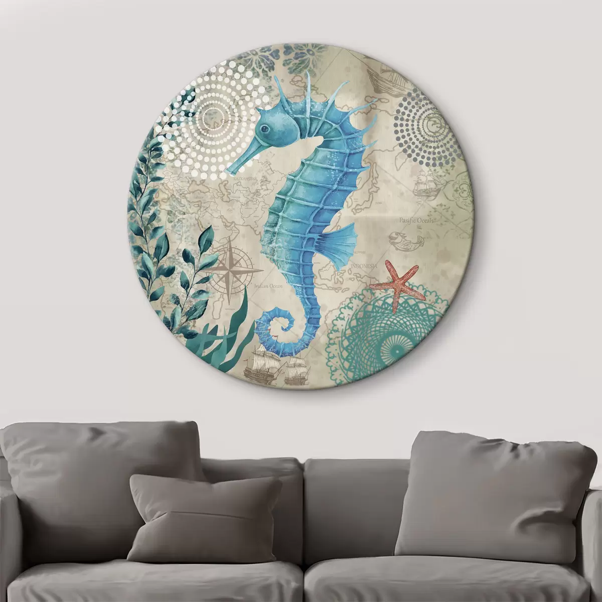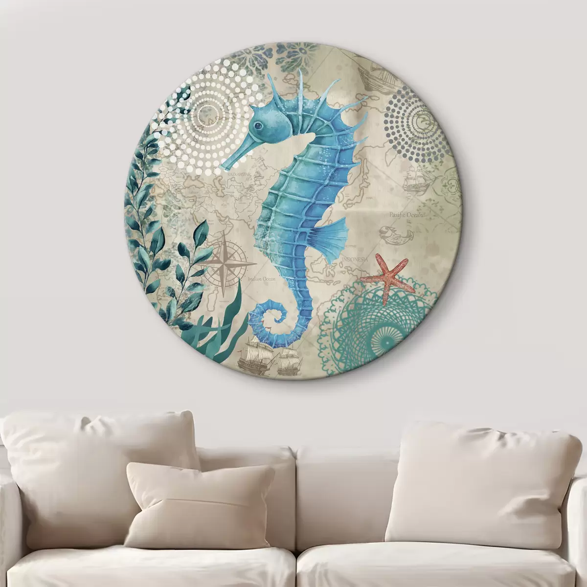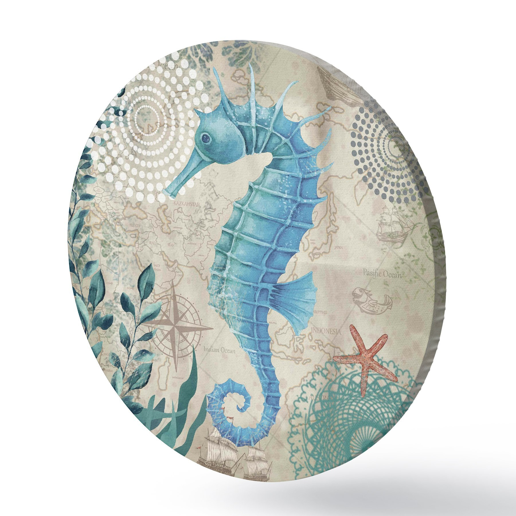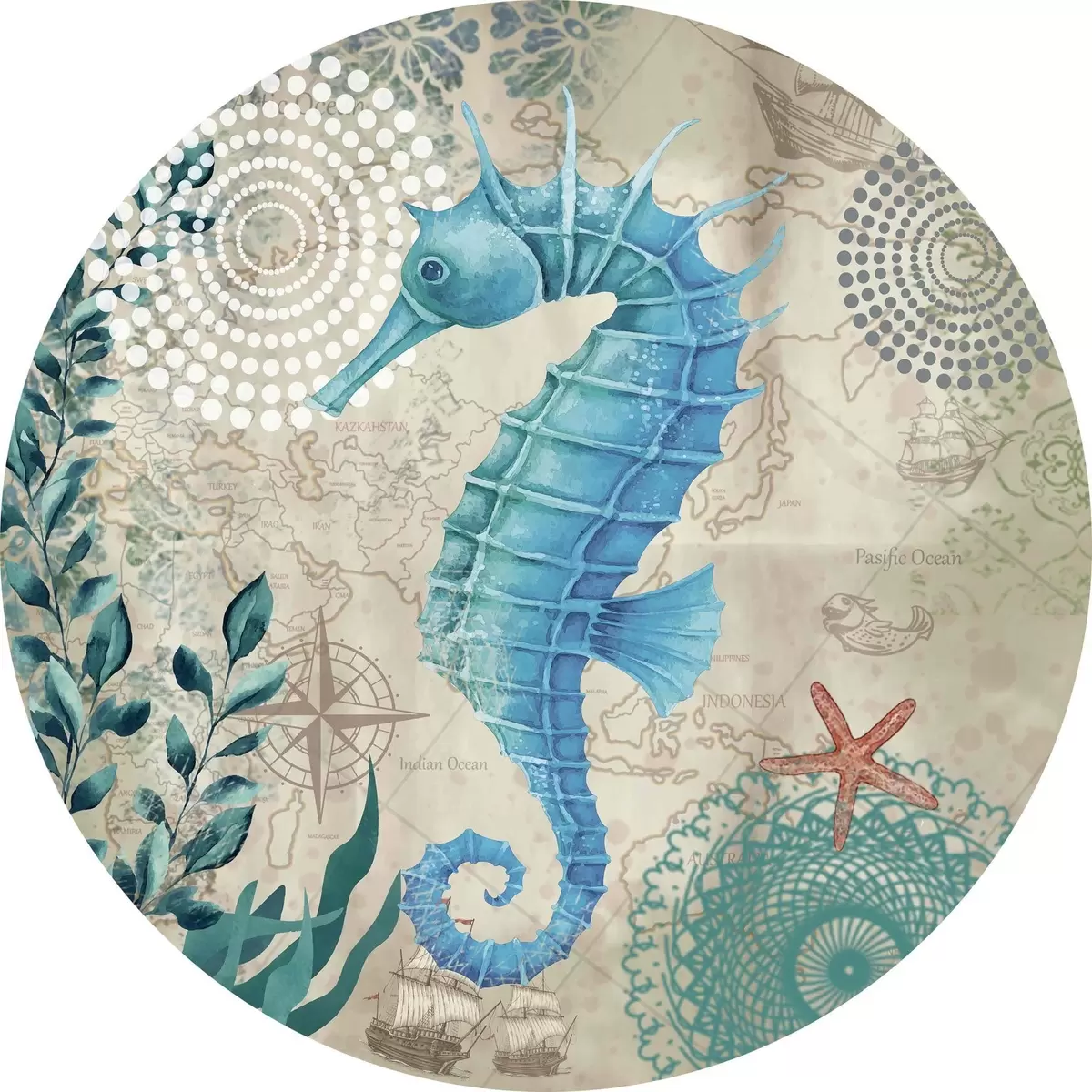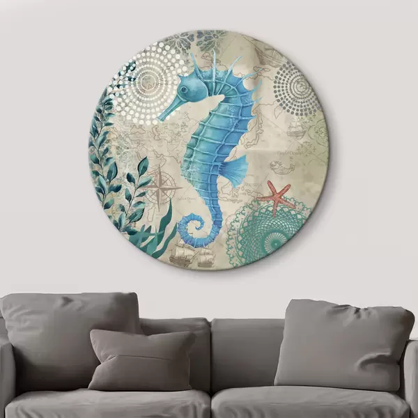 Cuadros redondos Caballito de mar y algas en el mapa r37152