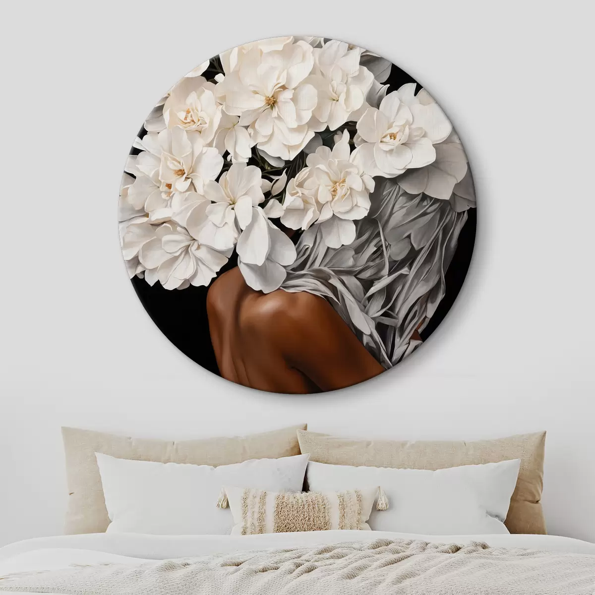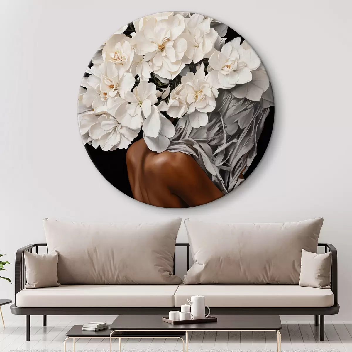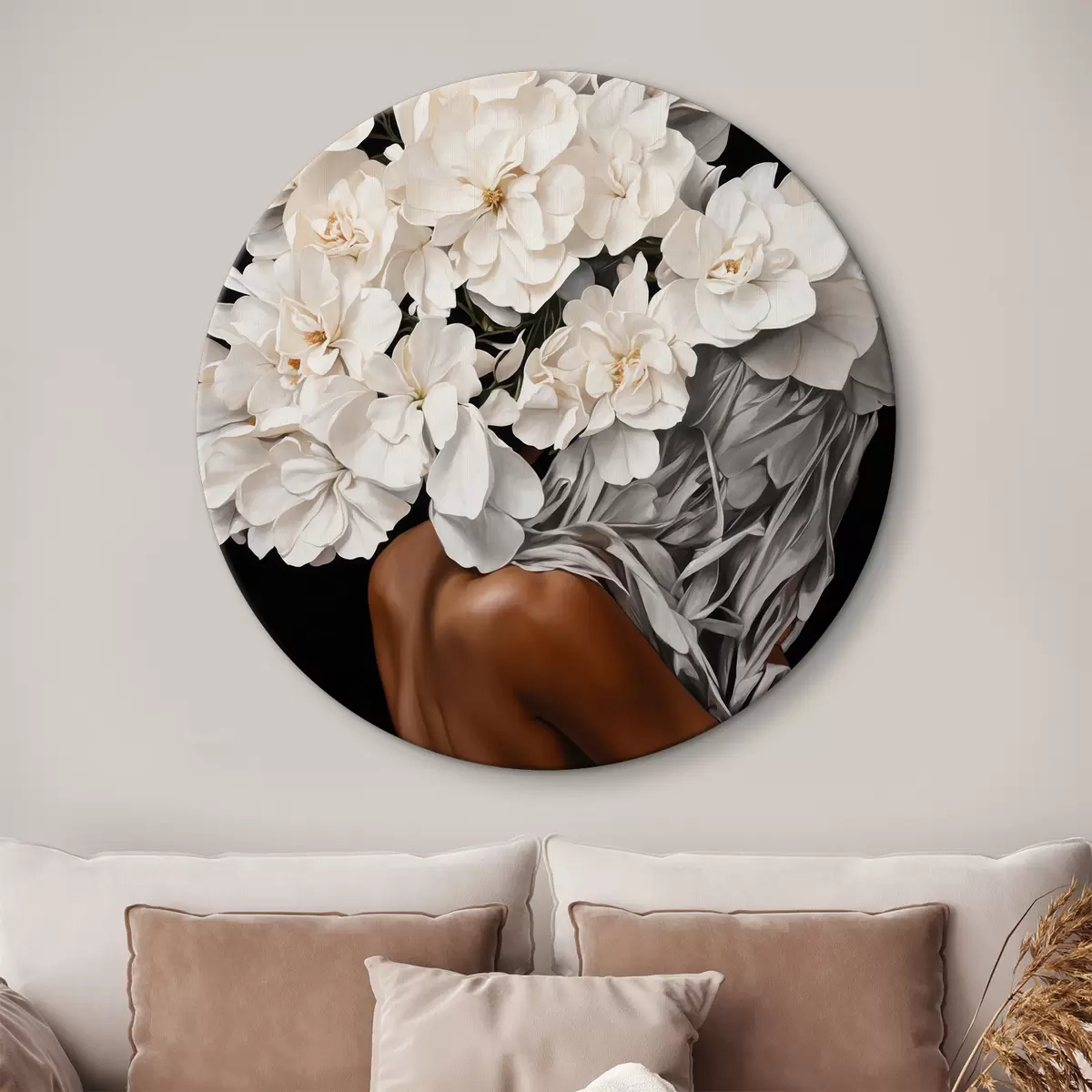Cuadros redondos Mujer con flores blancas sobre fondo negro r37163