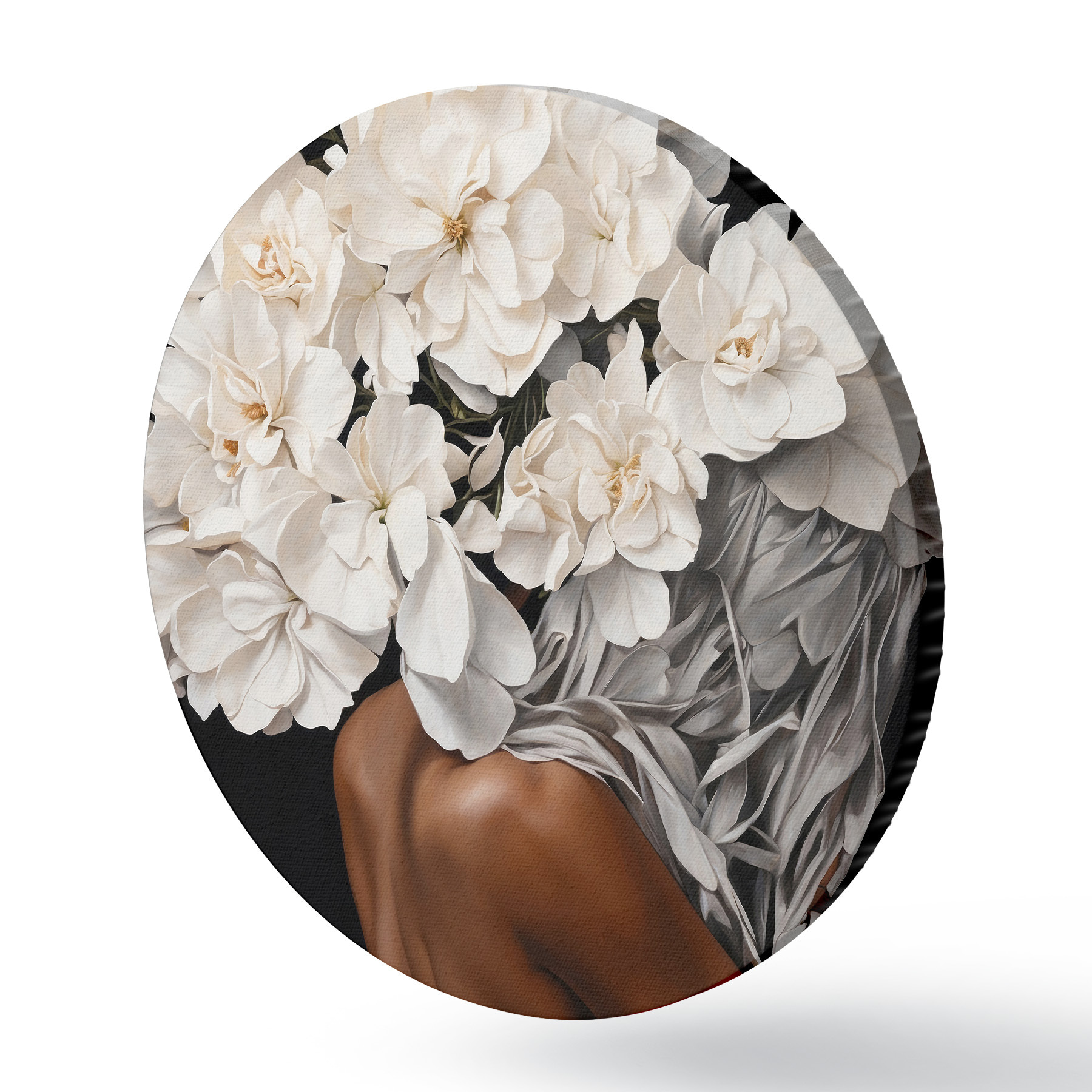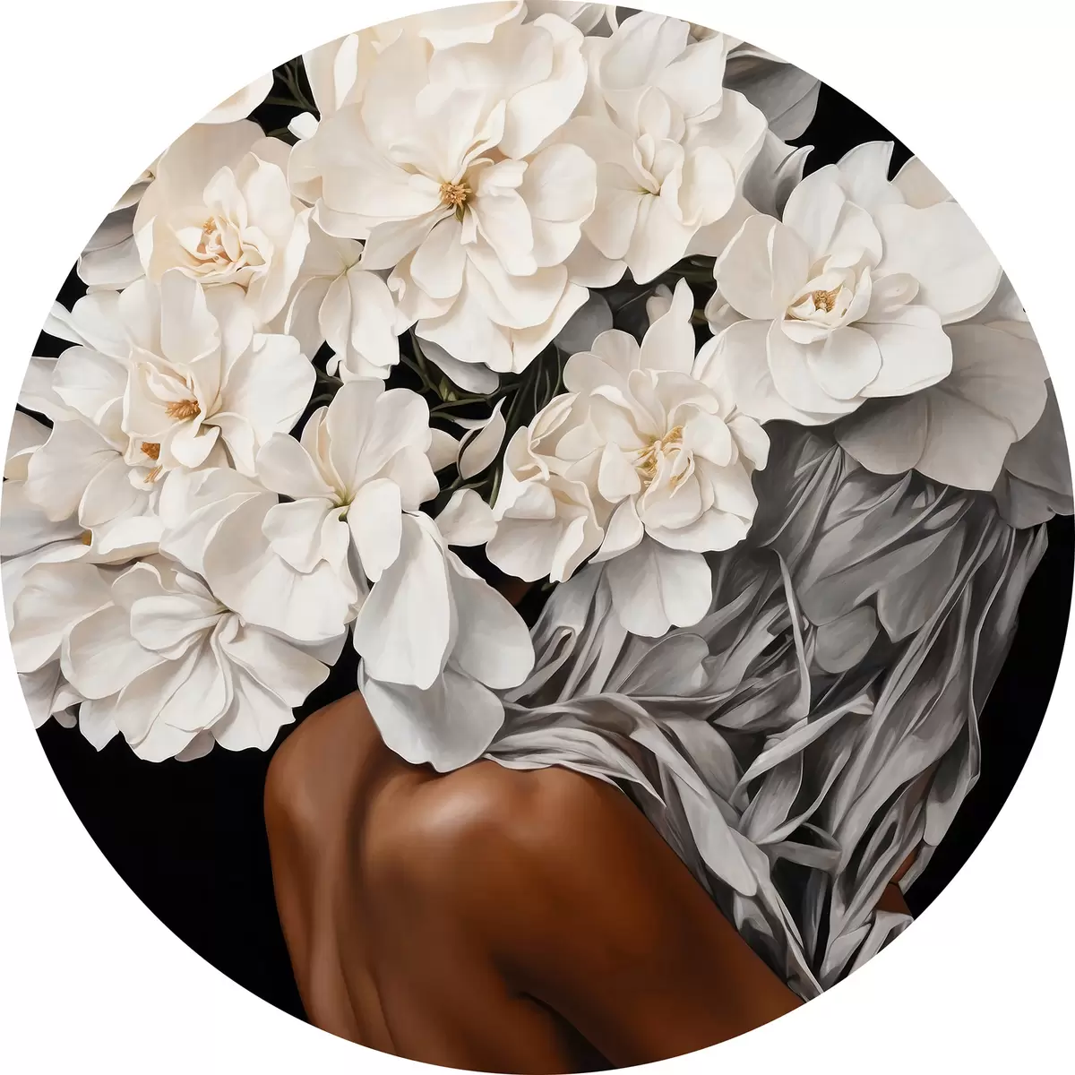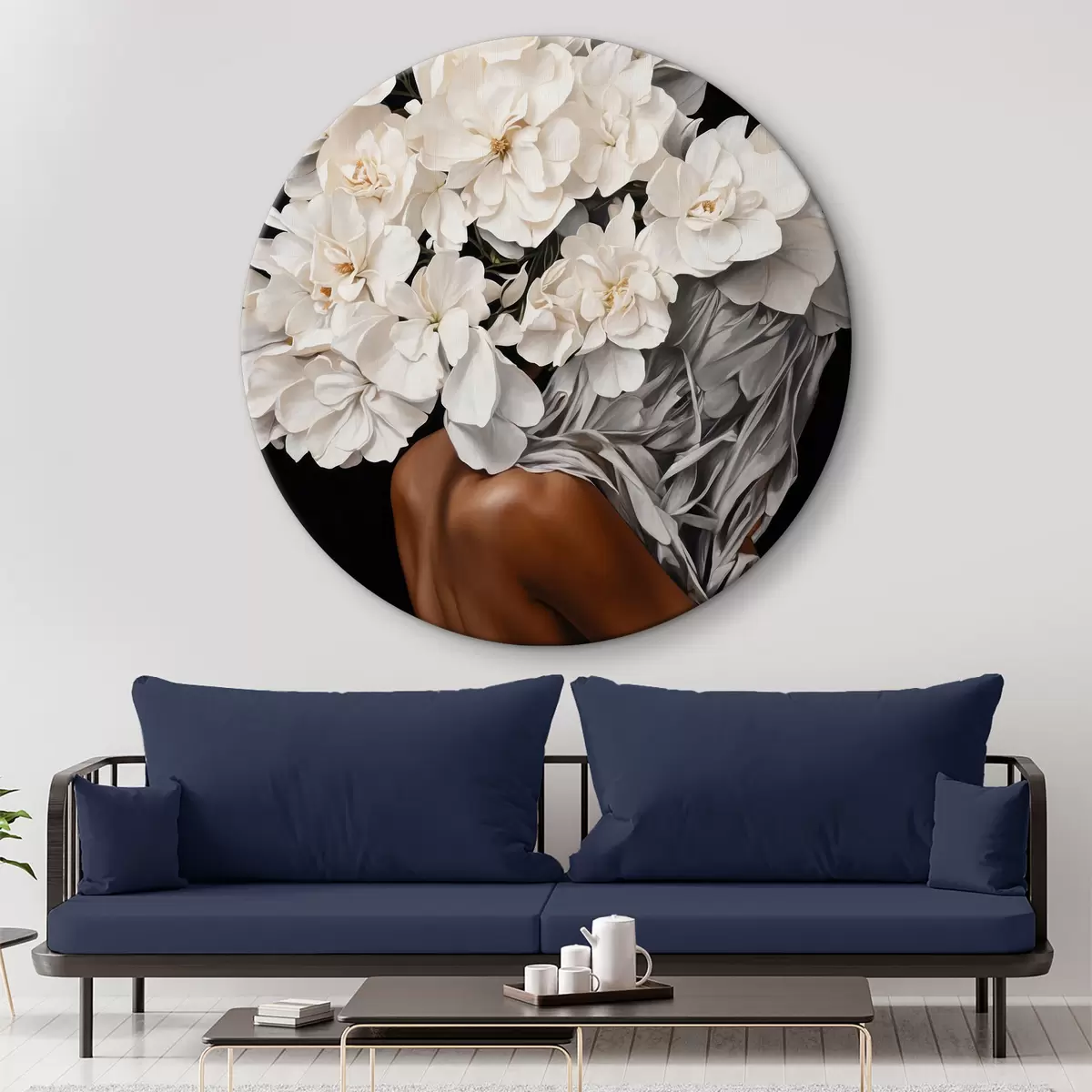 Cuadros redondos Mujer con flores blancas sobre fondo negro r37163