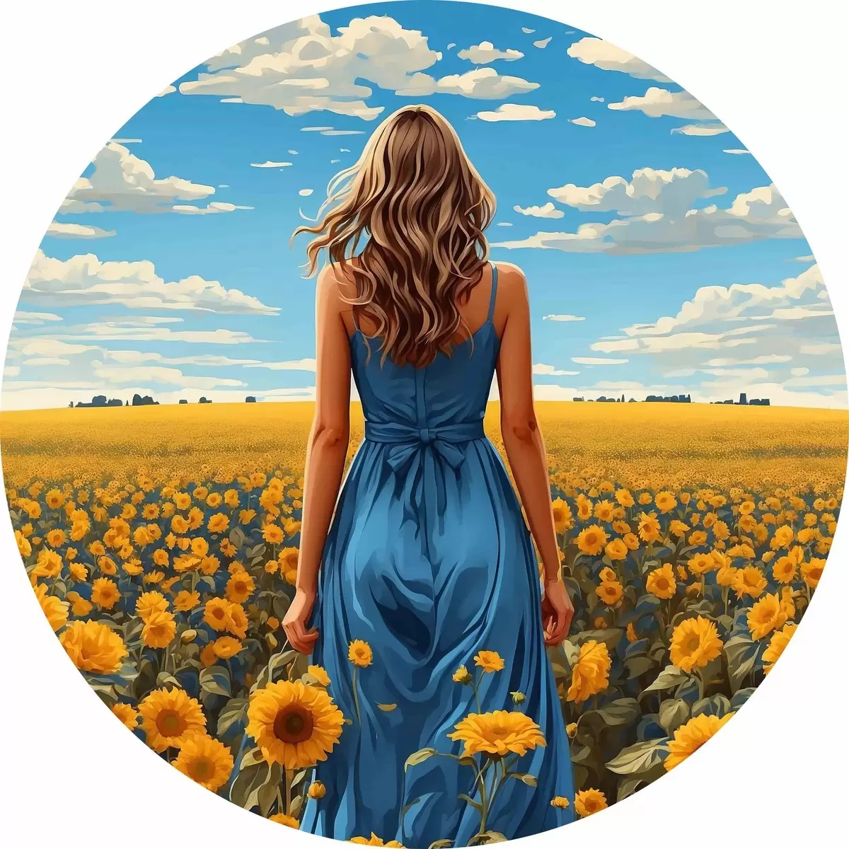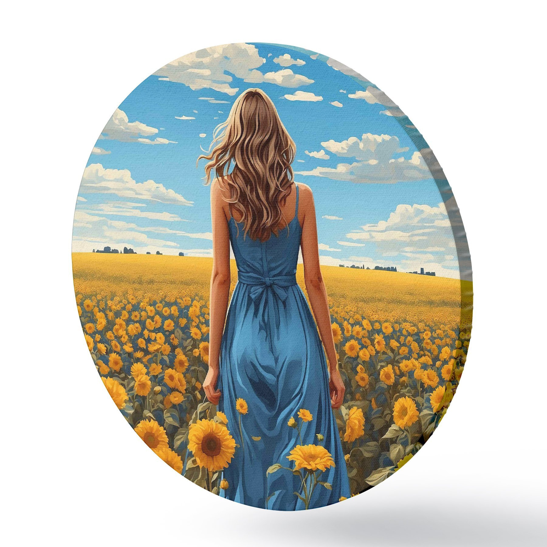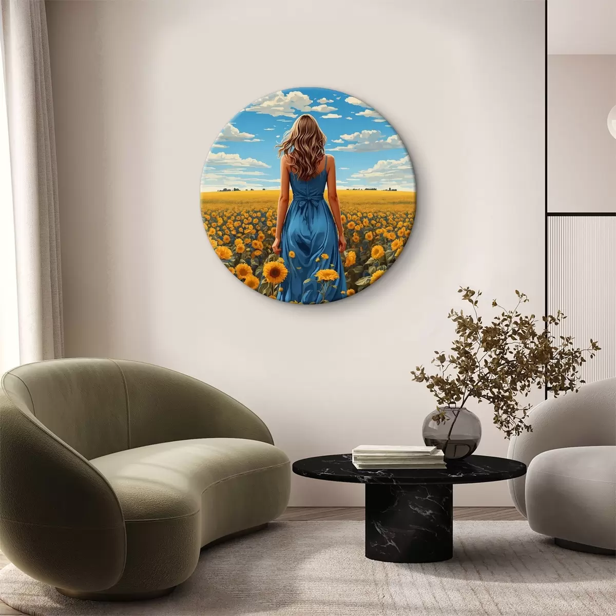 Cuadros redondos Mujer con vestido azul en un campo de girasoles r37164
