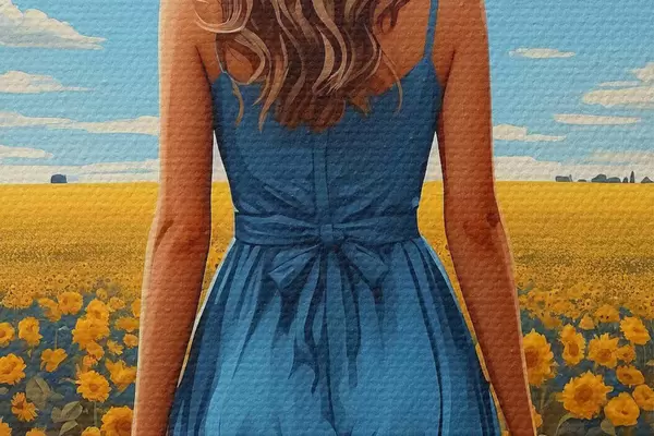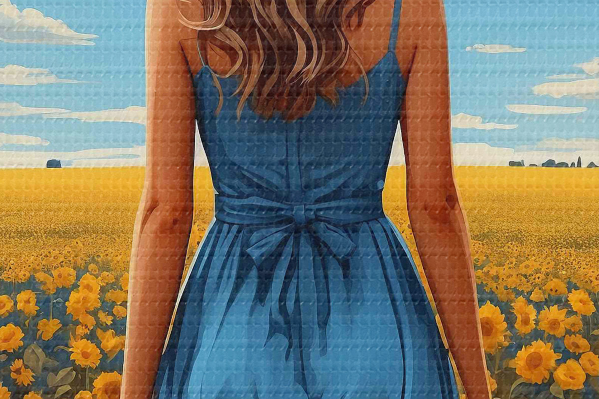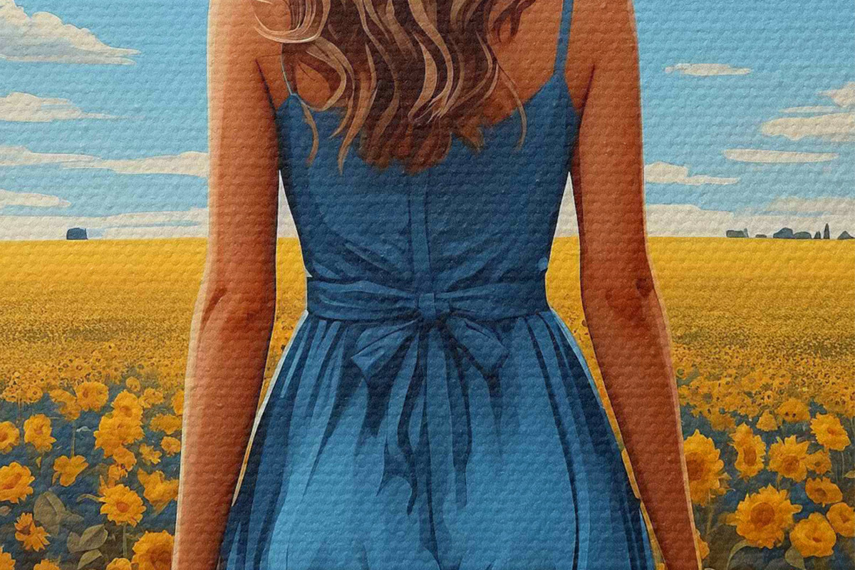 Foto Mujer con vestido azul en un campo de girasoles Nr r37164