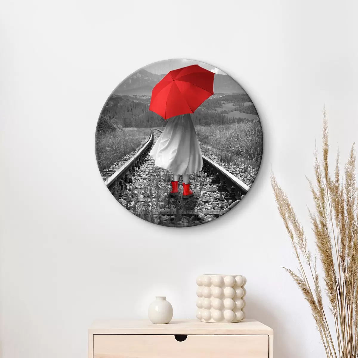 Cuadros redondos Persona con un paraguas rojo en las vías del tren r37301