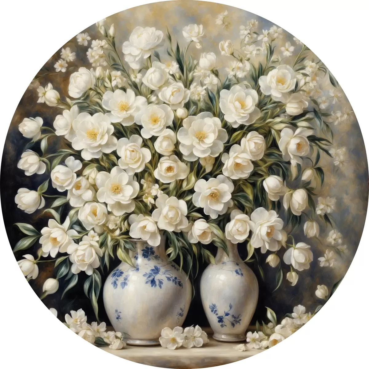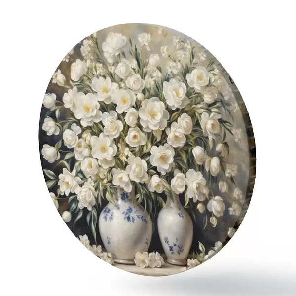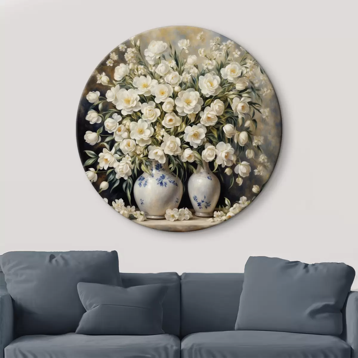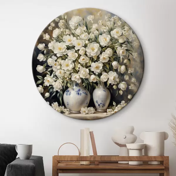 Cuadros redondos Jarrón blanco con un gran ramo de flores blancas r37440