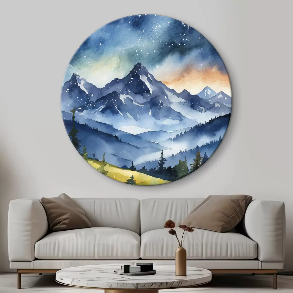 Cuadros redondos Acuarela paisaje de montaña, bosque, cielo nocturno estrellado, colores del atardecer r37946