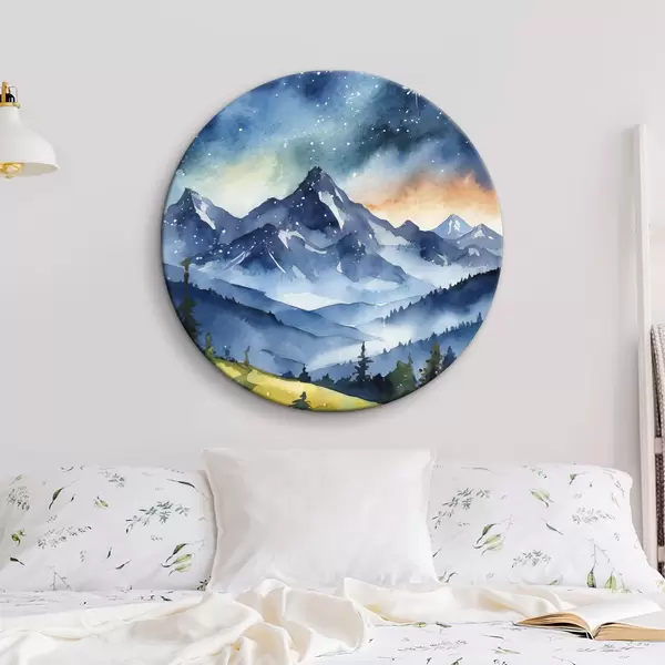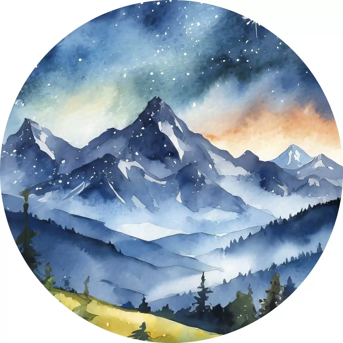 Cuadros redondos Acuarela paisaje de montaña, bosque, cielo nocturno estrellado, colores del atardecer r37946