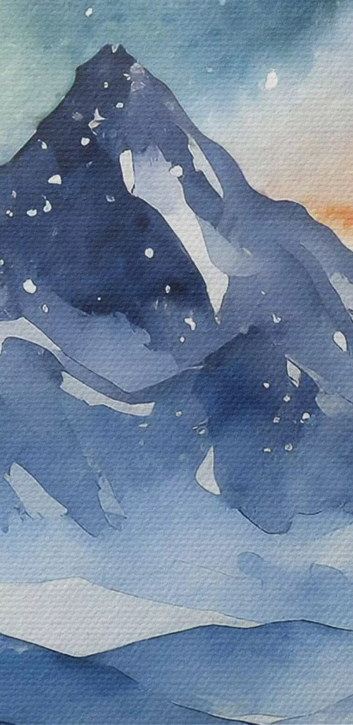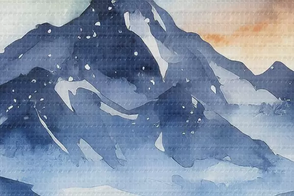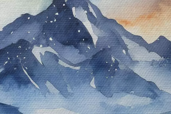 Foto Acuarela paisaje de montaña, bosque, cielo nocturno estrellado, colores del atardecer Nr r37946