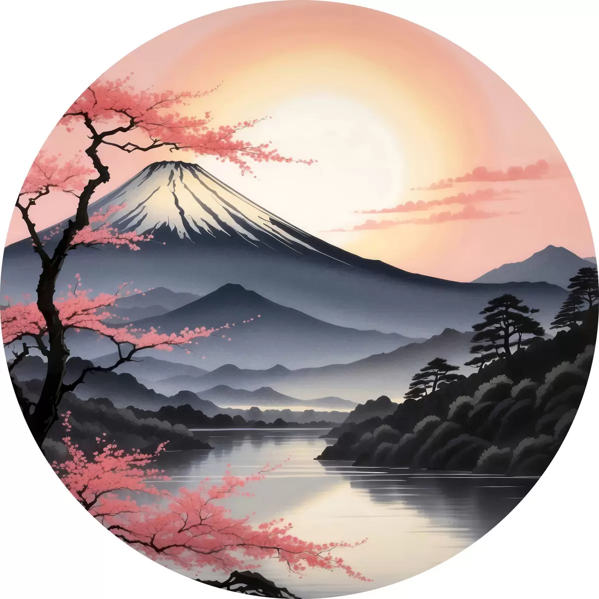 Cuadros redondos Montaña con lago y árboles r38100