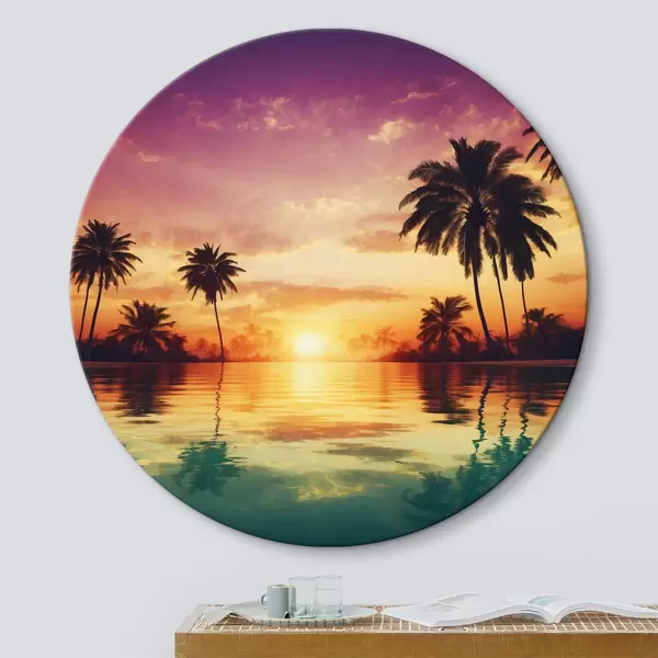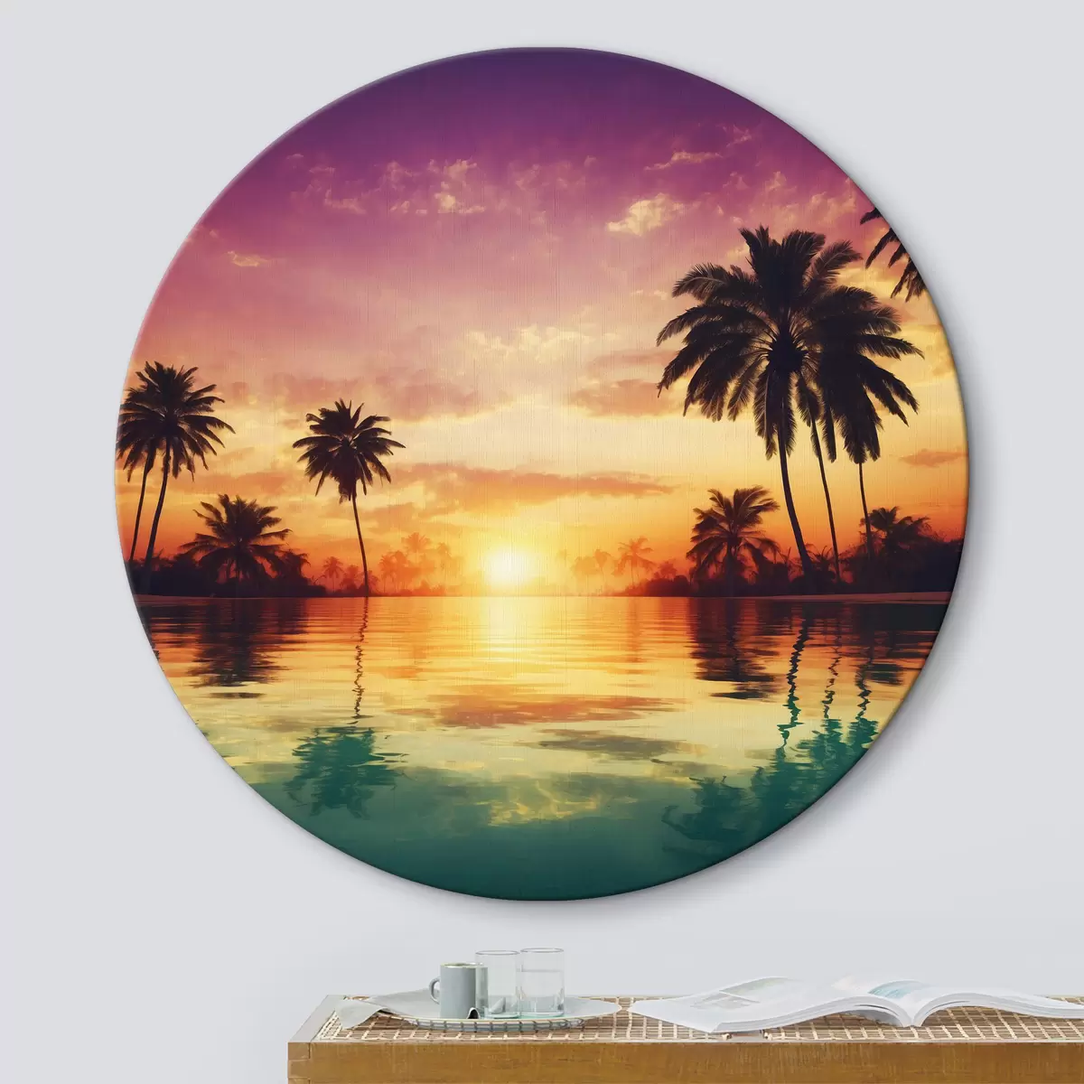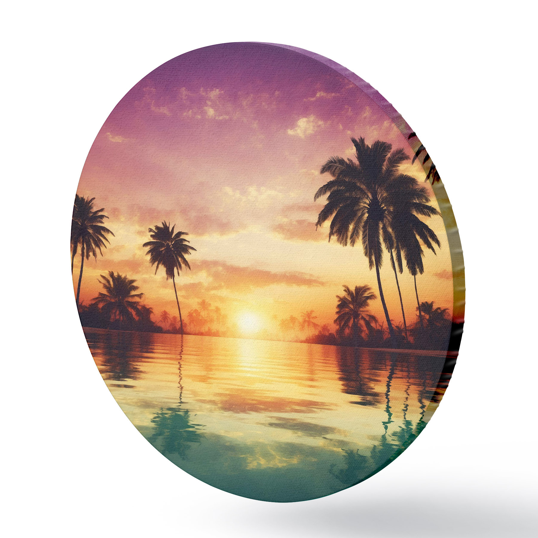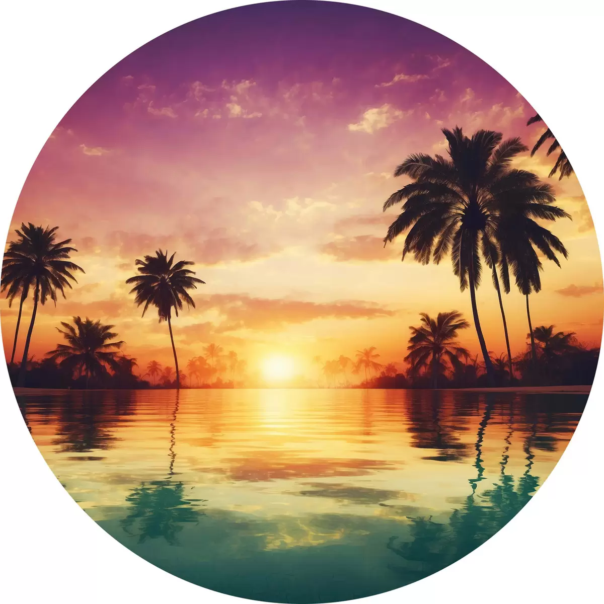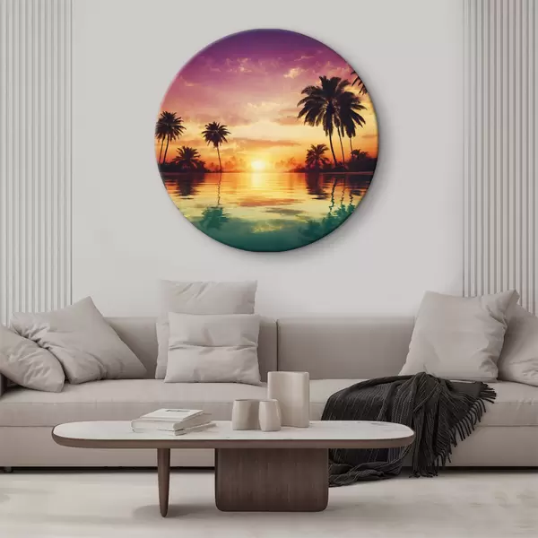 Cuadros redondos Puesta de sol sobre un embalse con palmeras r38183