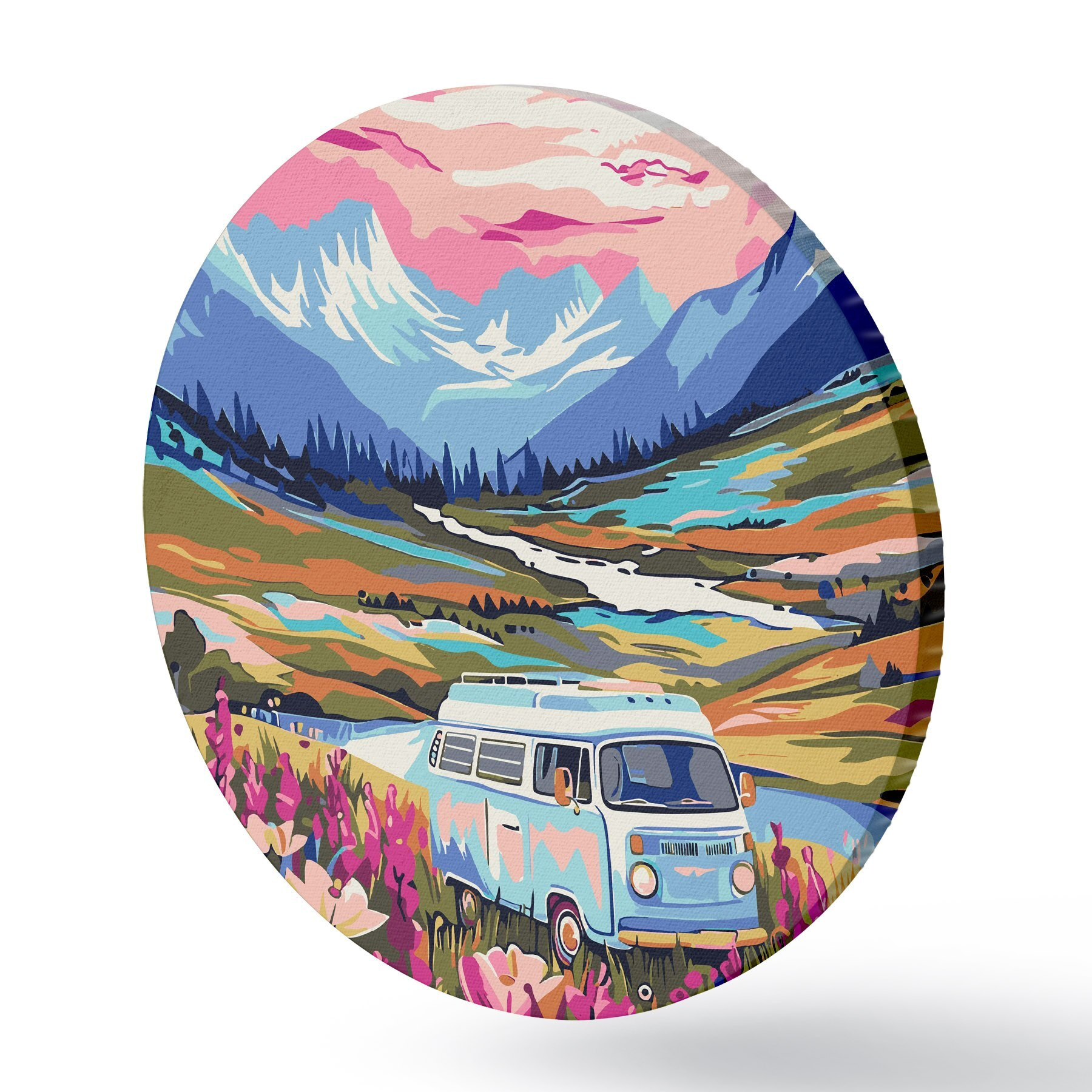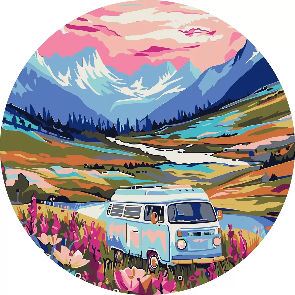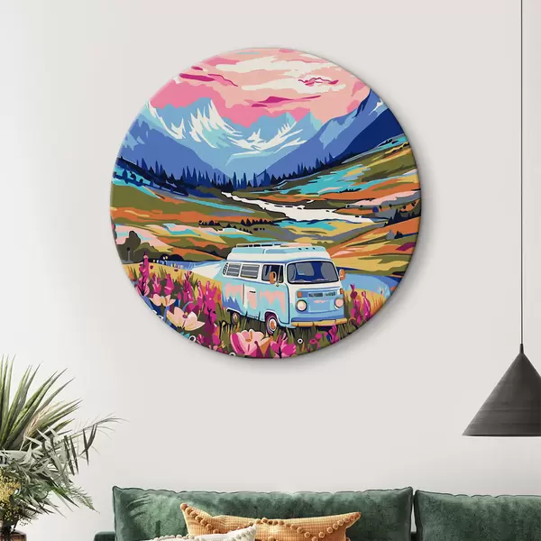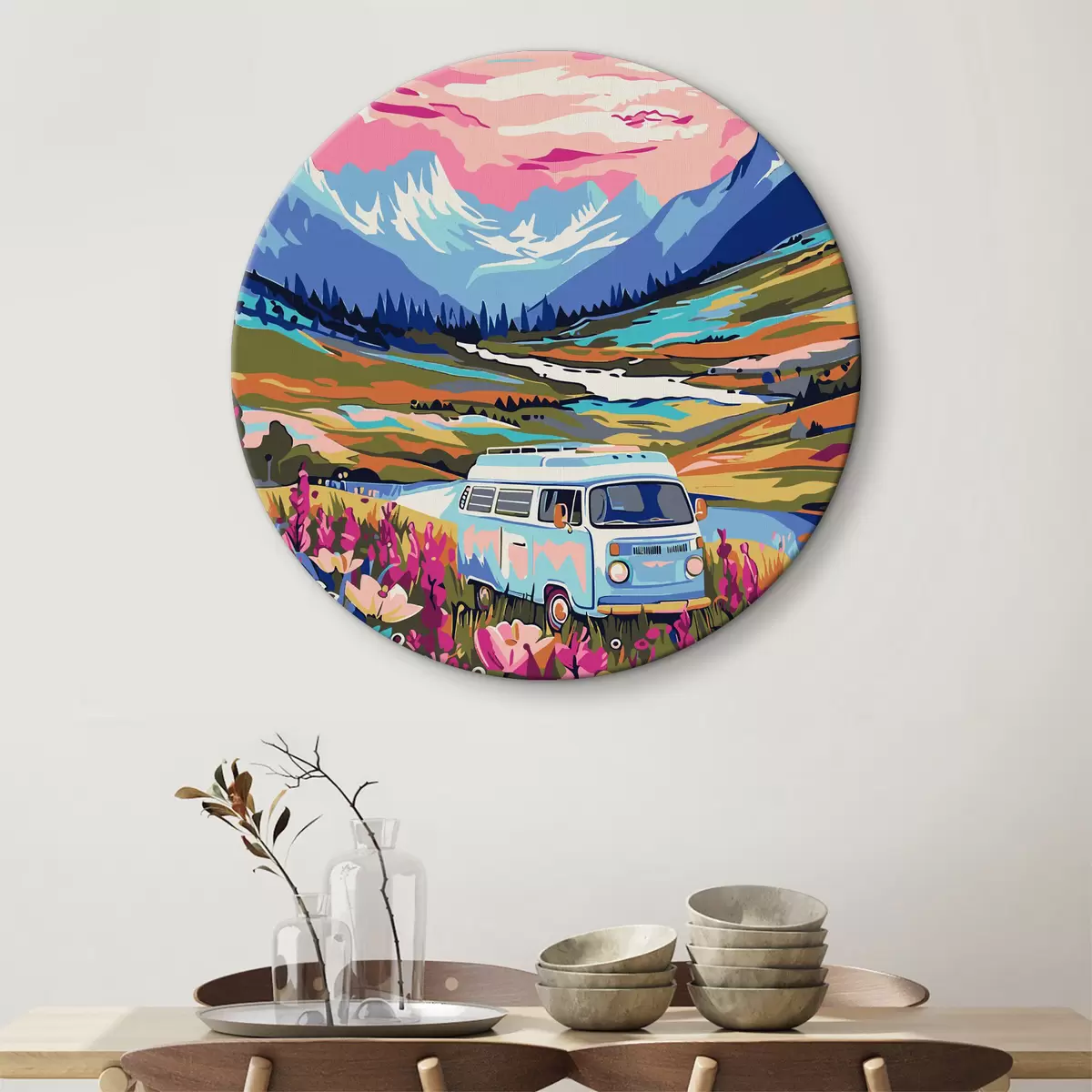 Cuadros redondos Una furgoneta atraviesa un campo de flores r38260