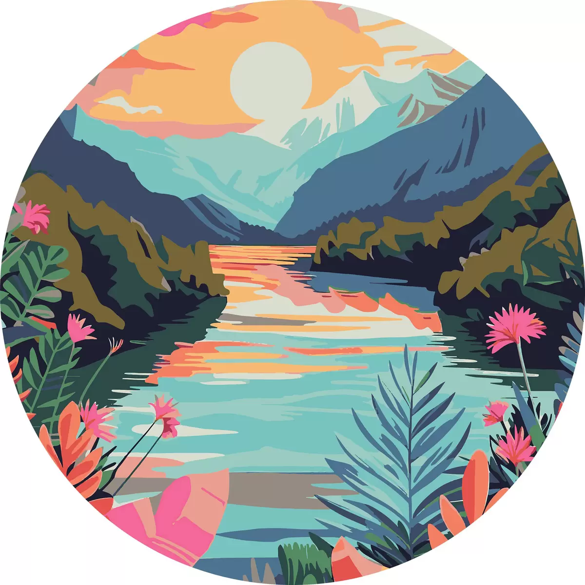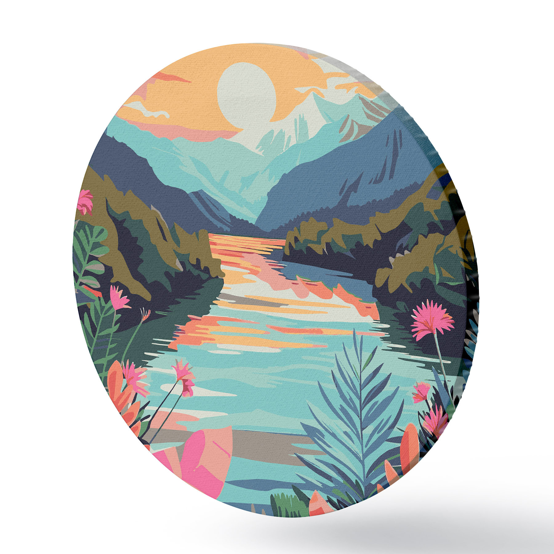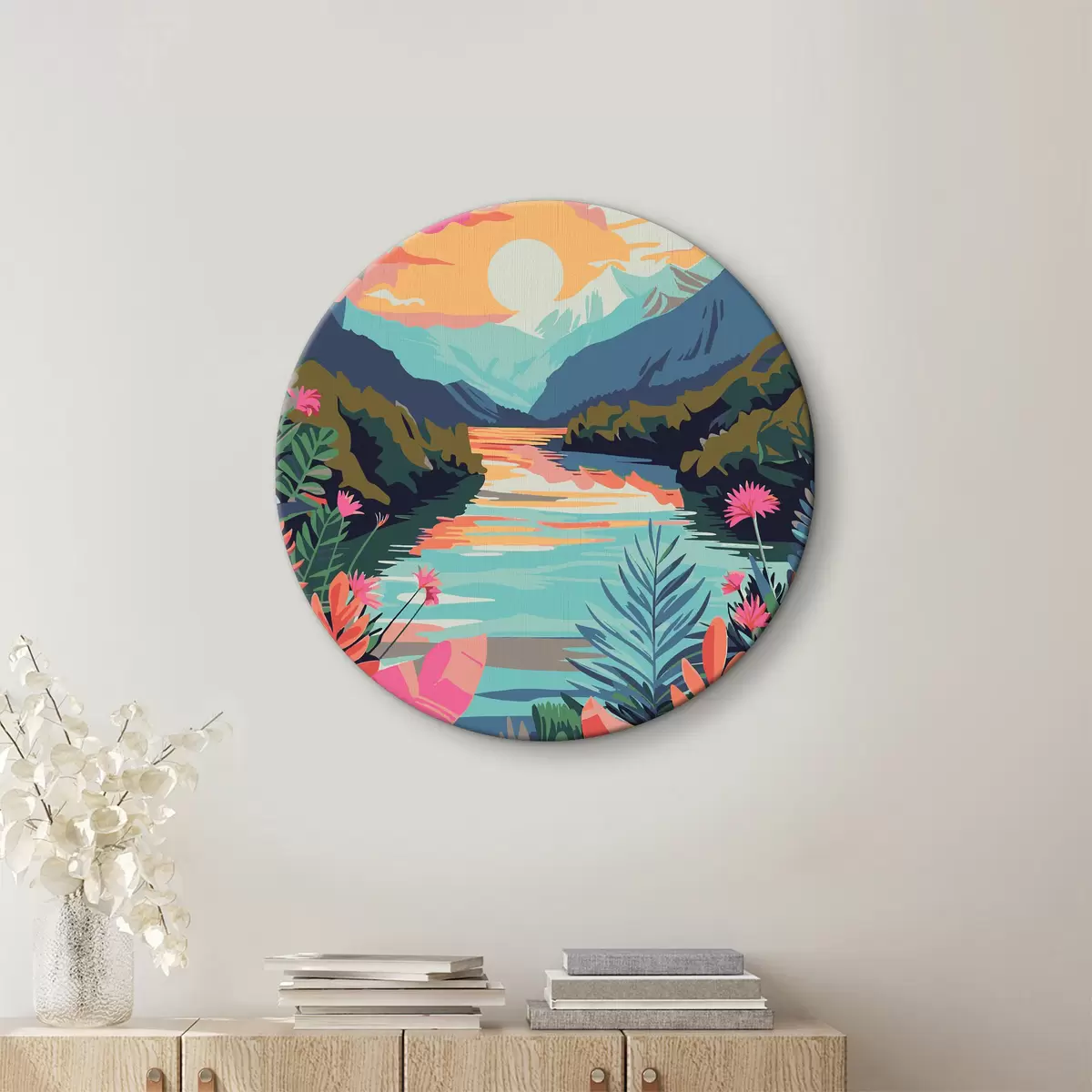 Cuadros redondos Río con flores y montañas al fondo r38266