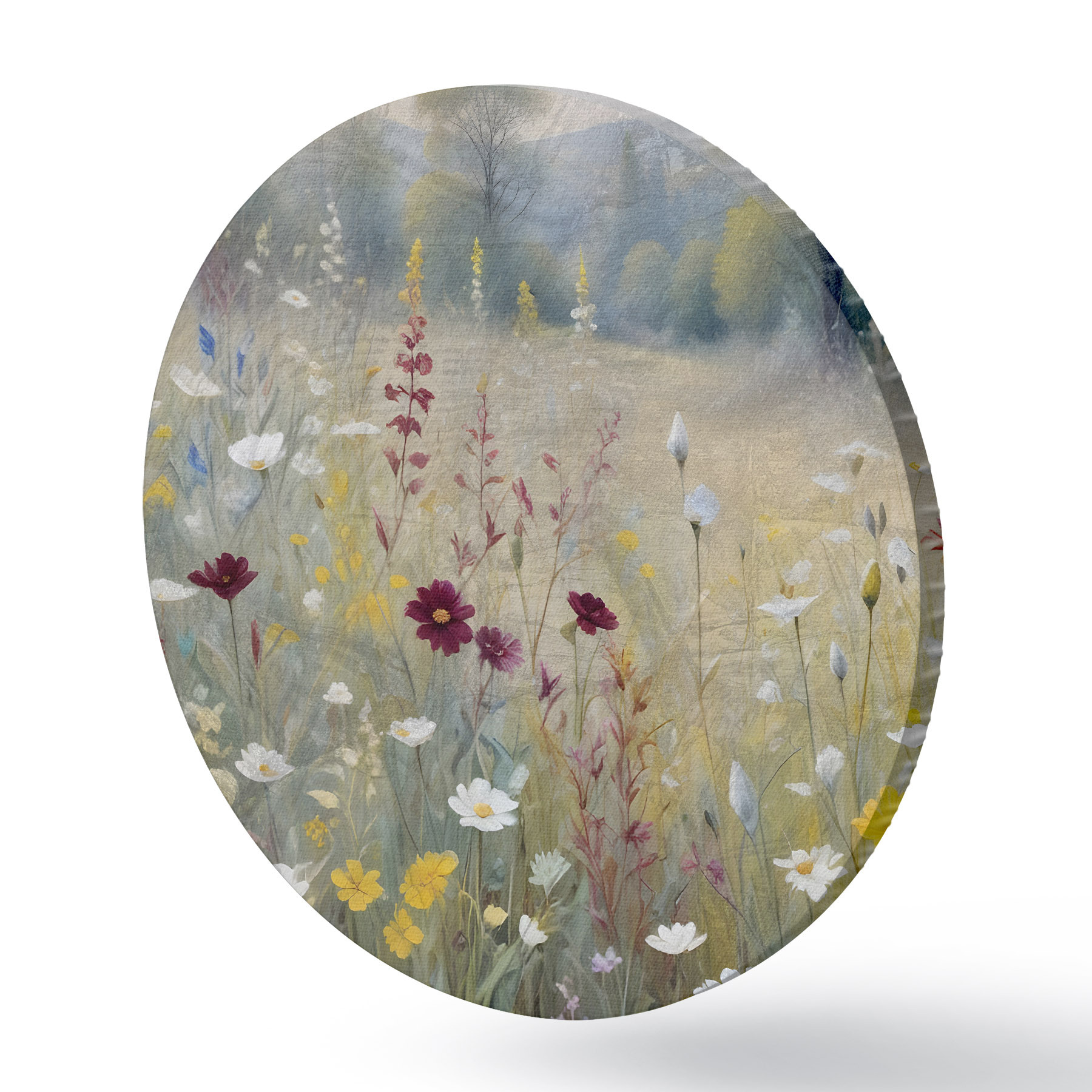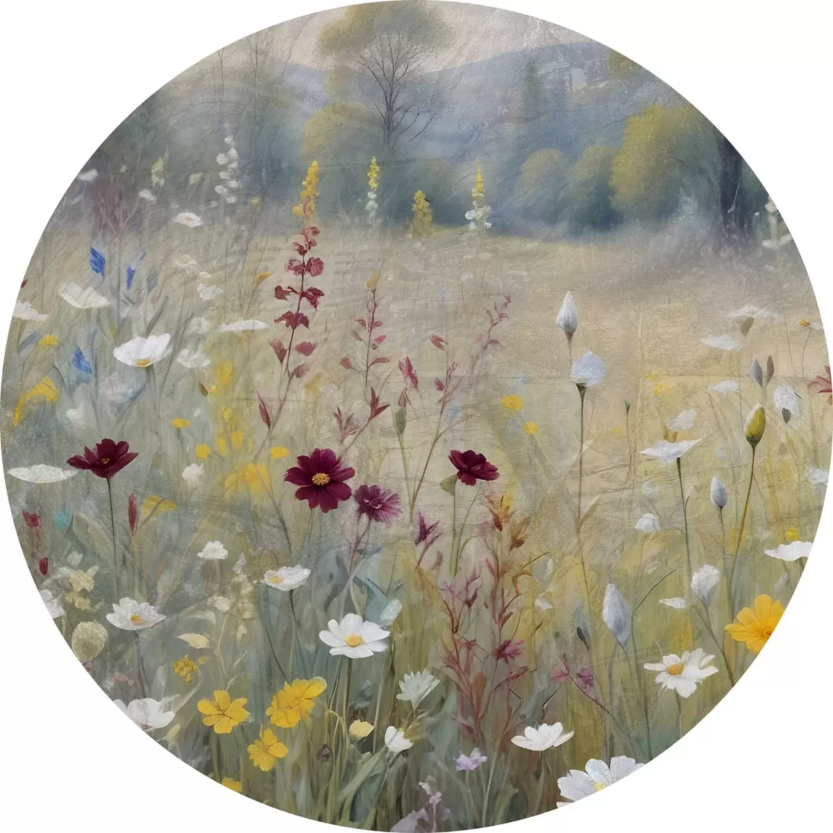 Cuadros redondos Un colorido prado con flores silvestres con un bosque borroso al fondo r38368