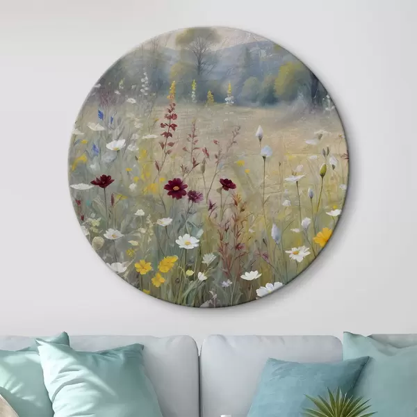 Cuadros redondos Un colorido prado con flores silvestres con un bosque borroso al fondo r38368