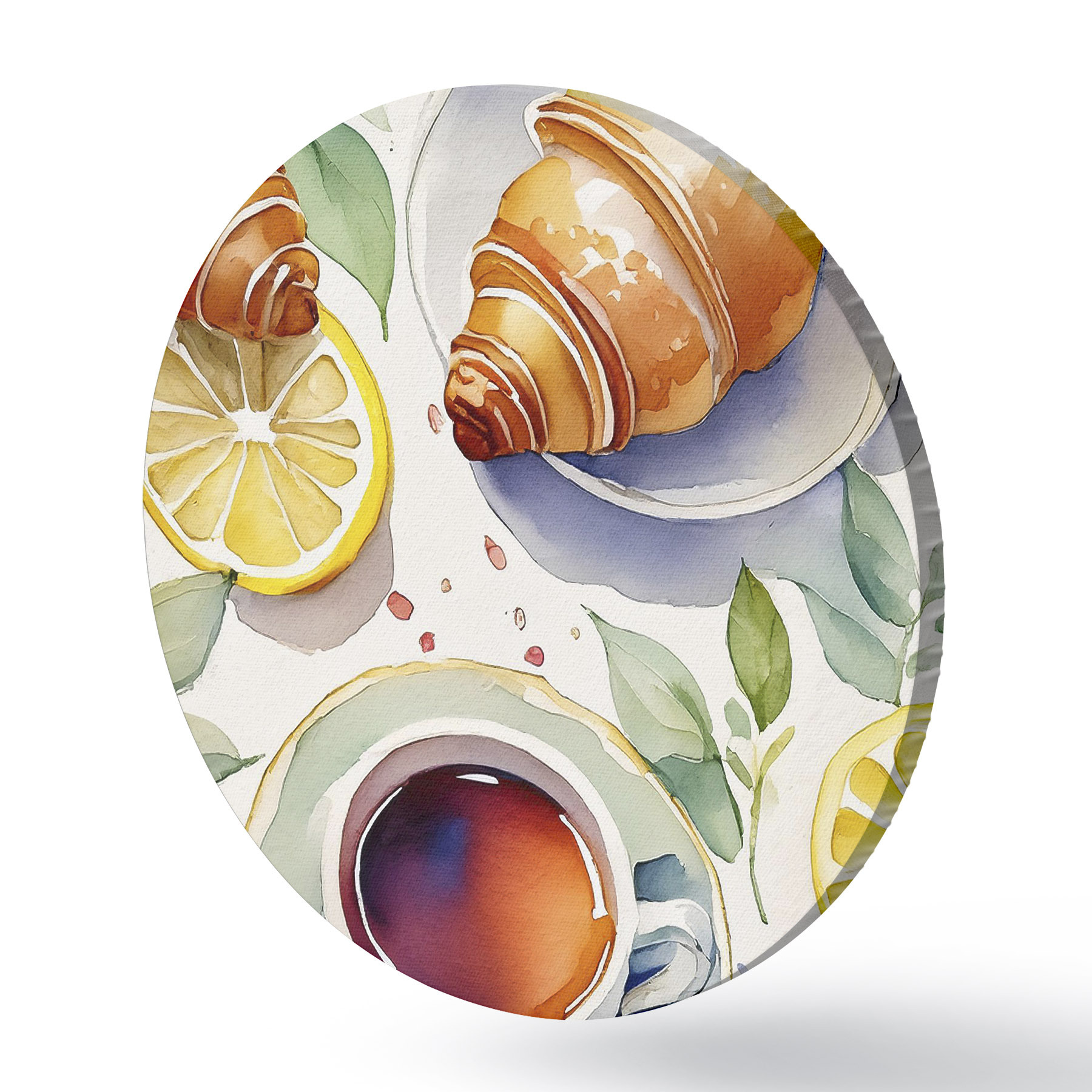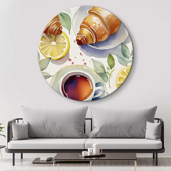 Cuadros redondos Acuarela de croissant, taza de té, desayuno, limones, estilo rústico r38389
