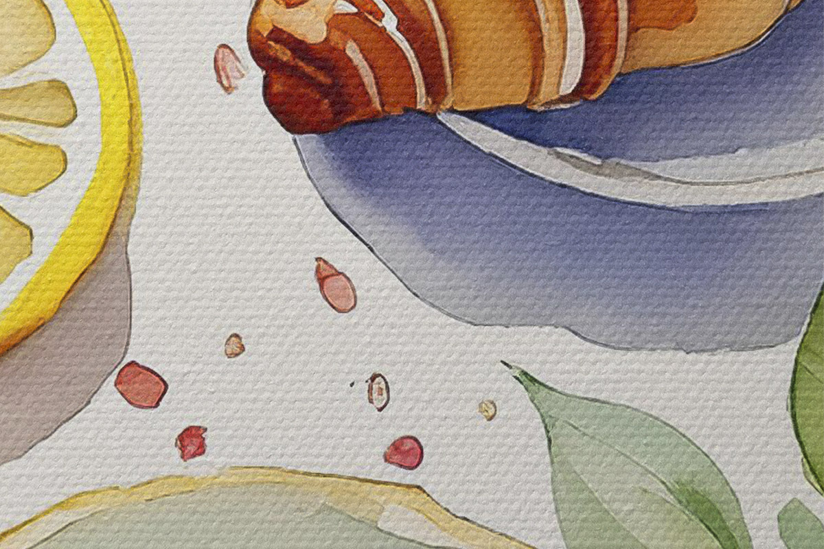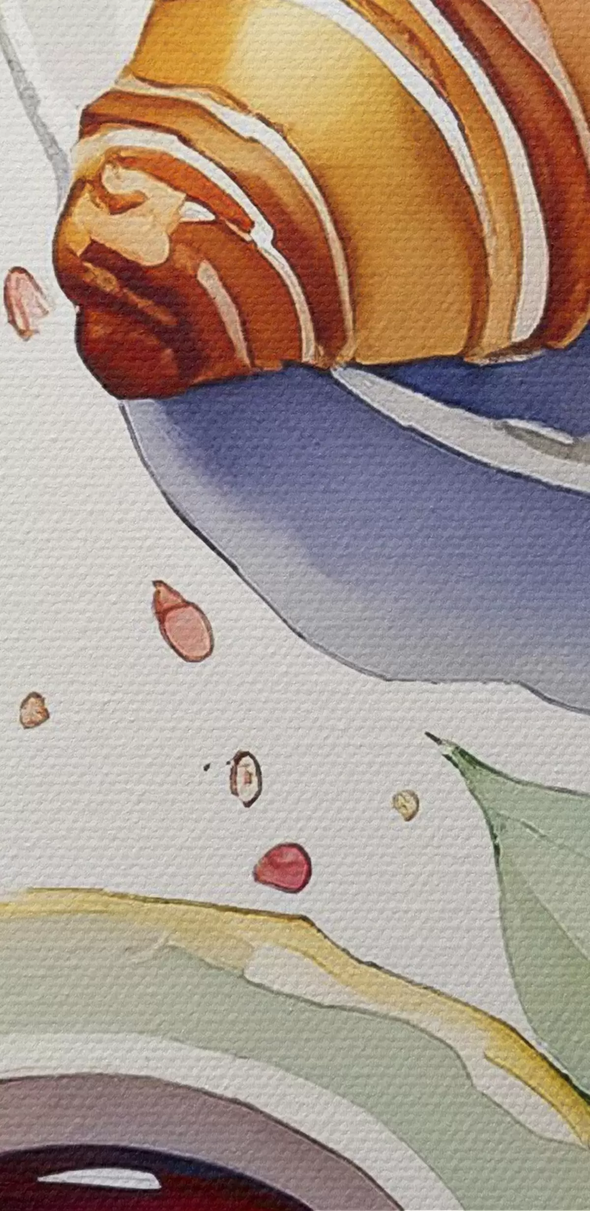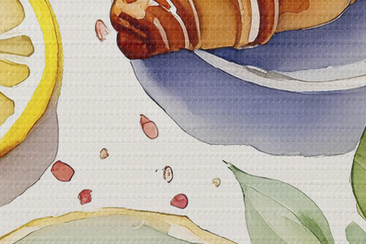Foto Acuarela de croissant, taza de té, desayuno, limones, estilo rústico Nr r38389