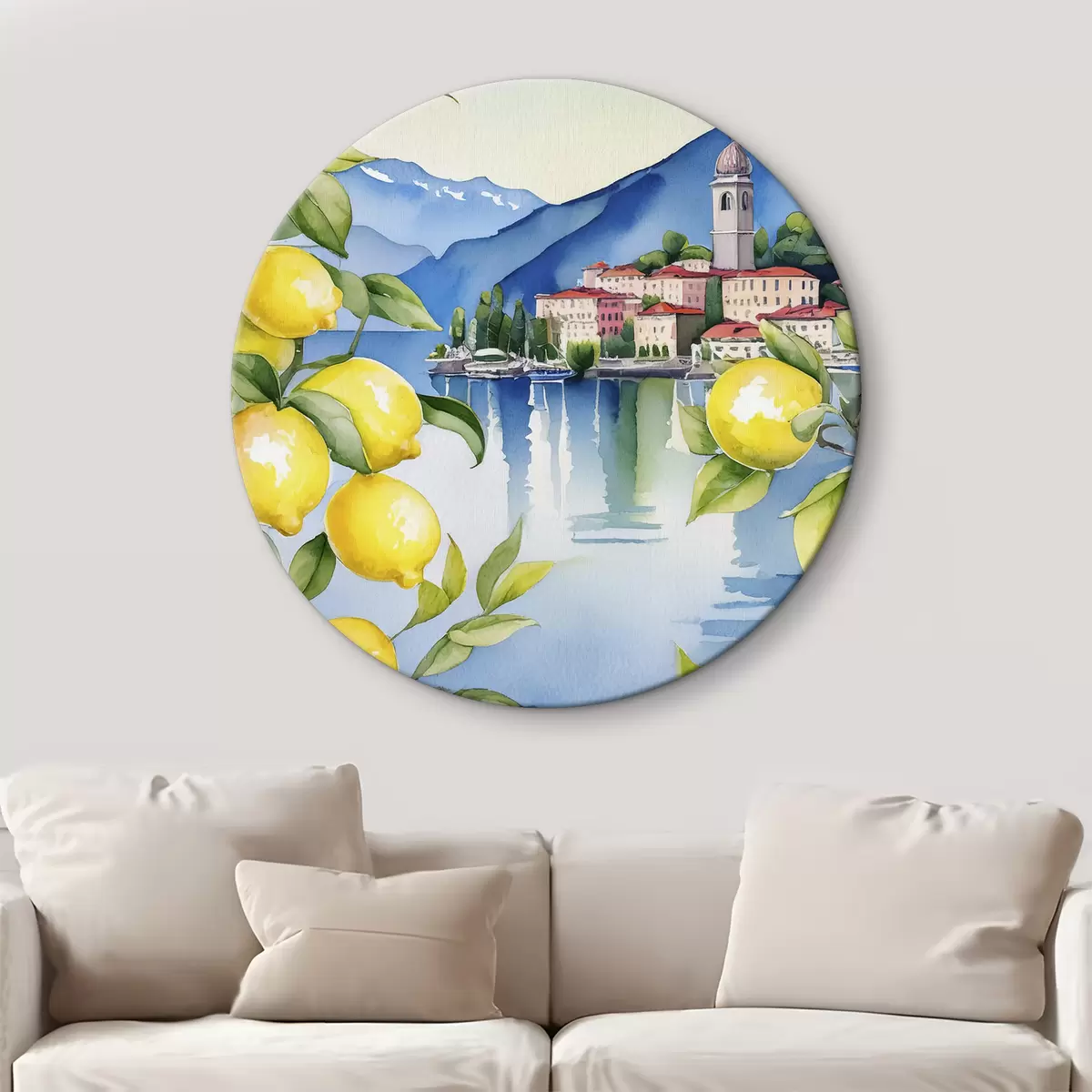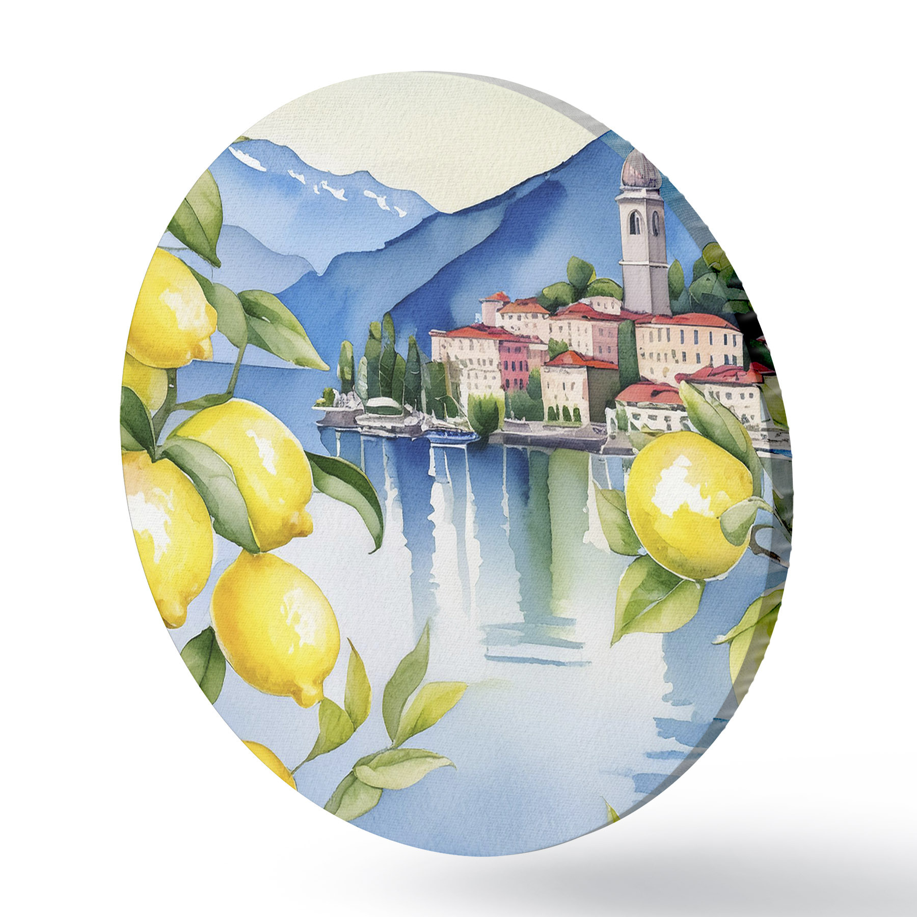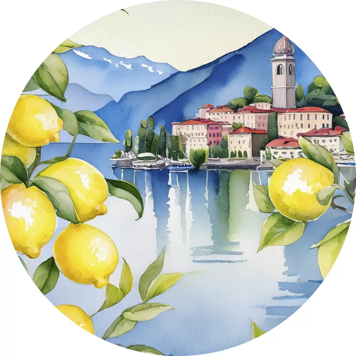 Cuadros redondos Lago Como, acuarela, Italia, verano, montañas, limonero, mar, ciudad vieja r38398