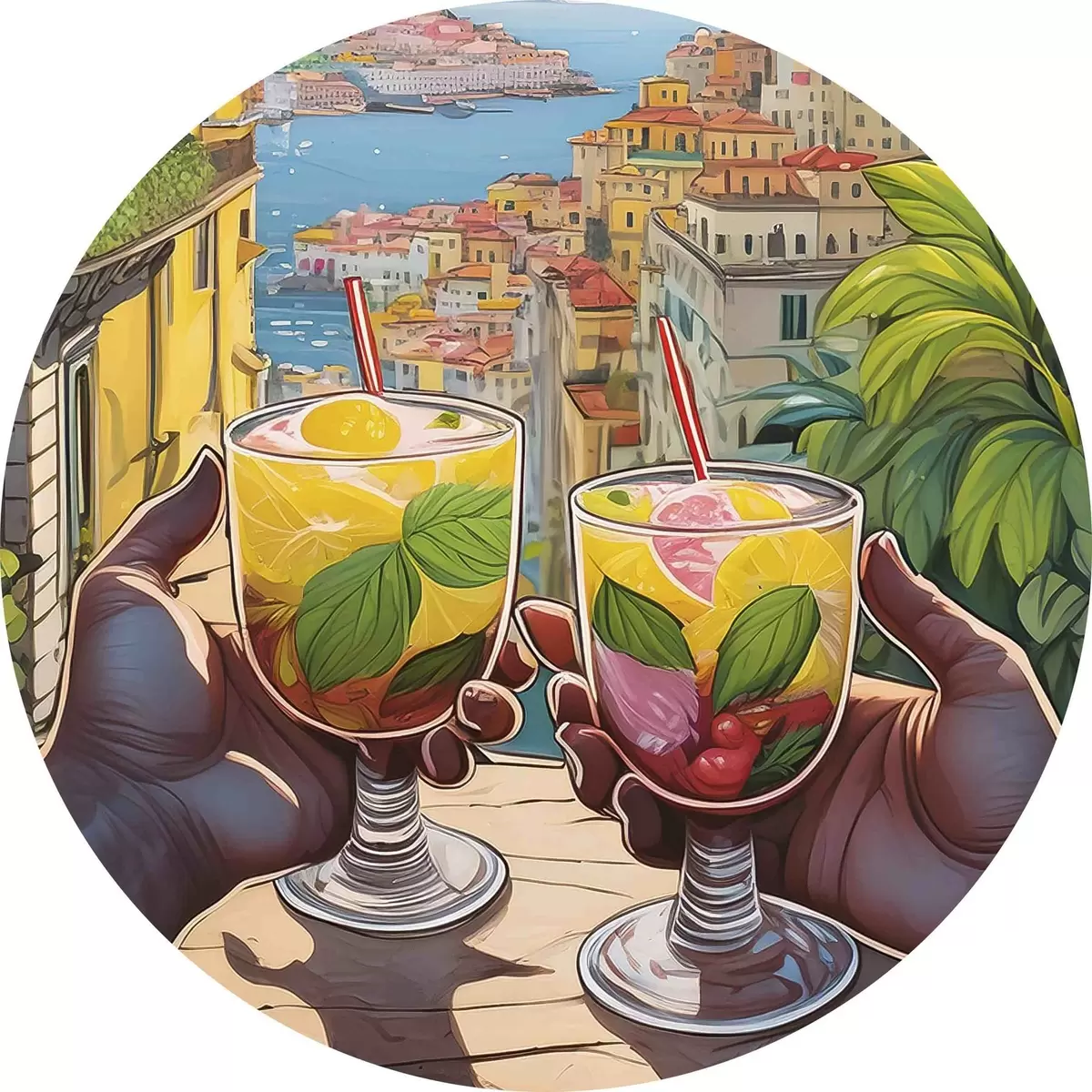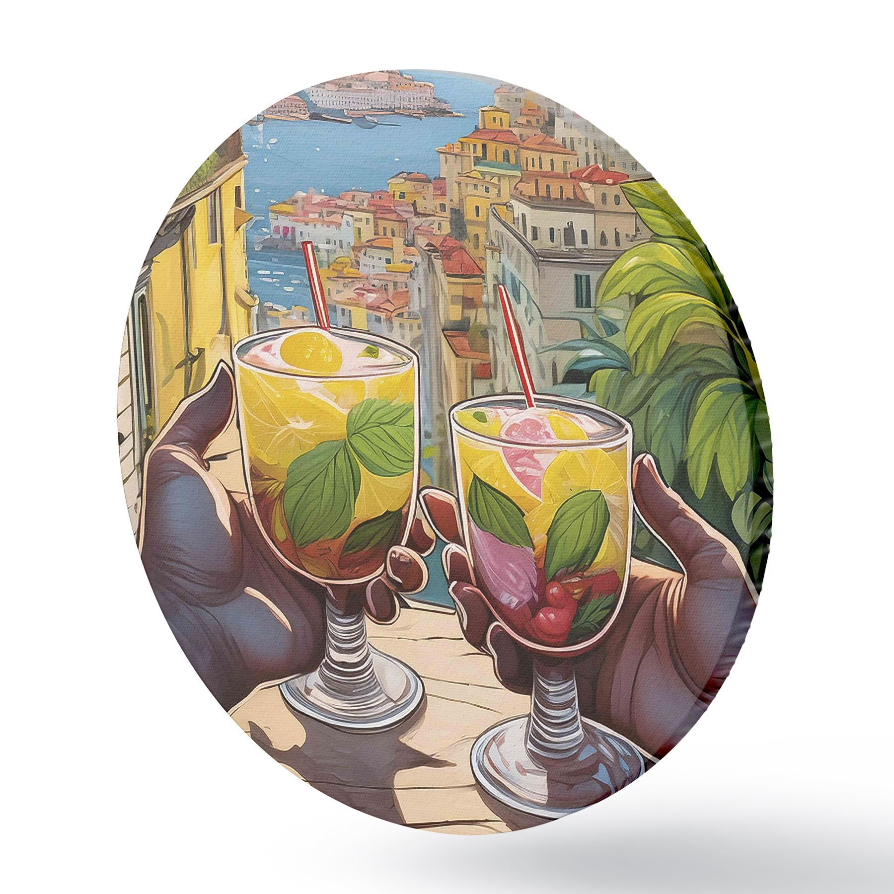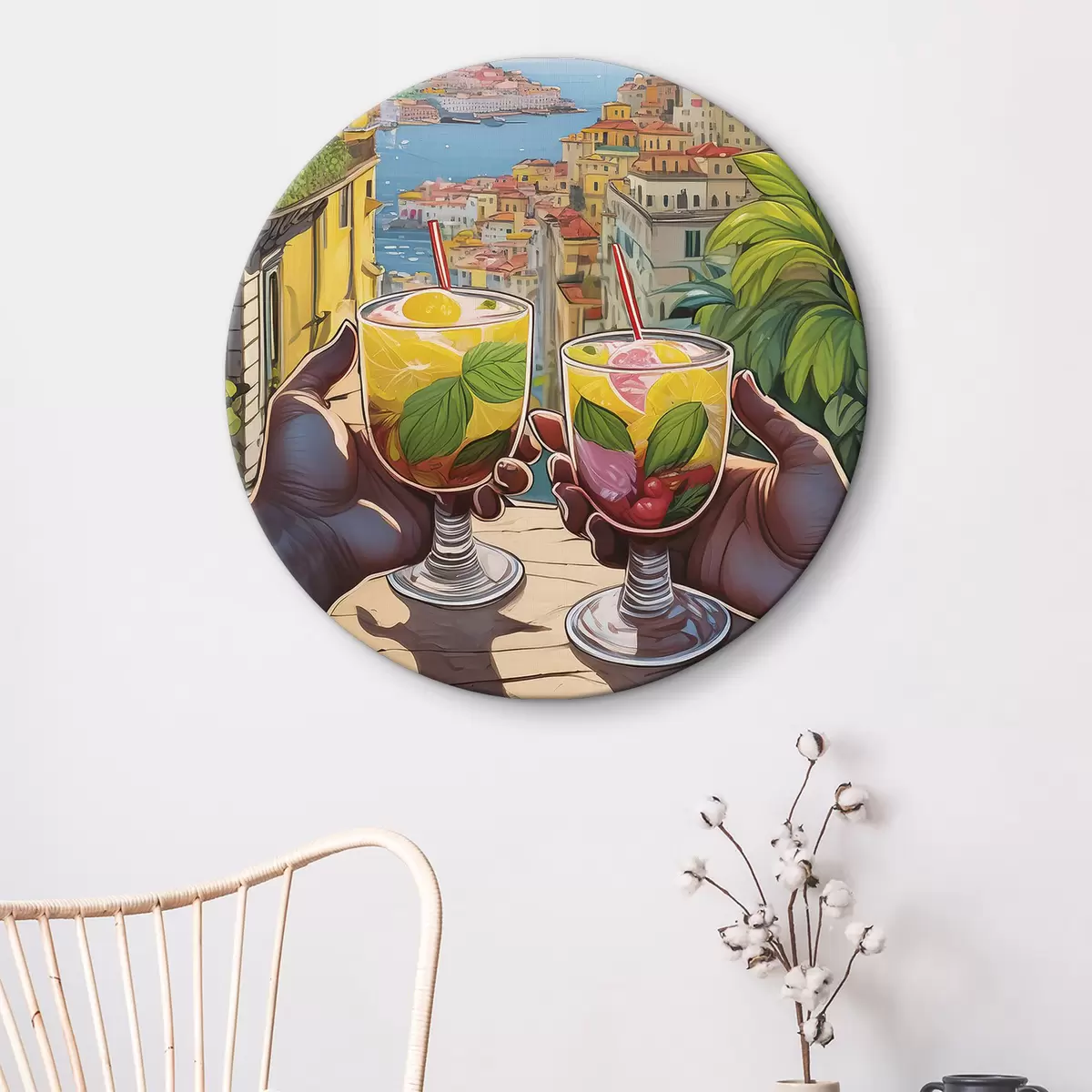 Cuadros redondos Par de manos sosteniendo vasos con frutas y hojas r38405