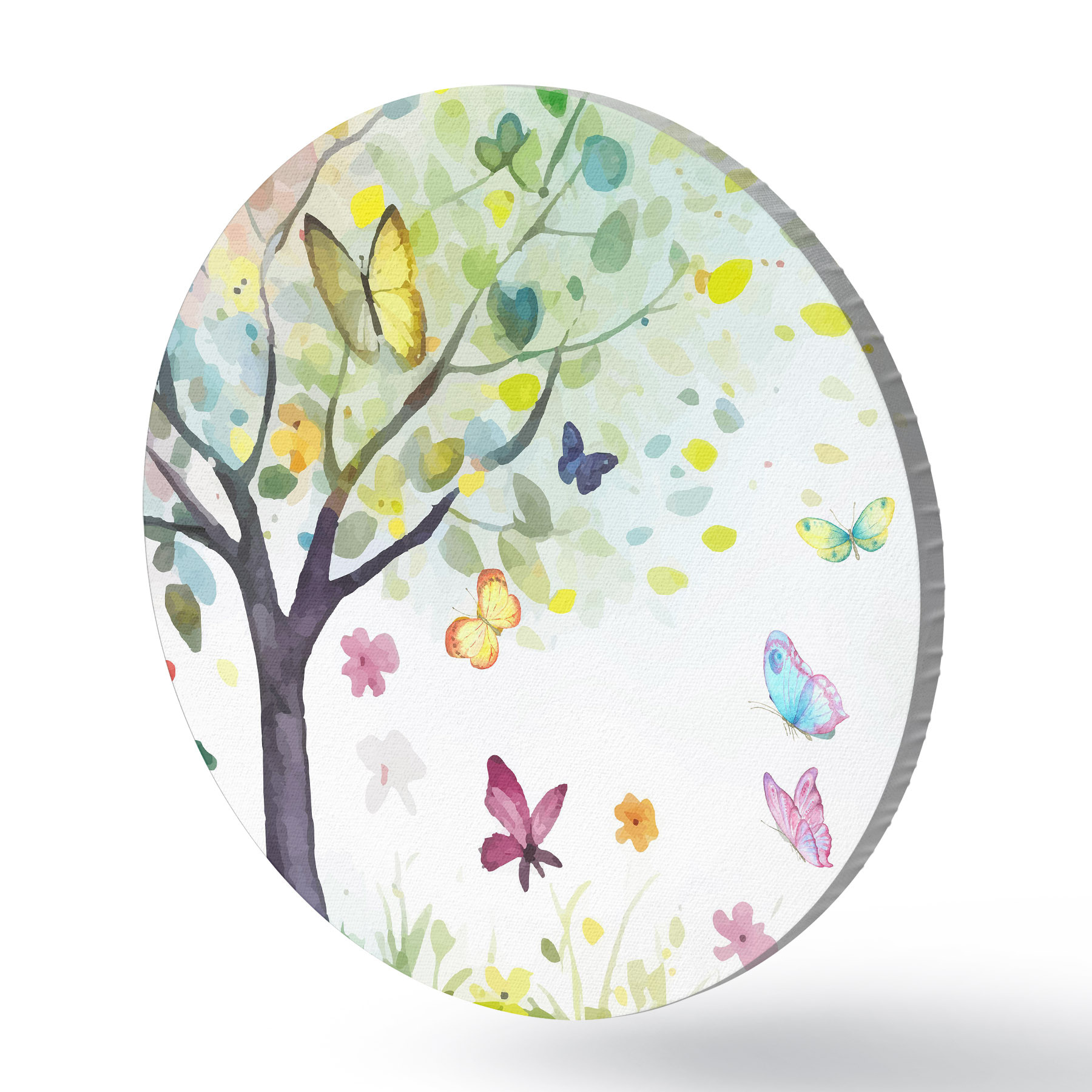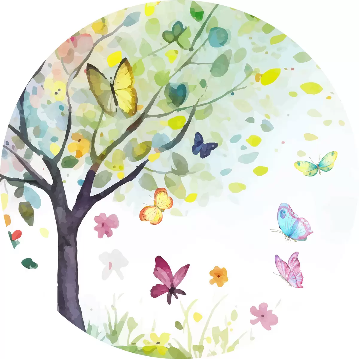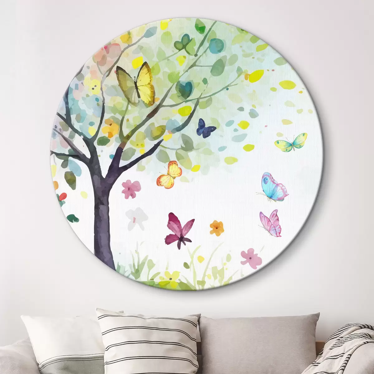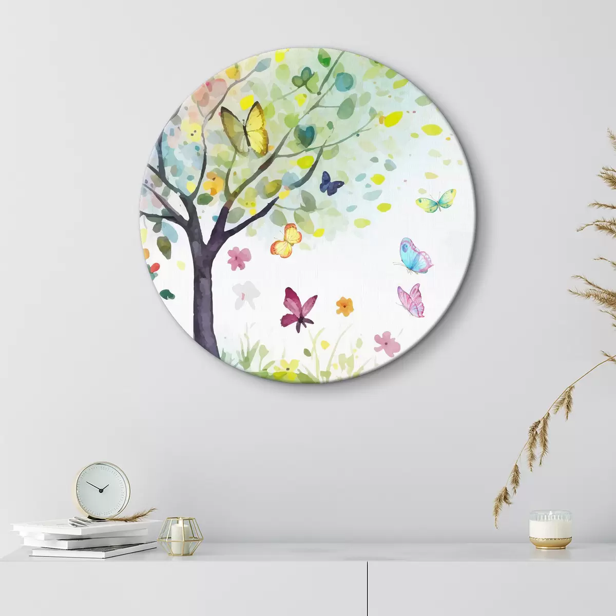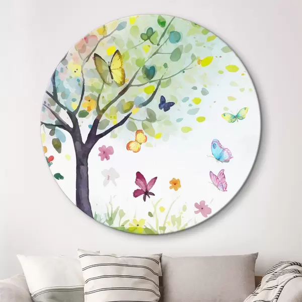 Cuadros redondos árbol con hojas brillantes, pintura acuarela, mariposas r38444