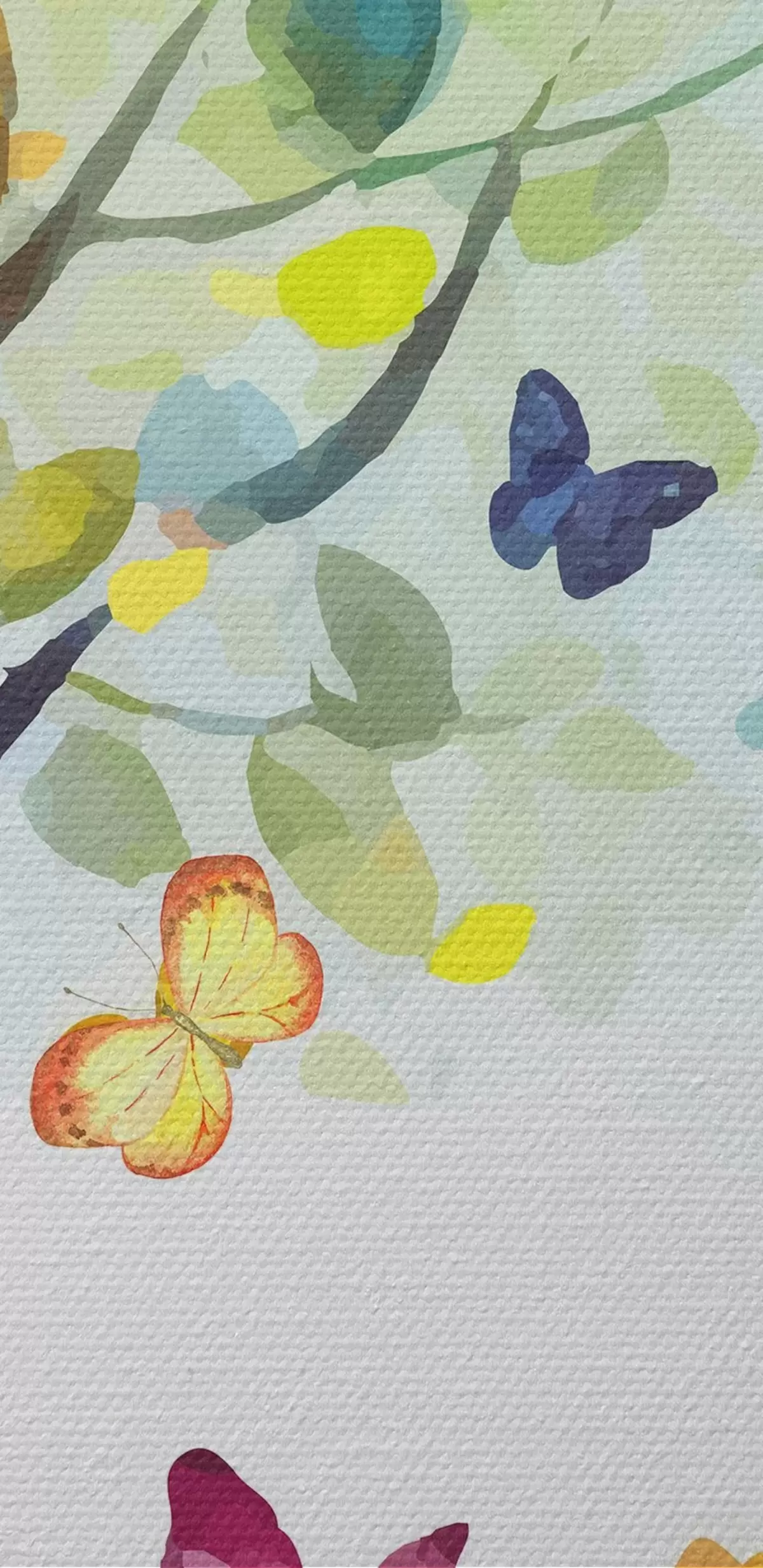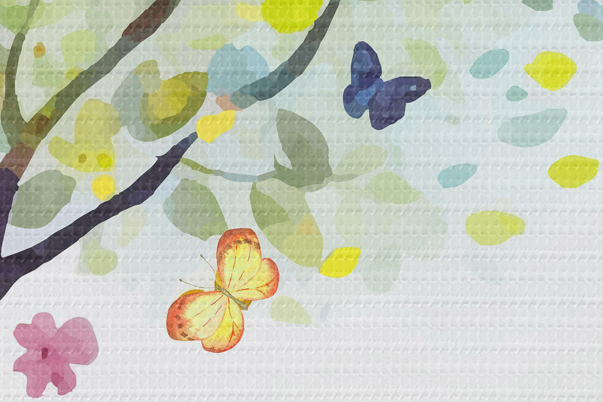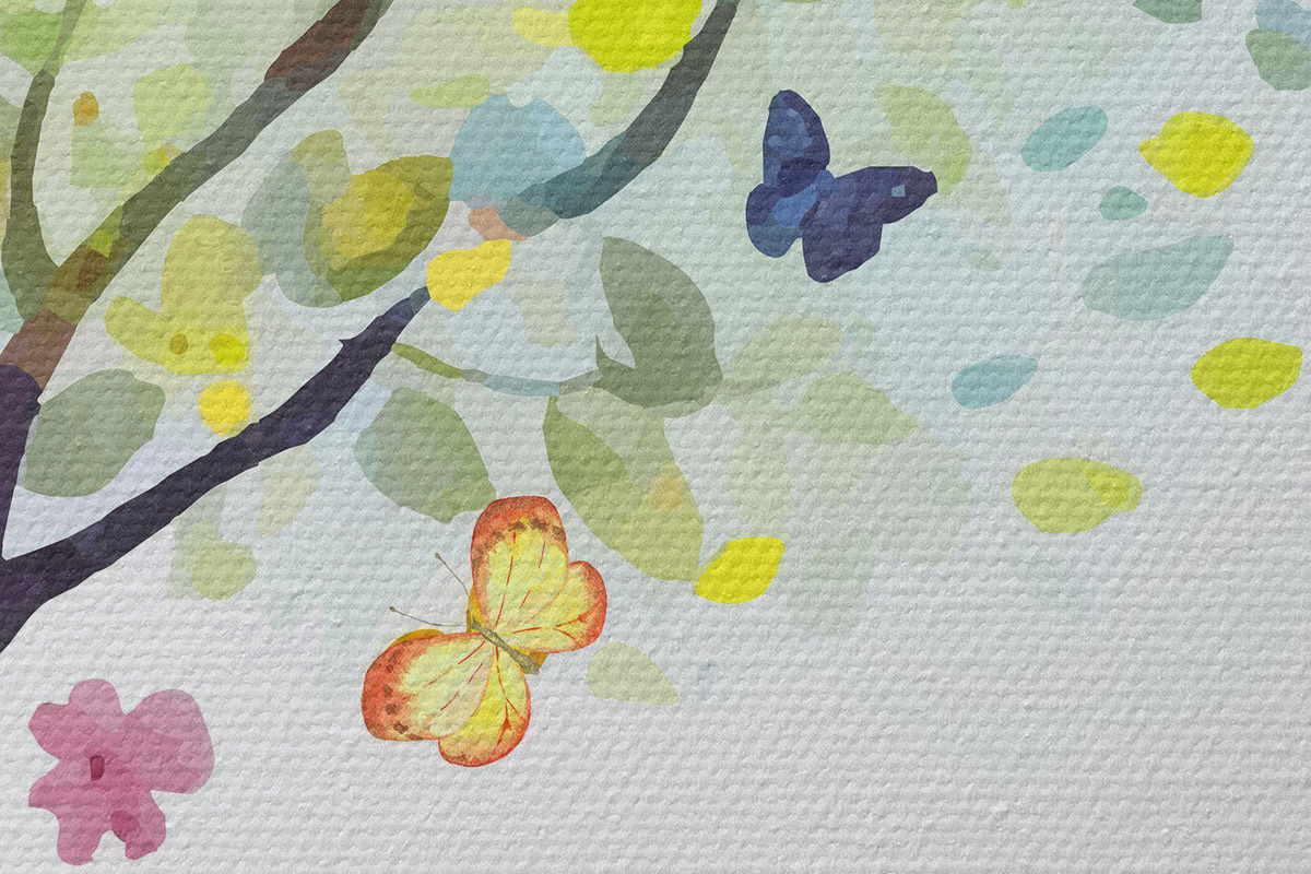 Foto árbol con hojas brillantes, pintura acuarela, mariposas Nr r38444
