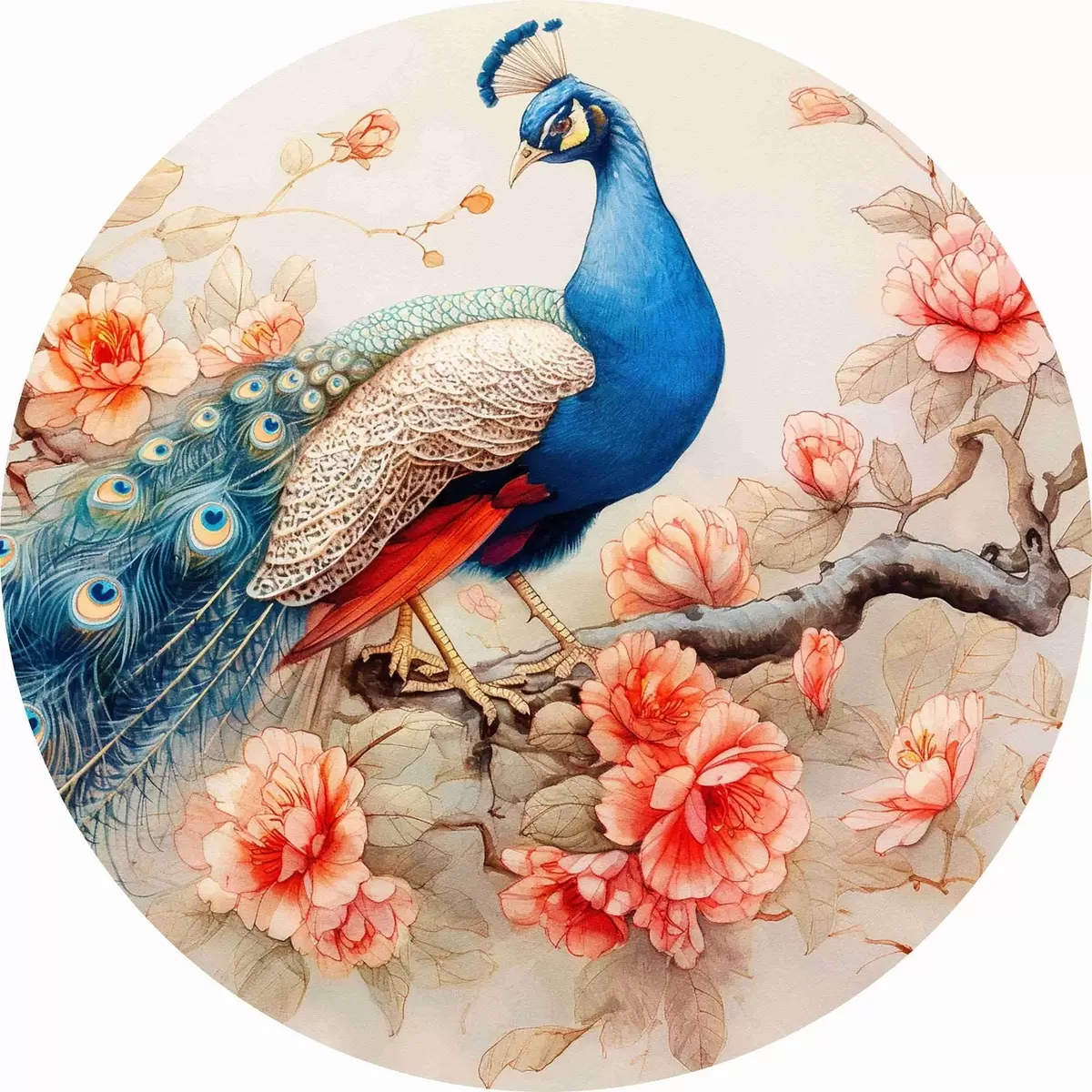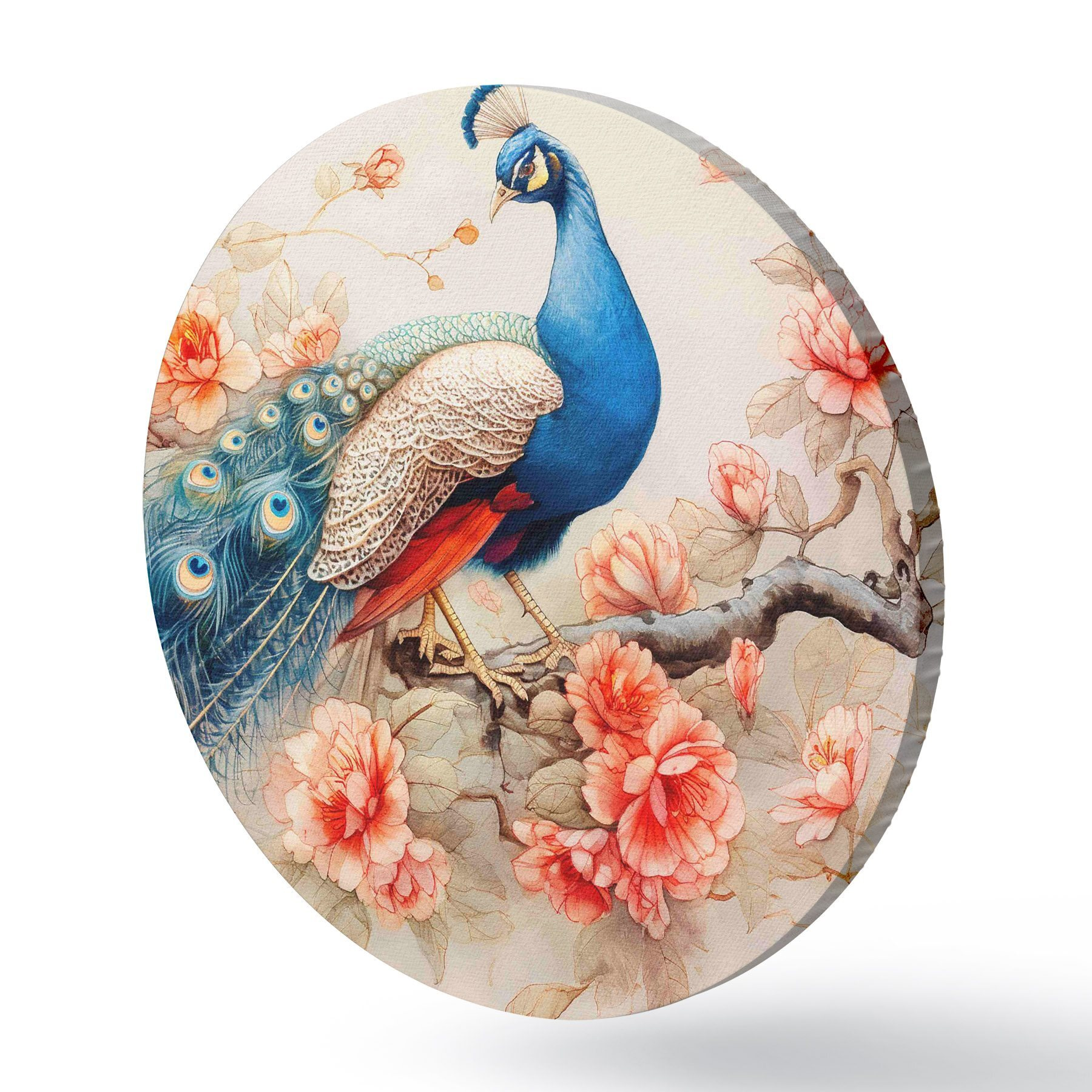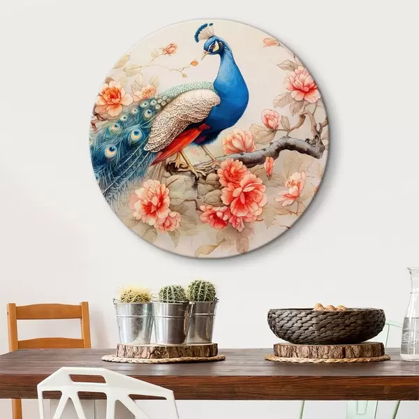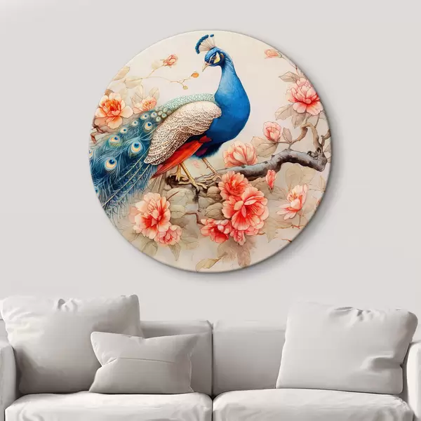 Cuadros redondos Un cuadro con un pavo real en una rama con flores r38451