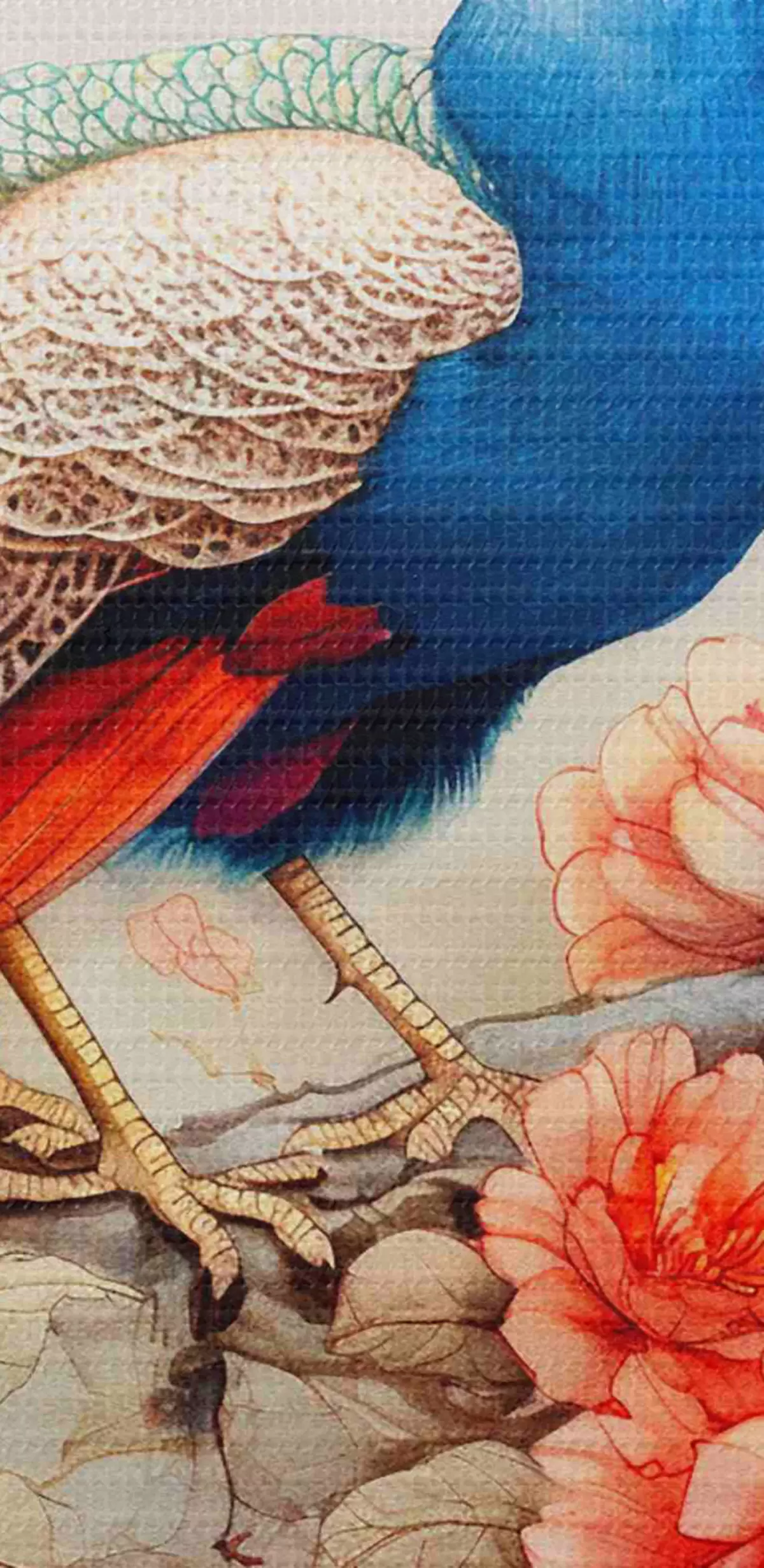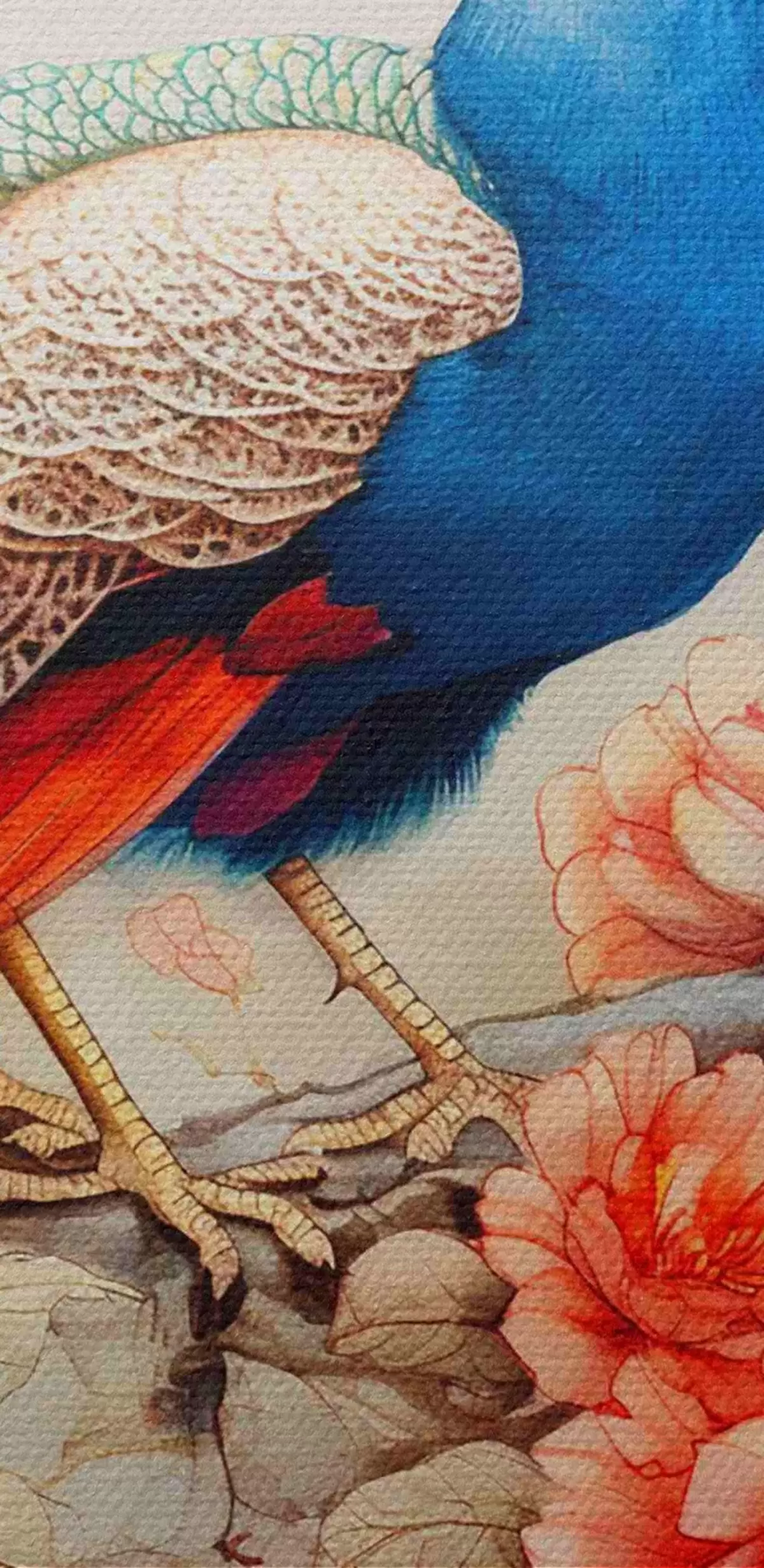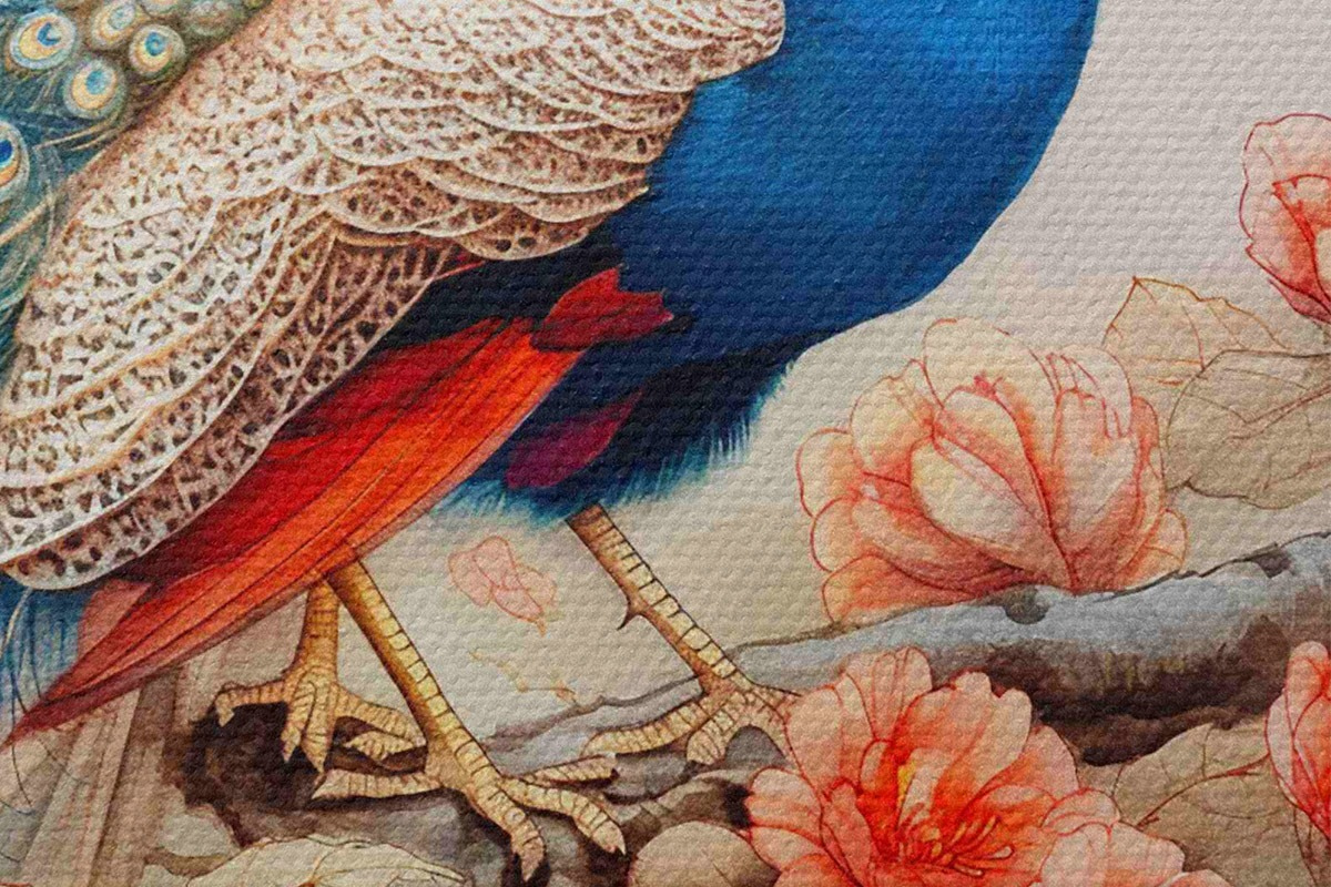Foto Un cuadro con un pavo real en una rama con flores Nr r38451