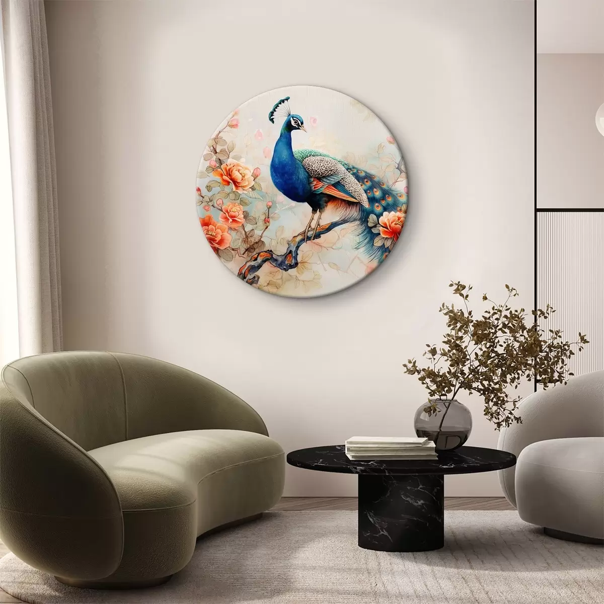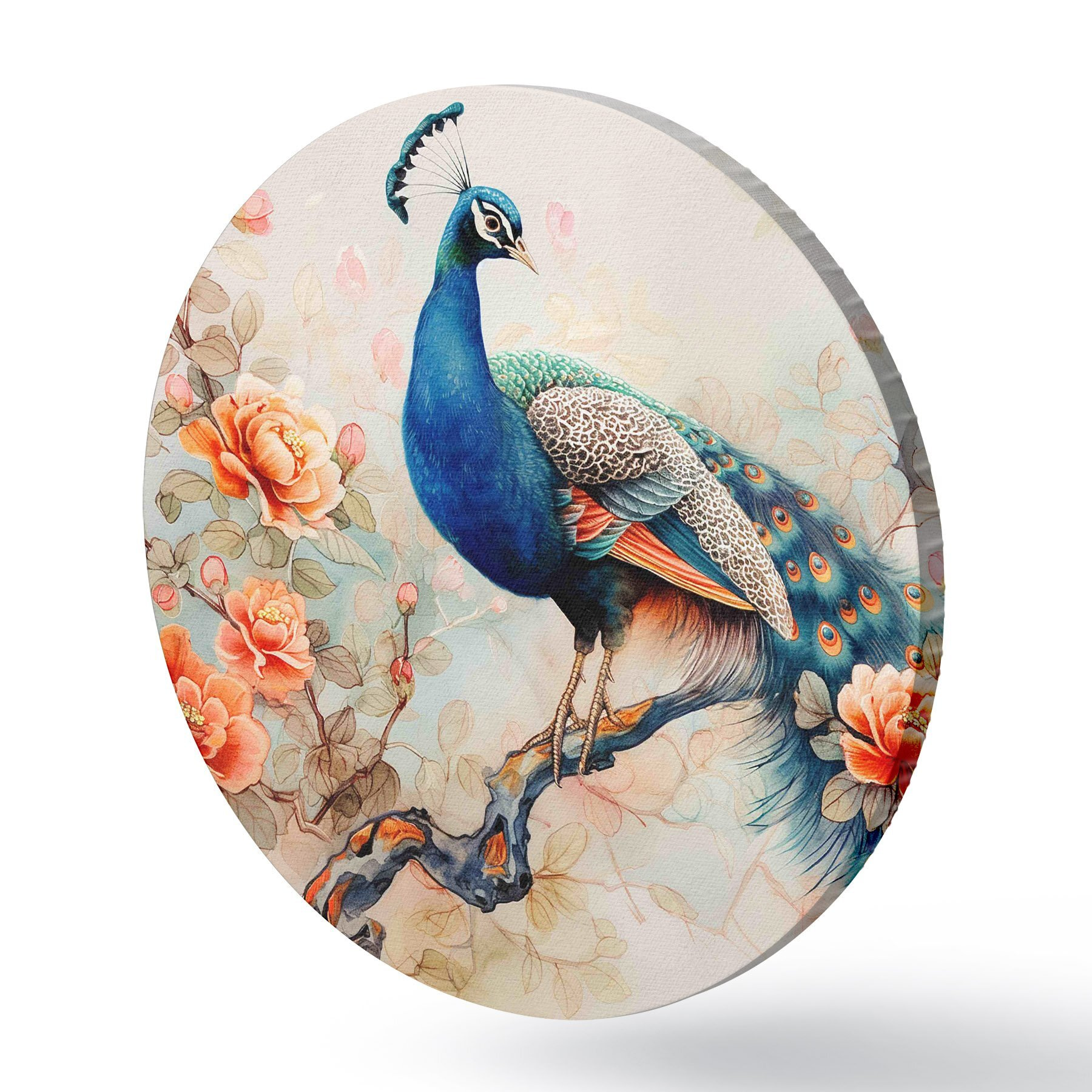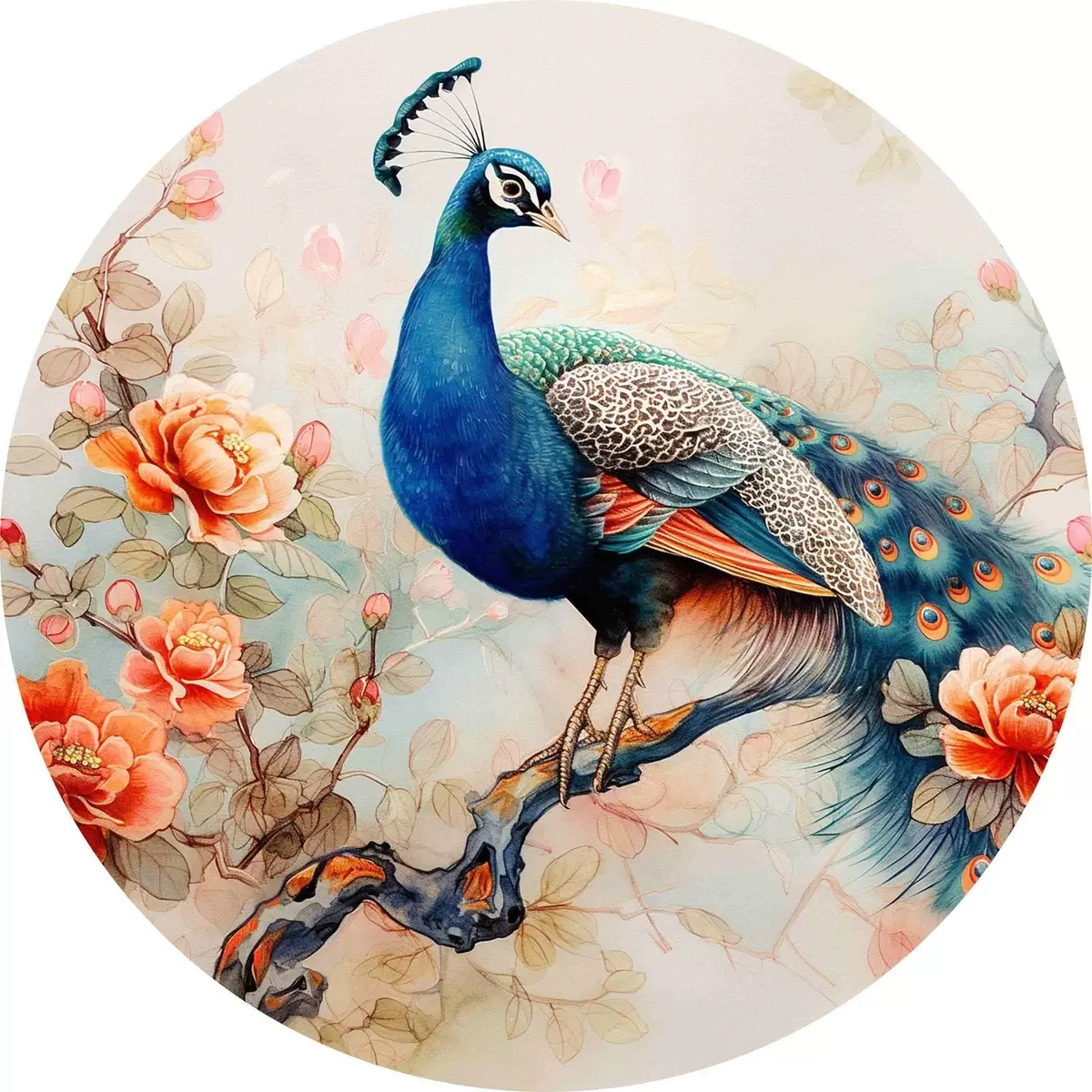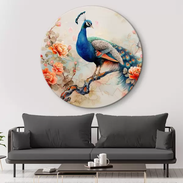 Cuadros redondos Un cuadro con un pavo real en una rama con flores r38452