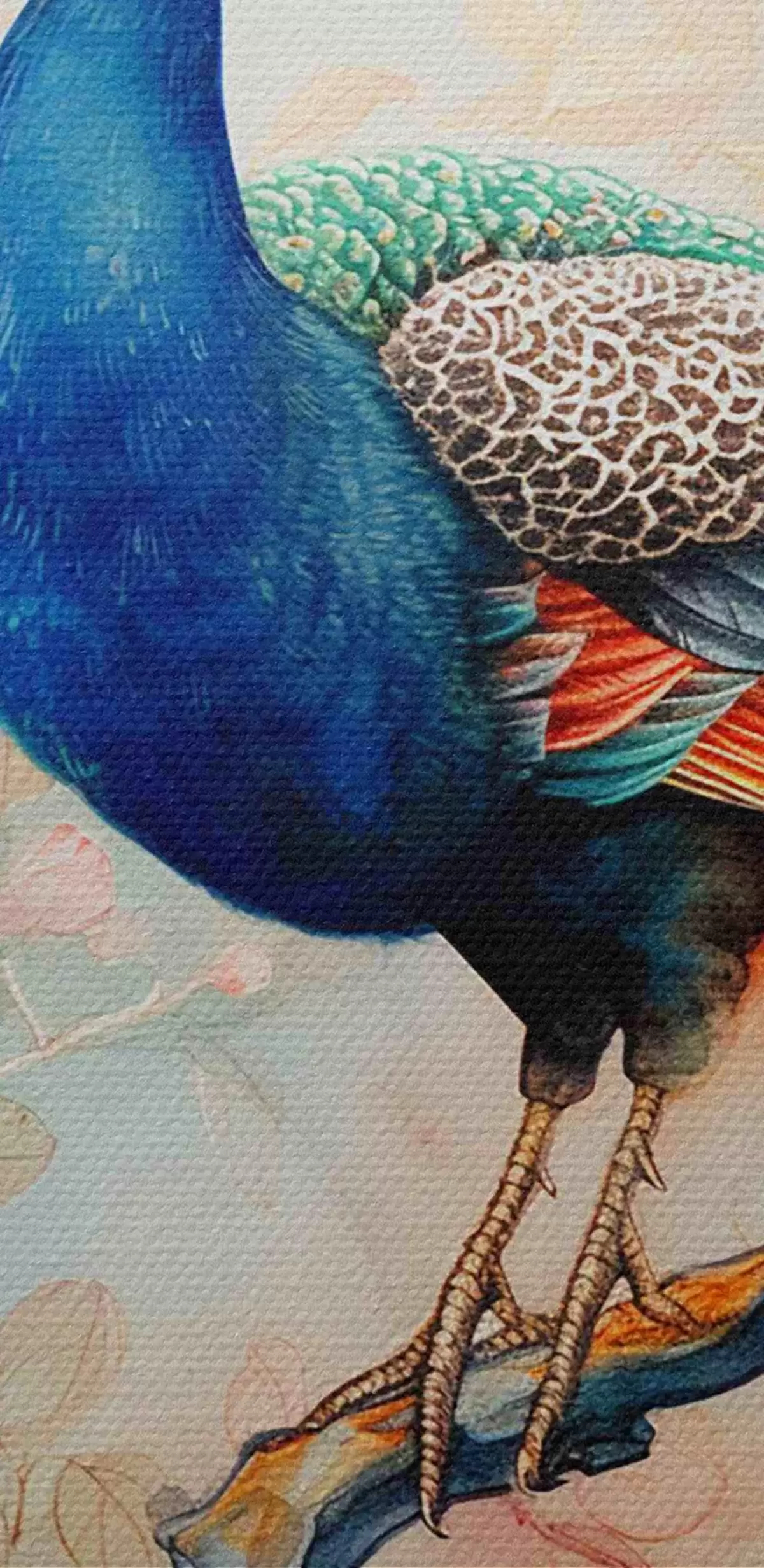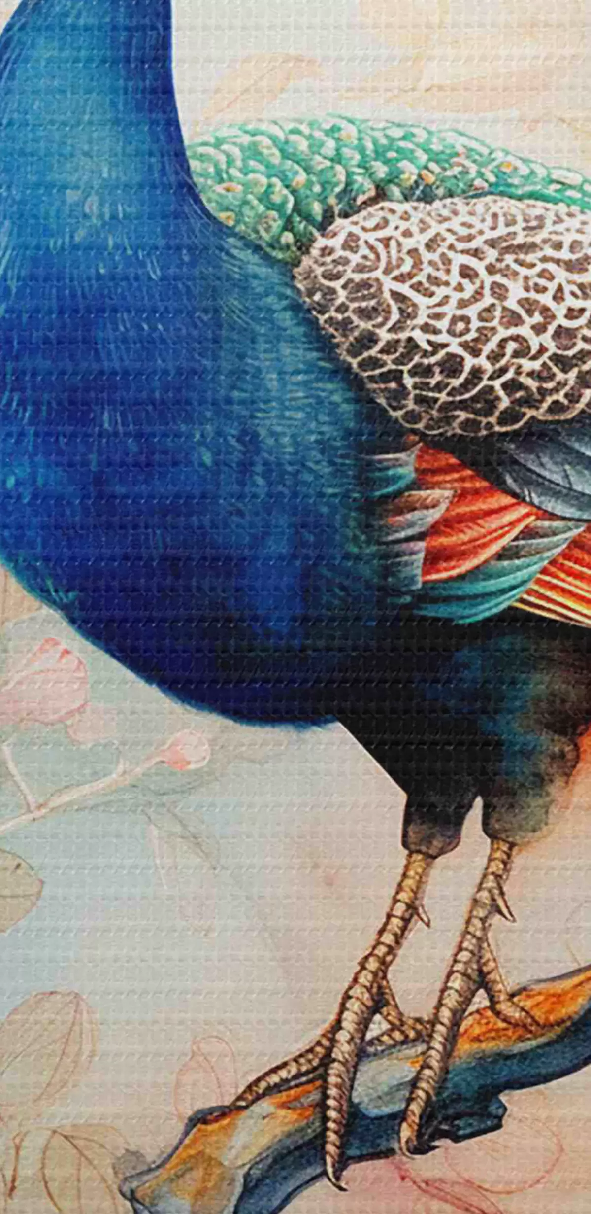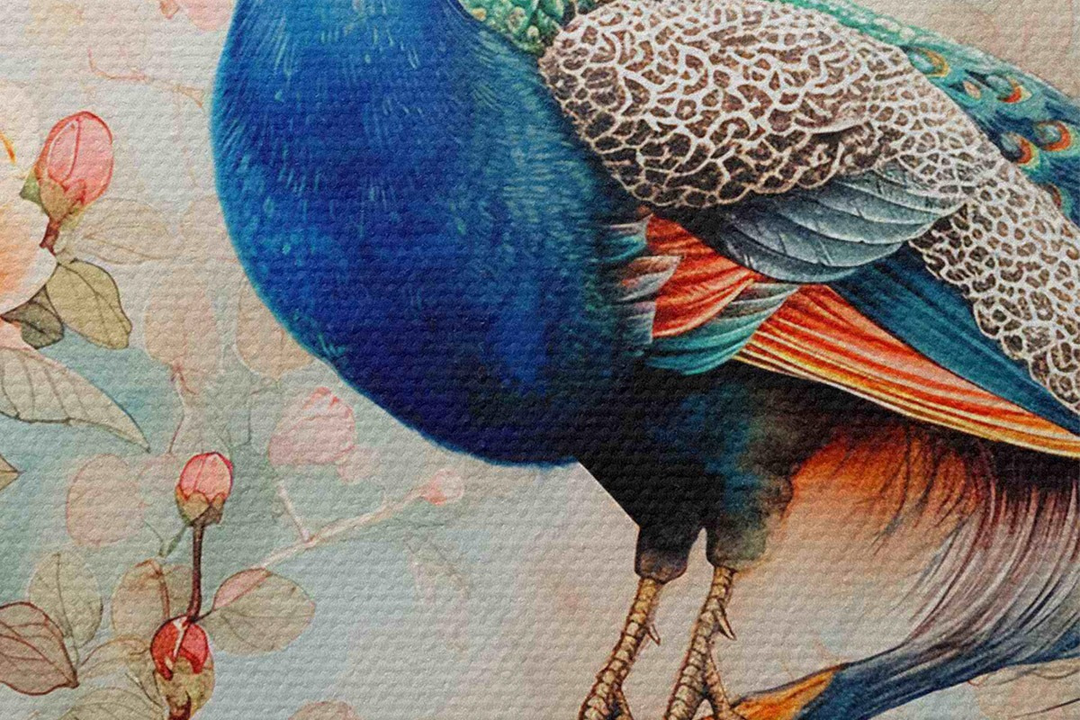 Foto Un cuadro con un pavo real en una rama con flores Nr r38452