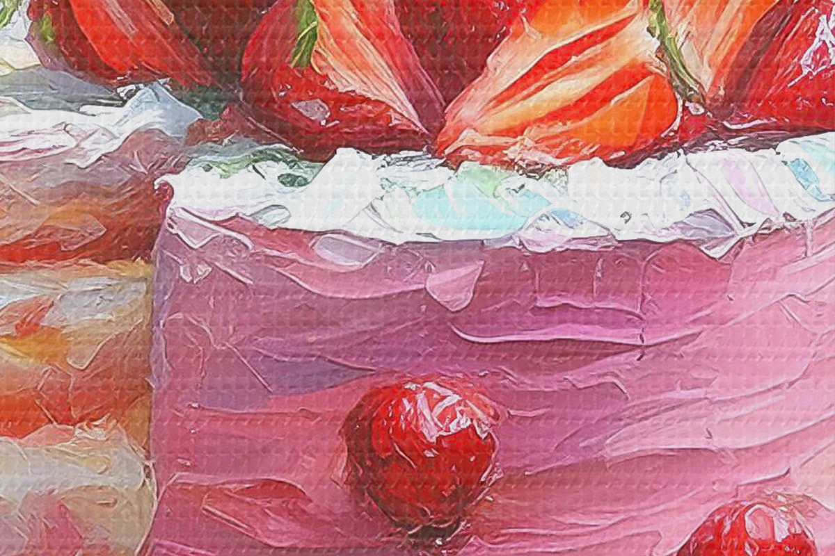 Foto Pastel de fresa con crema, pintura al óleo, grandes pinceladas, bayas de verano, colores rosados Nr r38499