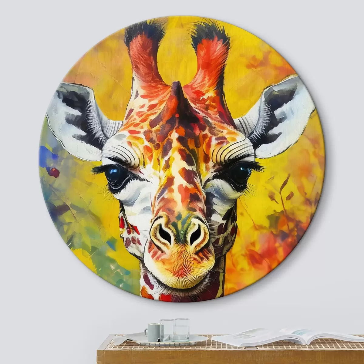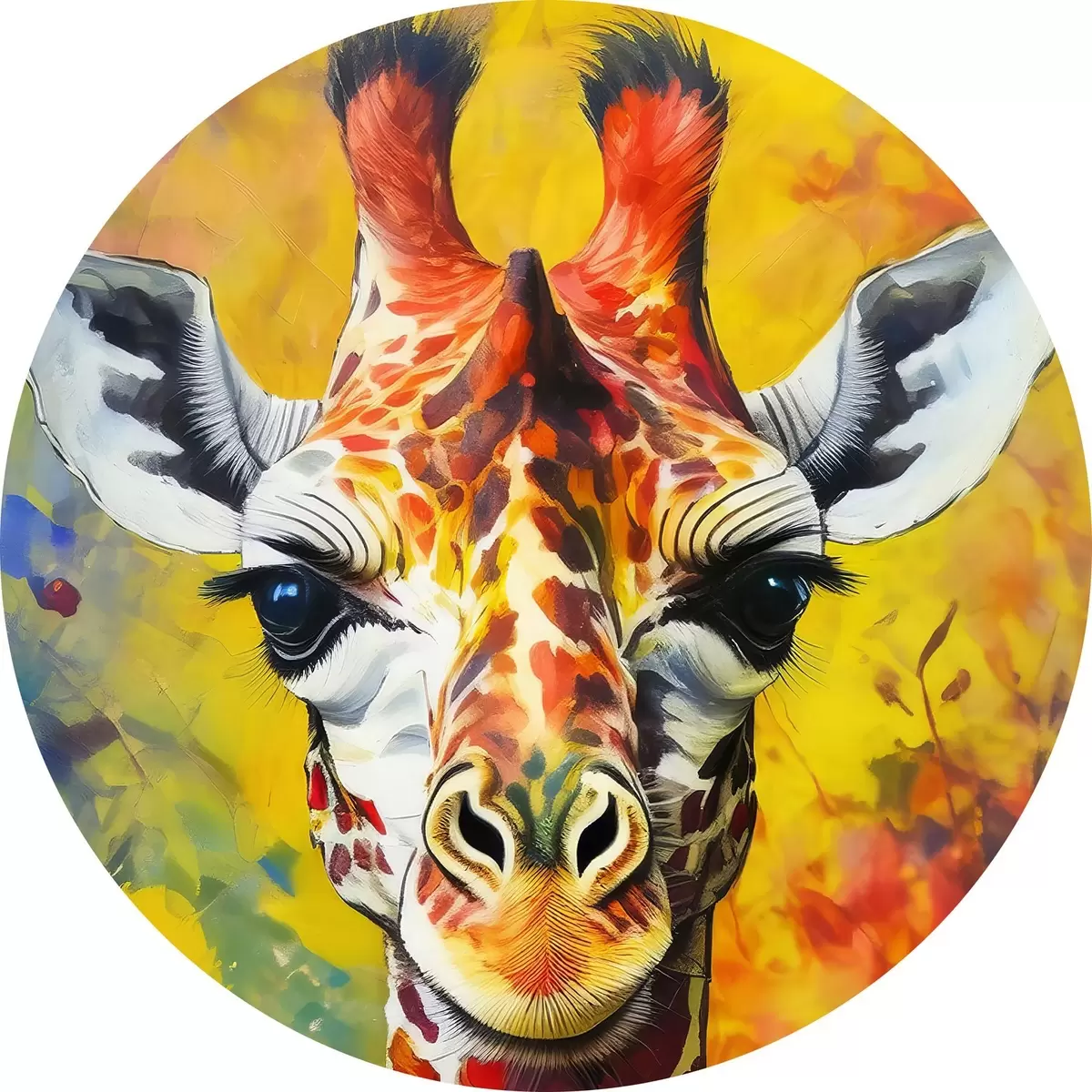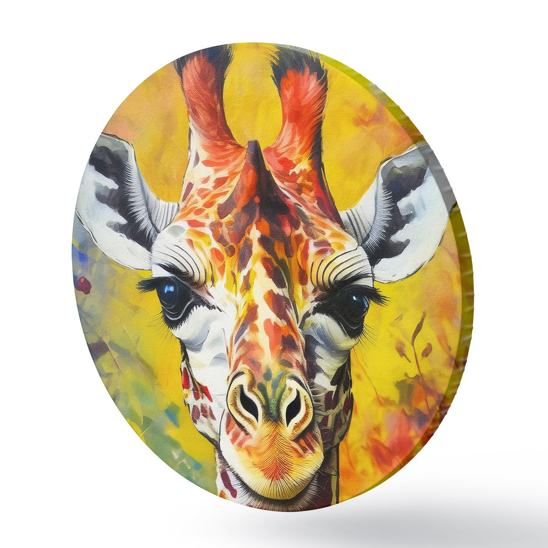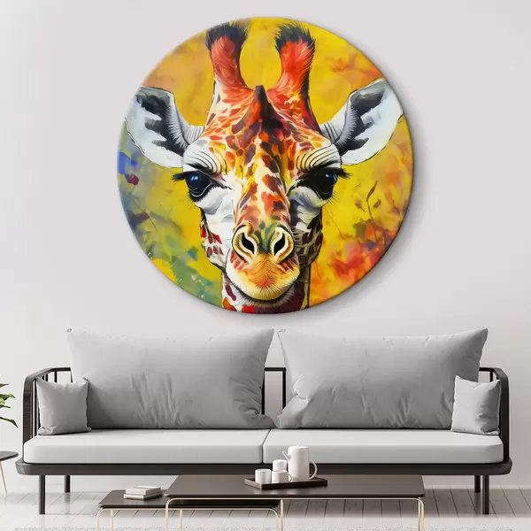 Cuadros redondos retrato de una jirafa con traje sobre un fondo amarillo r38606