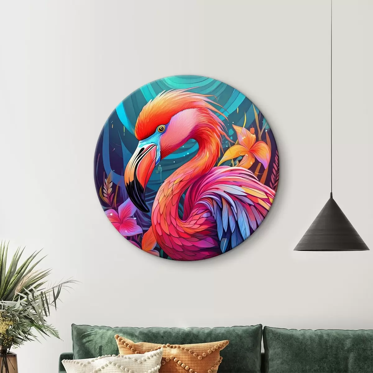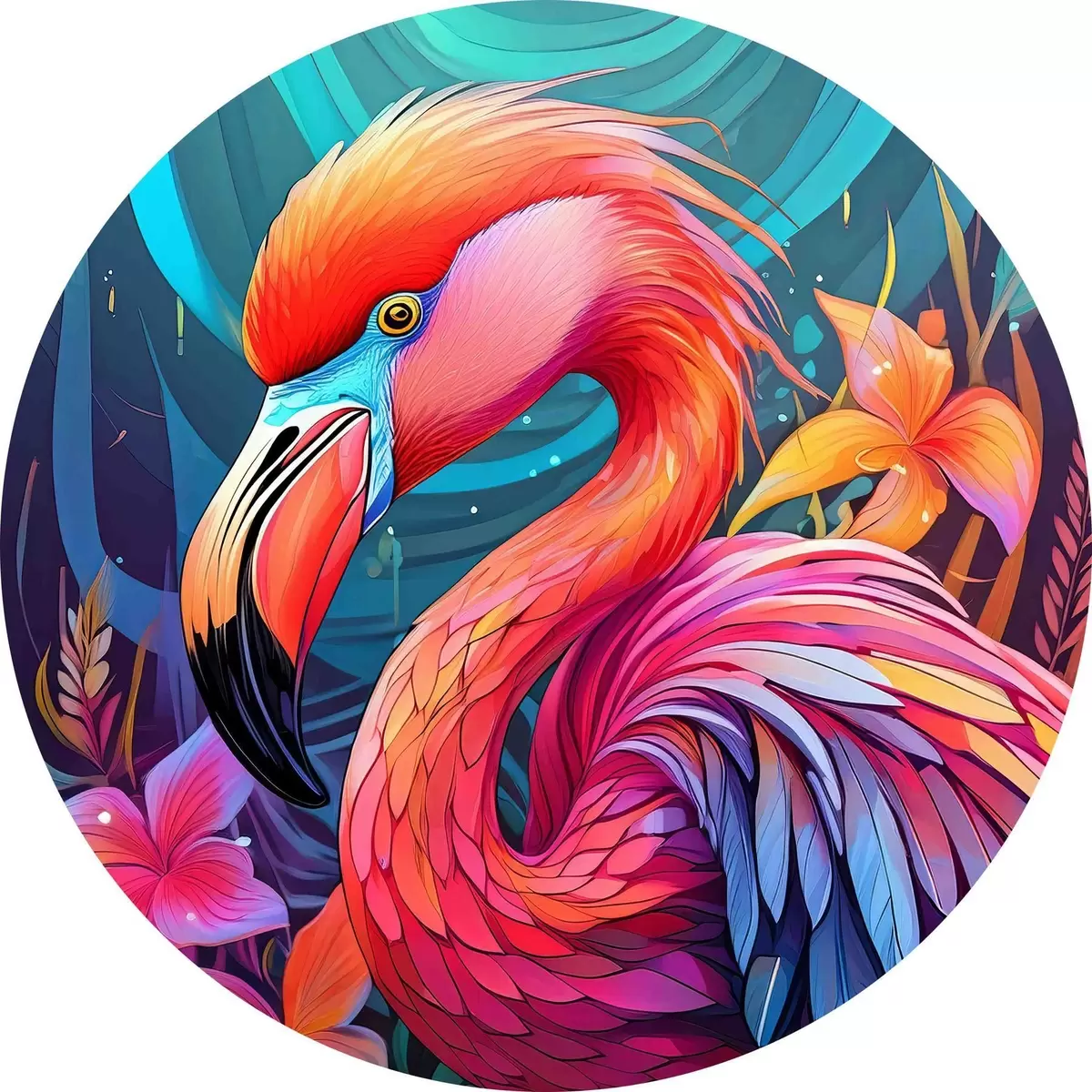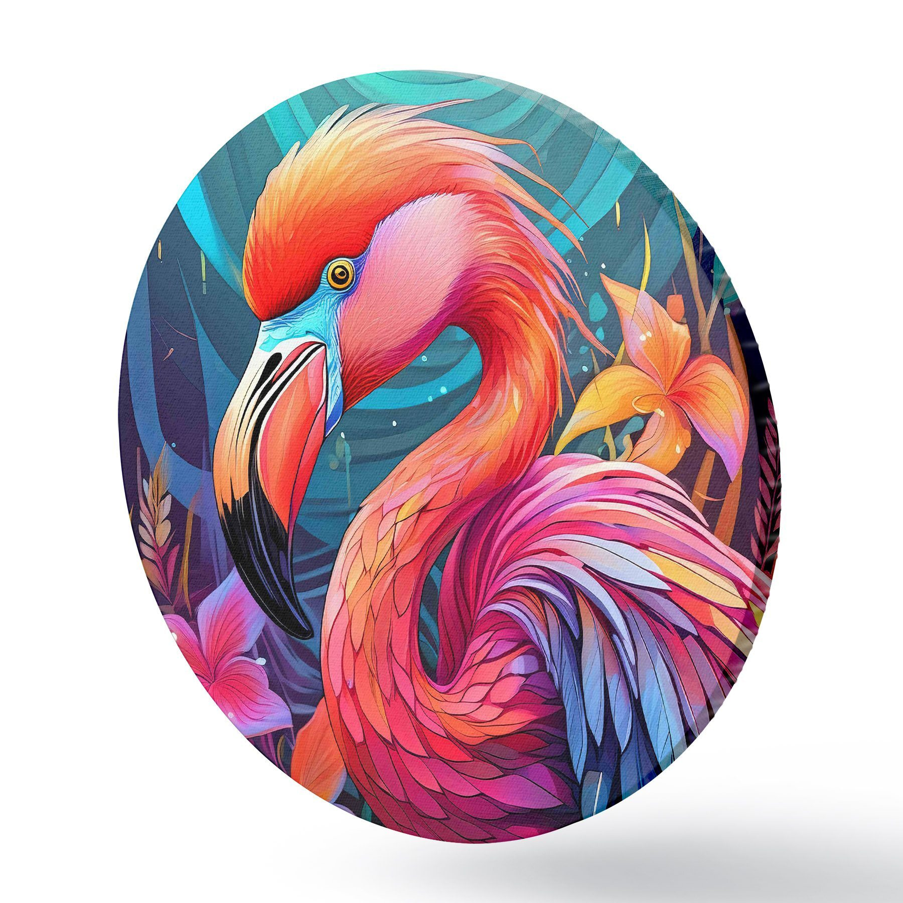 Cuadros redondos Colorido flamenco rosa con flores r38609