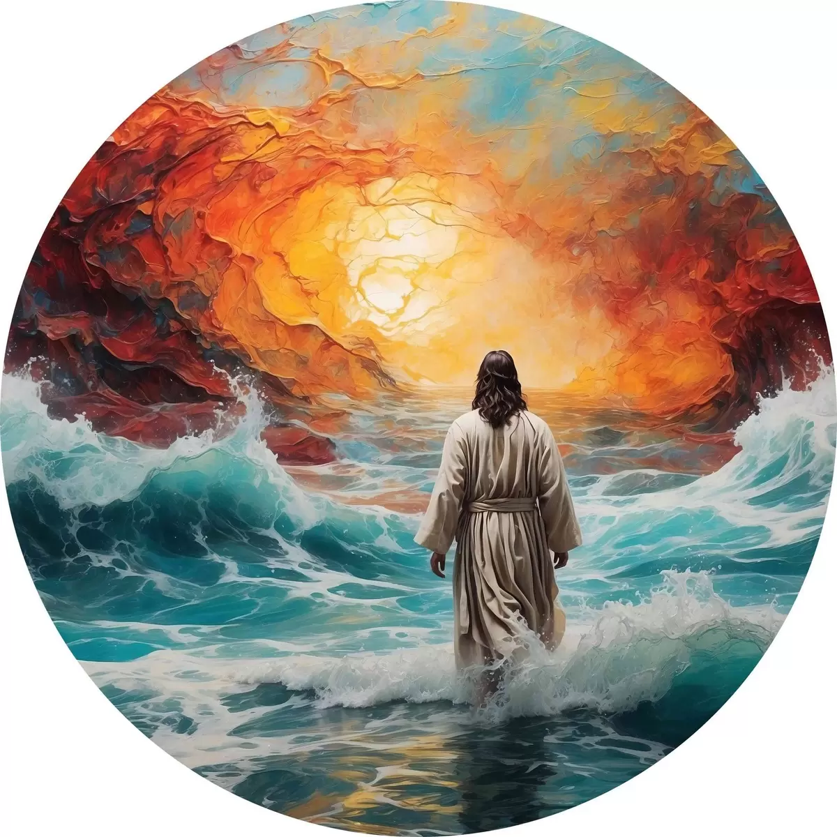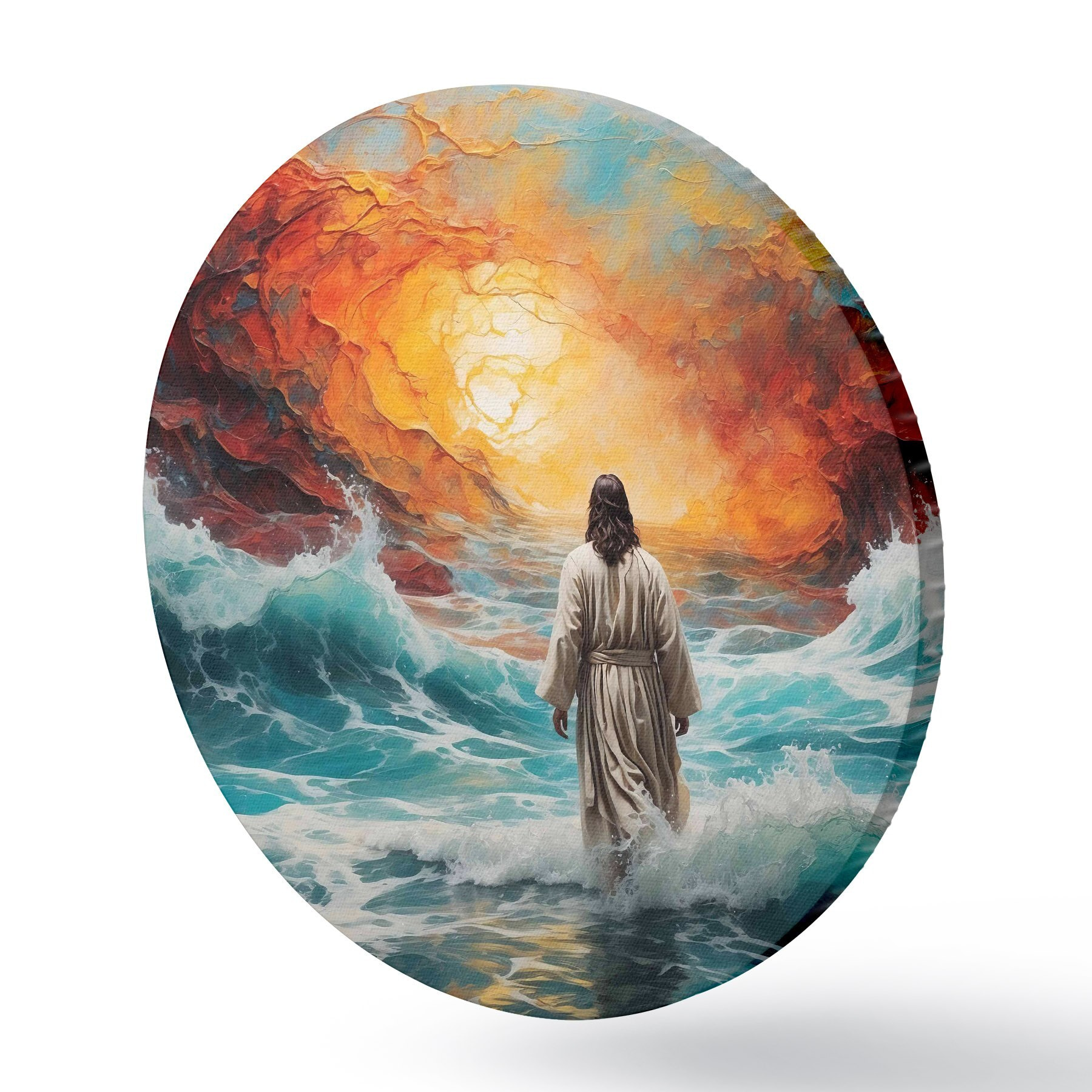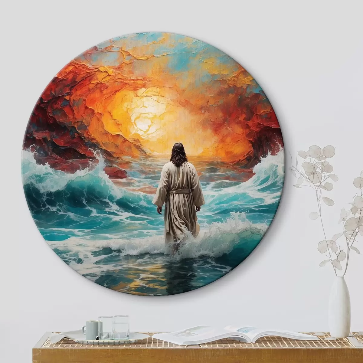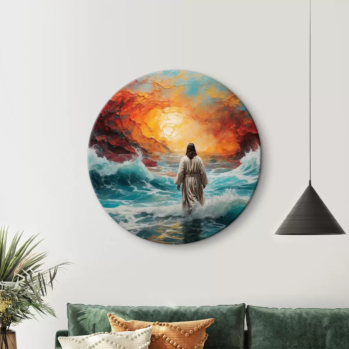 Cuadros redondos Un hombre camina entre el cielo ardiente y el mar r38612