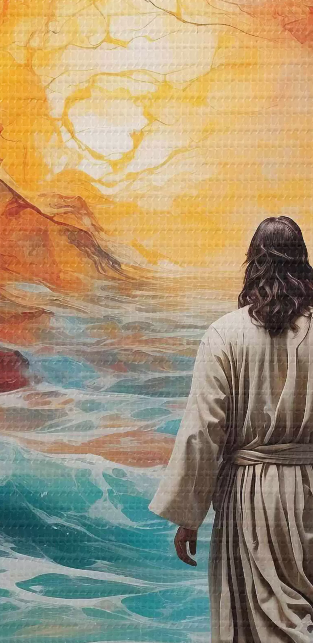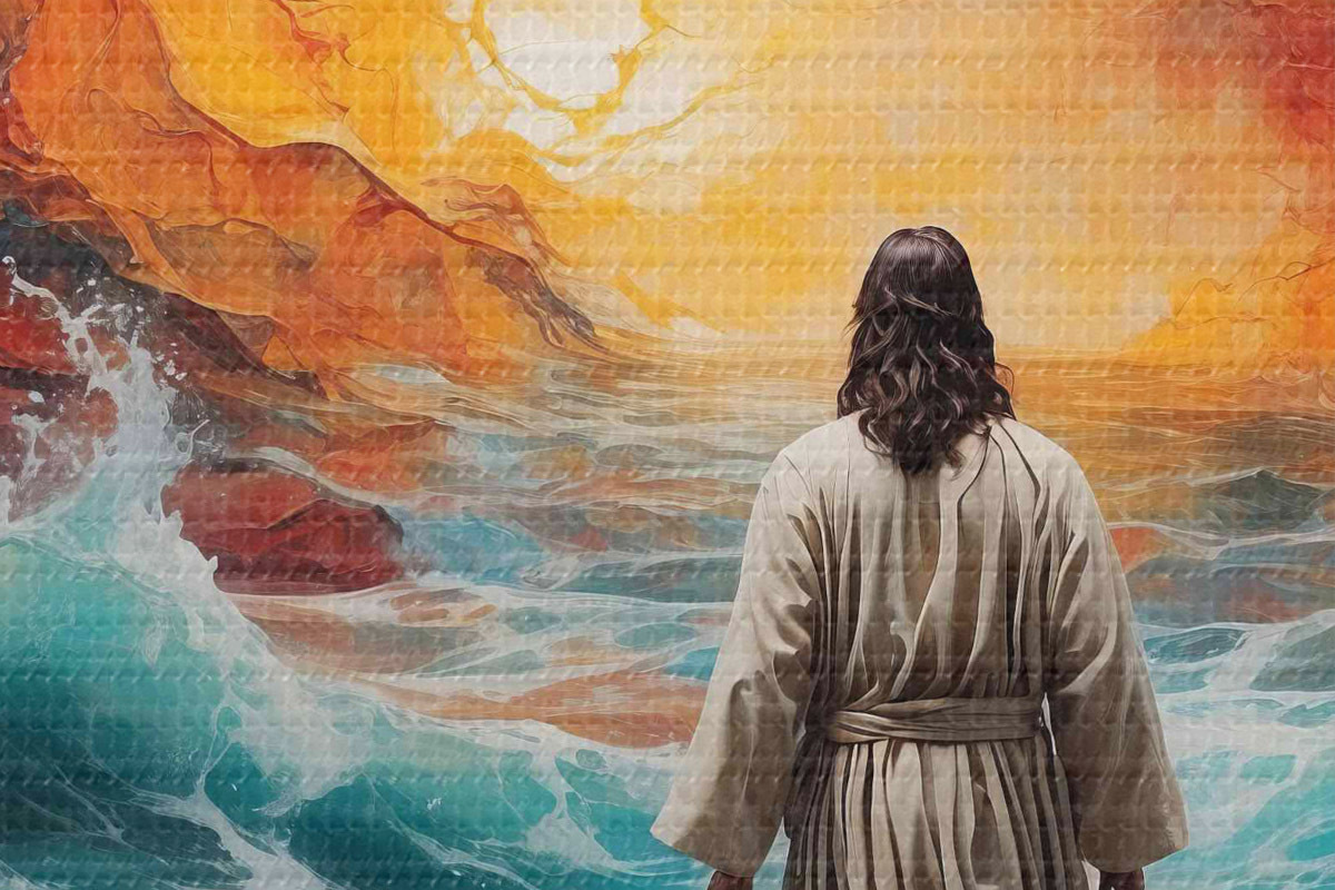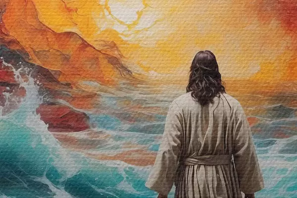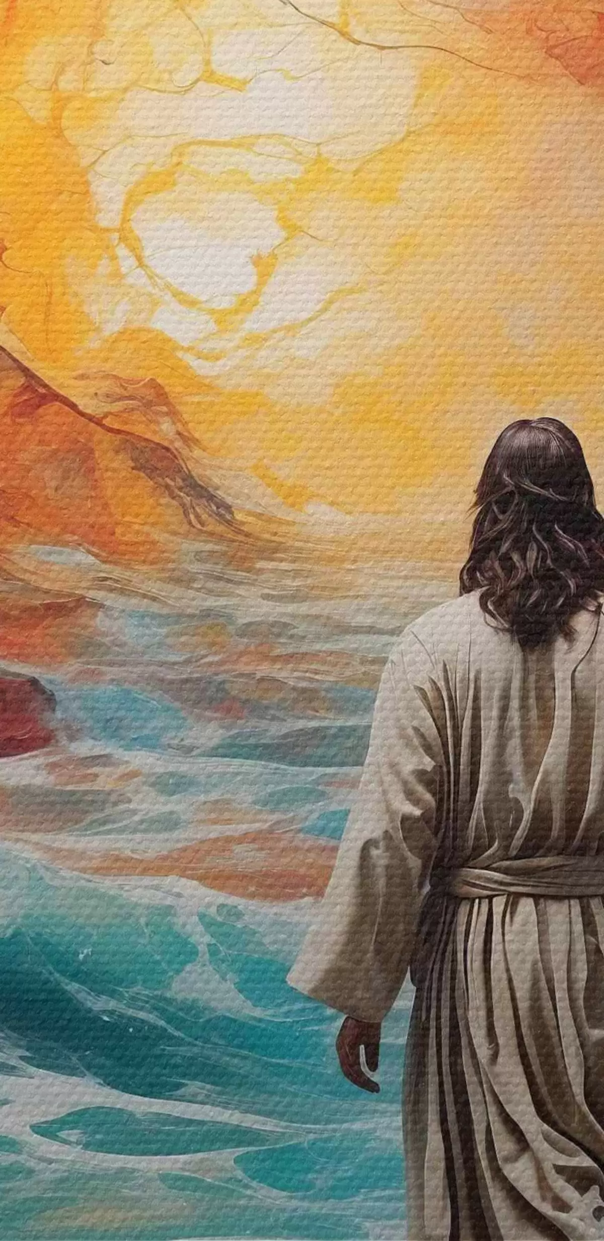 Foto Un hombre camina entre el cielo ardiente y el mar Nr r38612