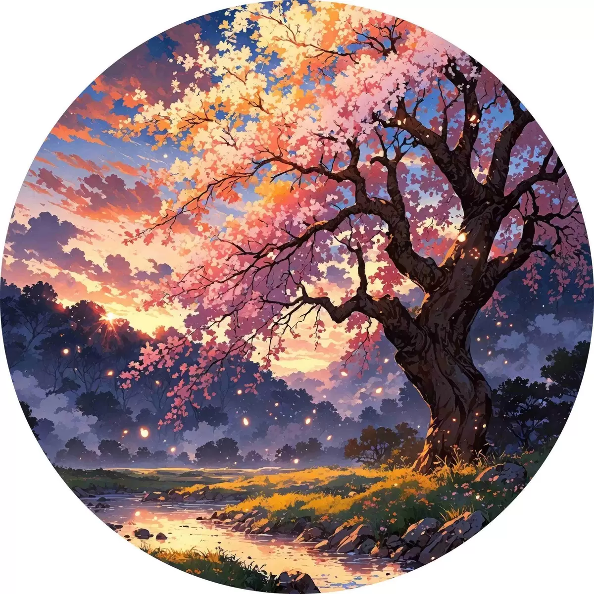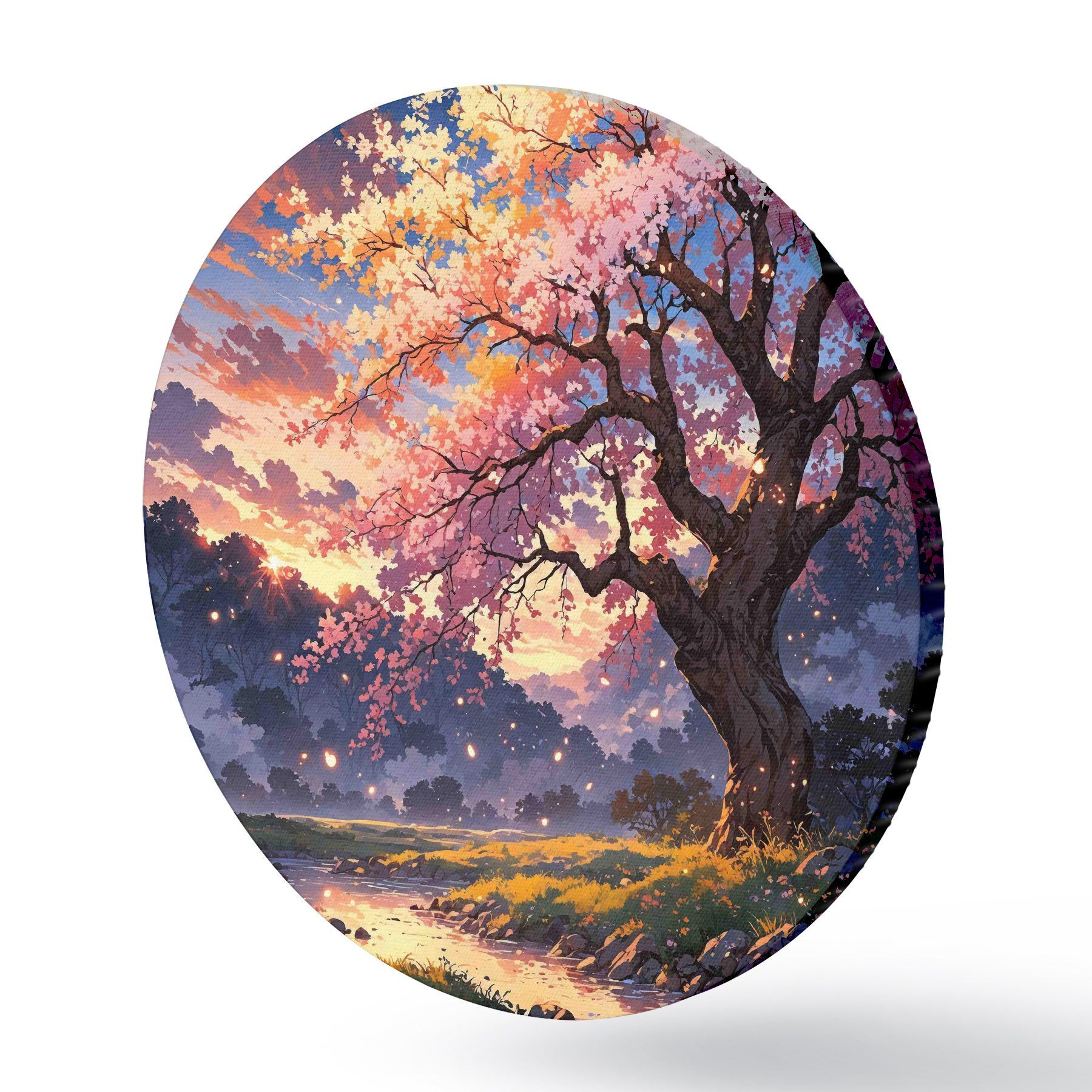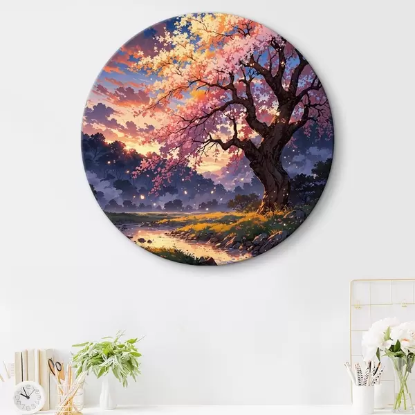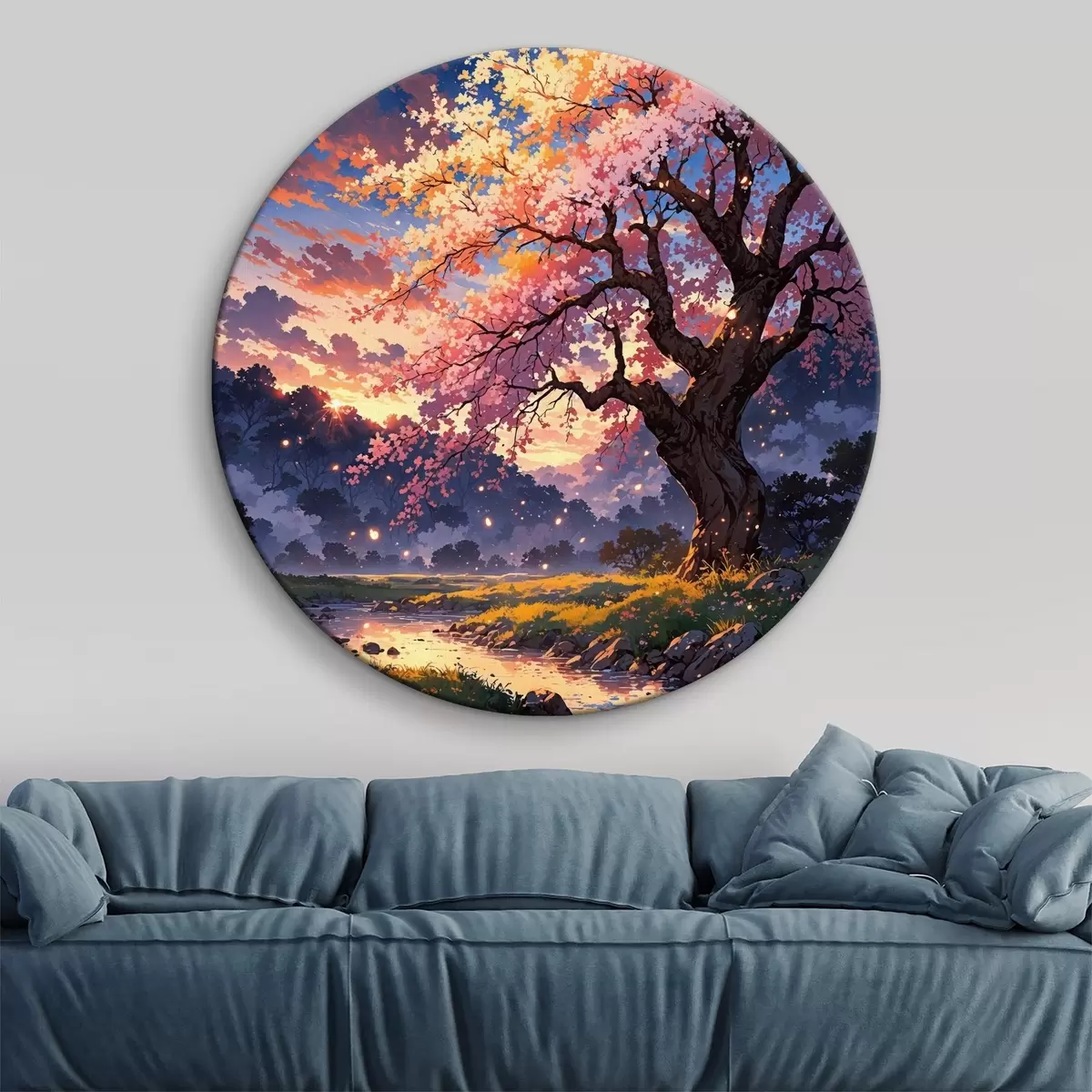 Cuadros redondos Un árbol de flores rosas atravesado por un río r38645