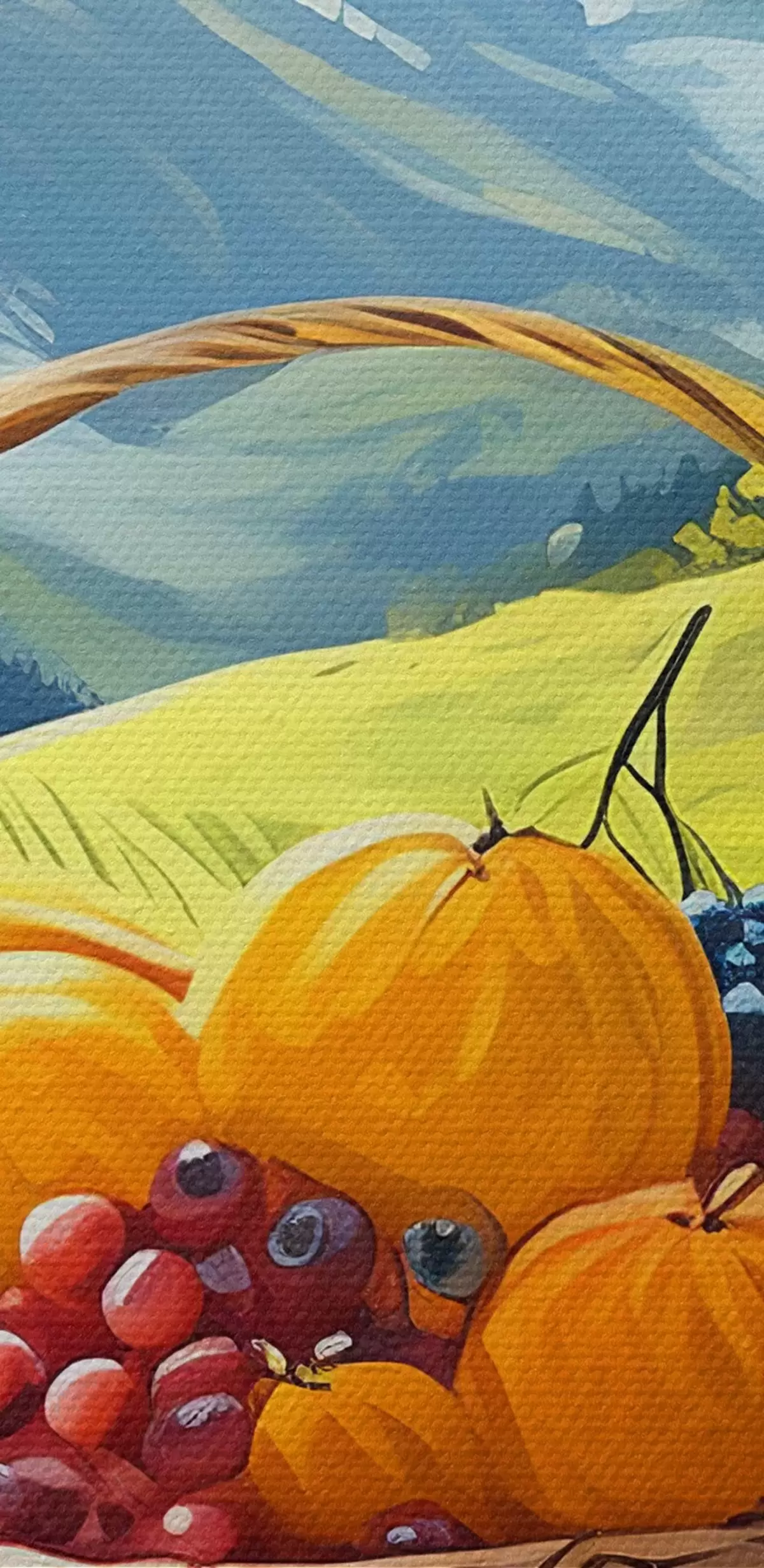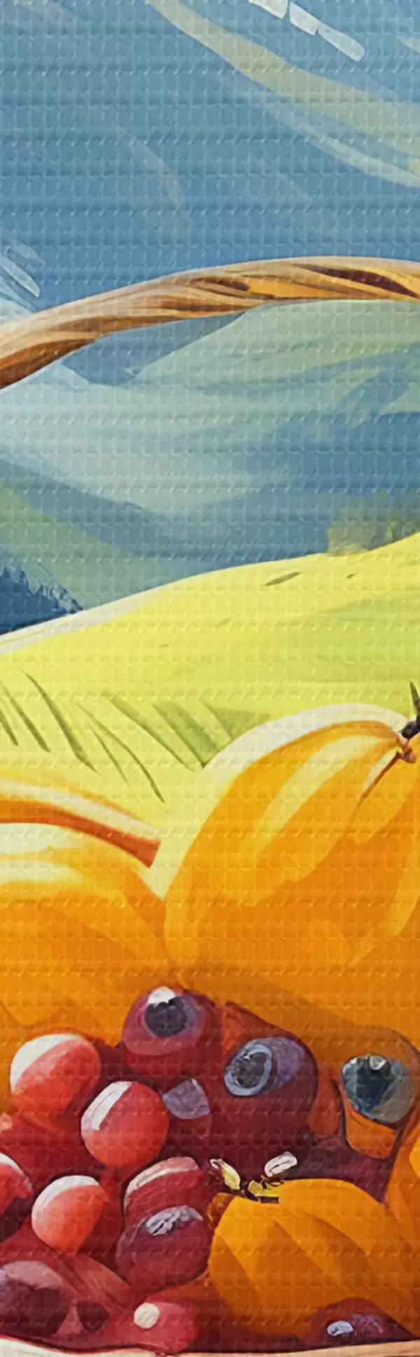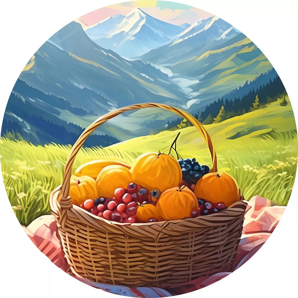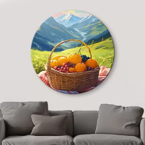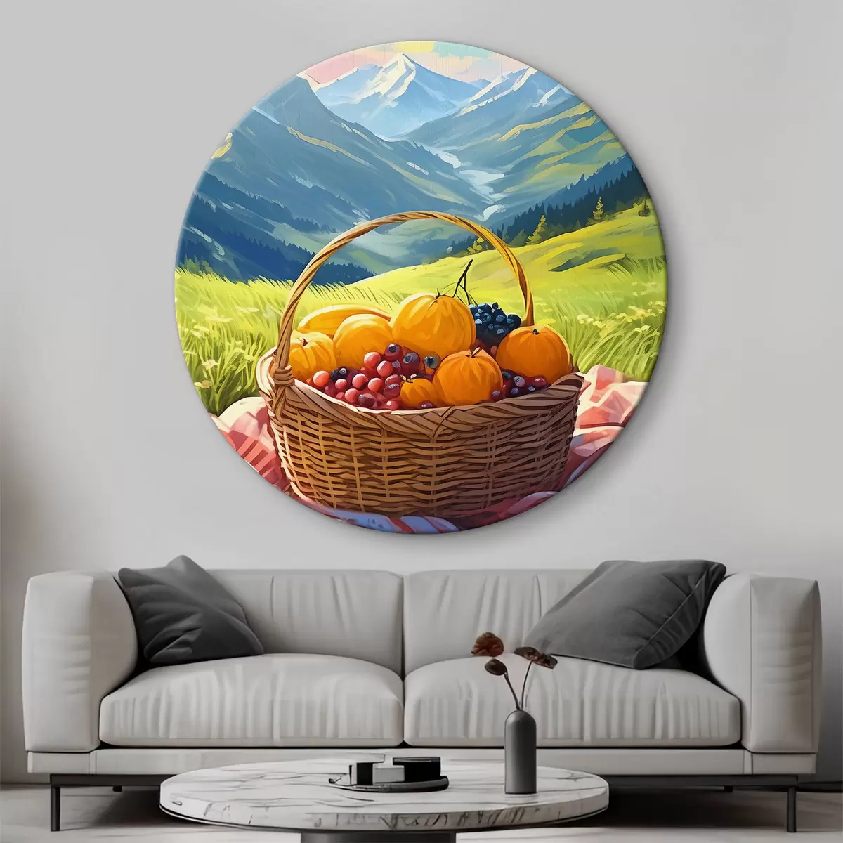 Cuadros redondos una cesta de frutas en un prado en las montañas r38654