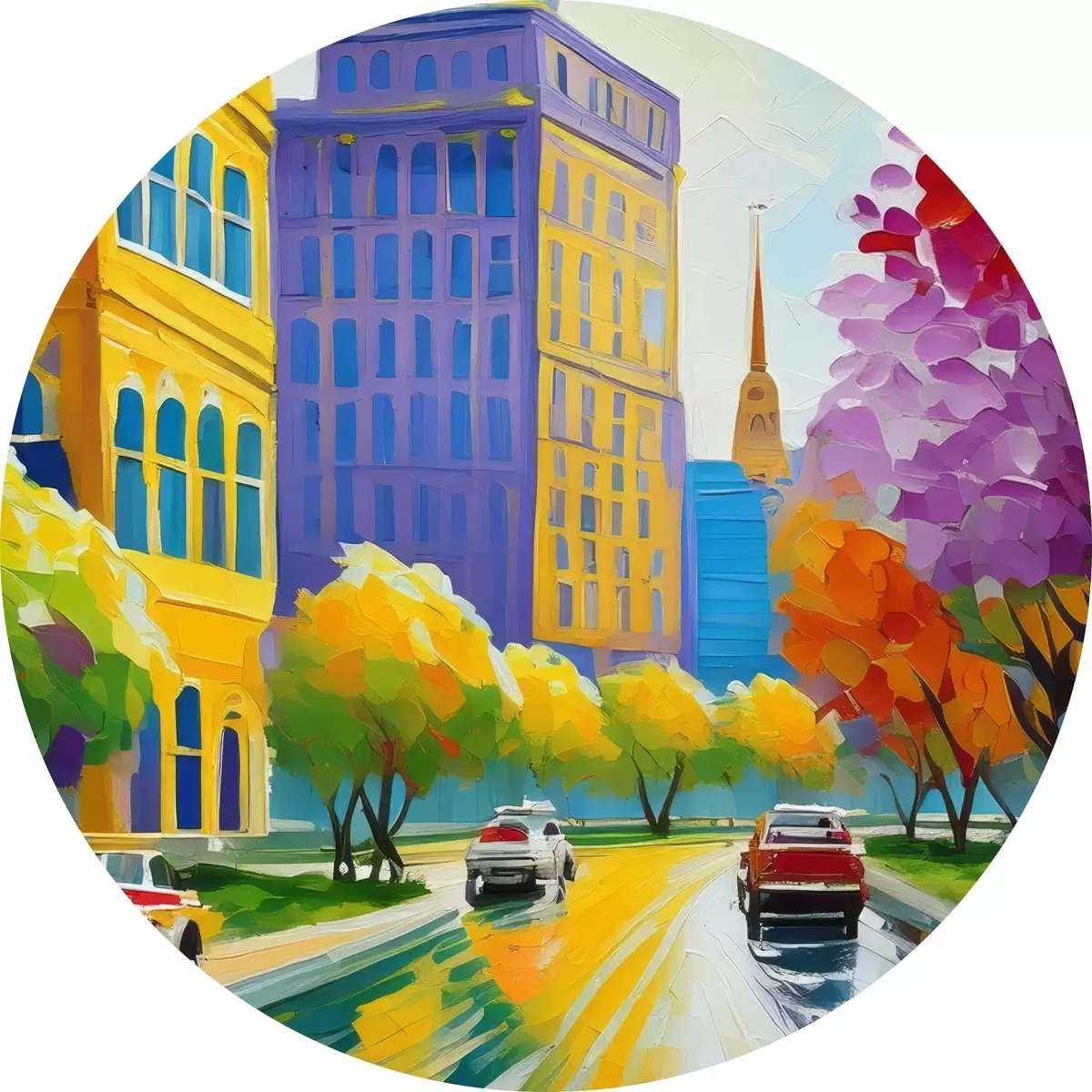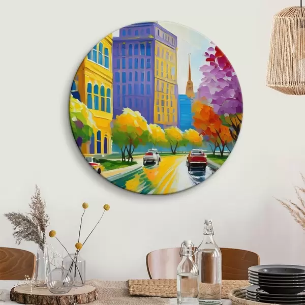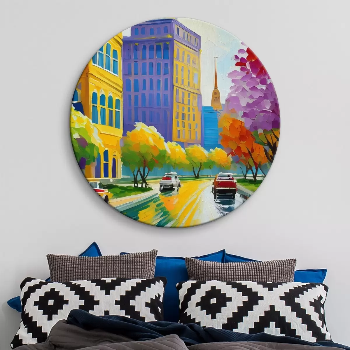 Cuadros redondos Imagen de una calle urbana con coches y árboles r38657