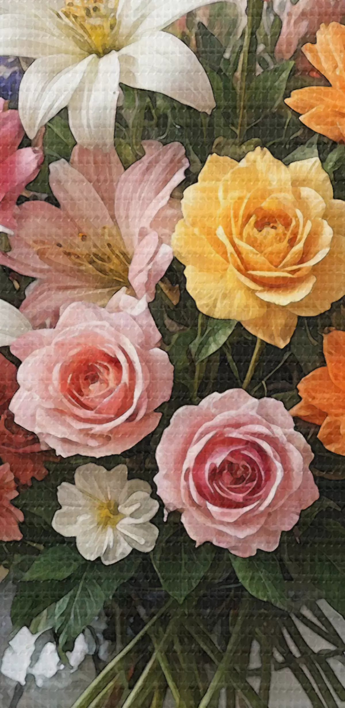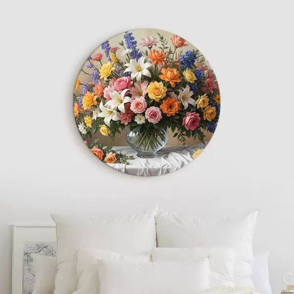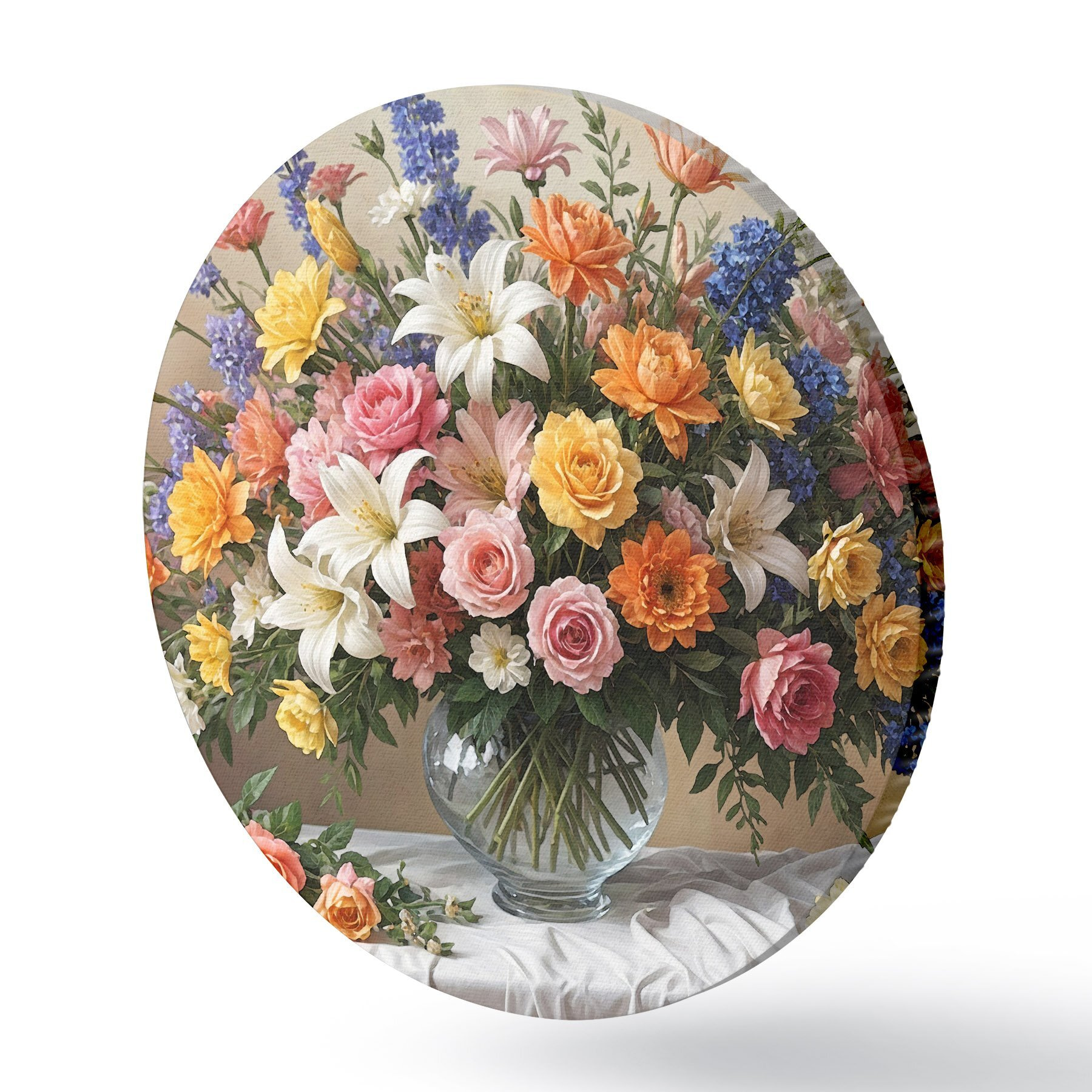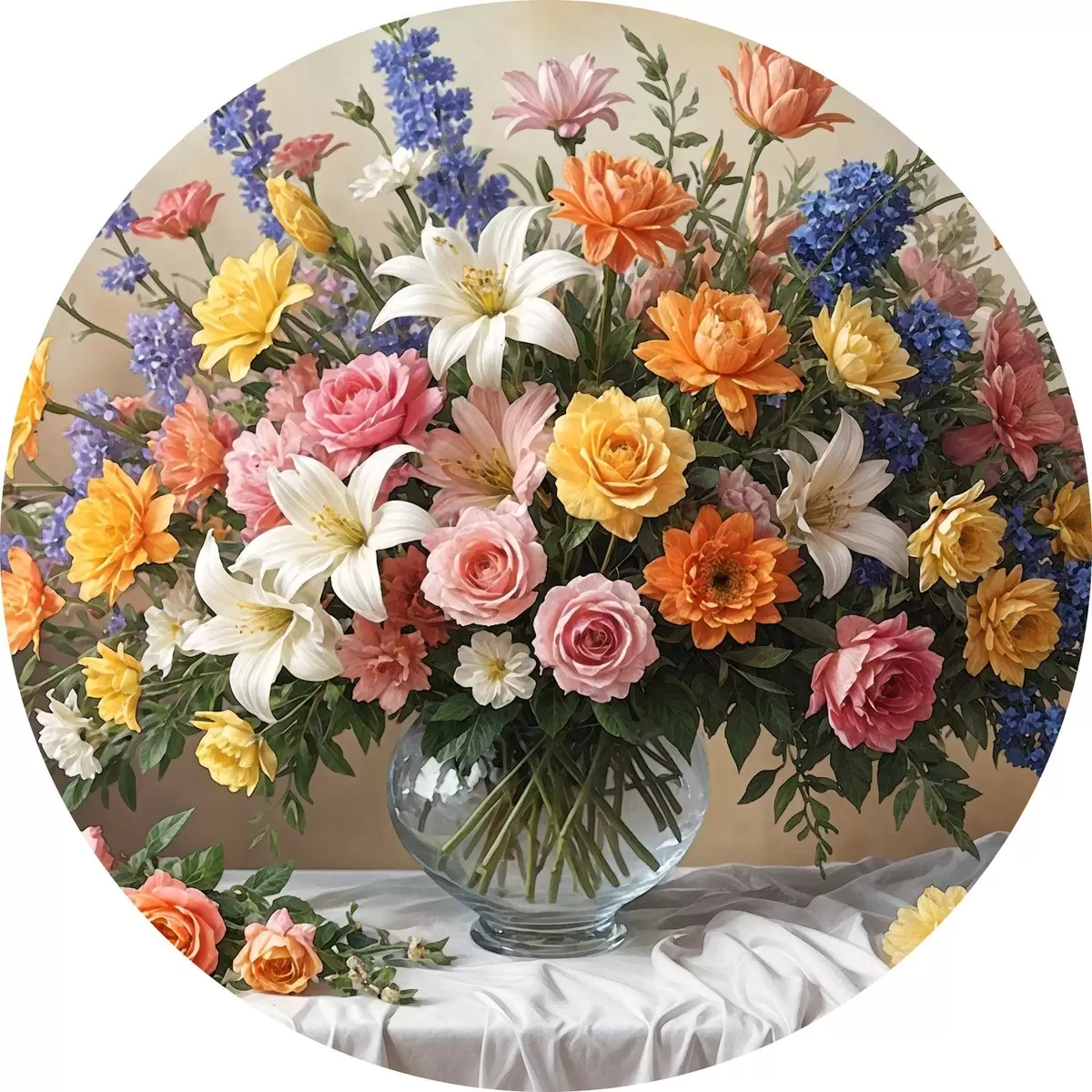 Cuadros redondos Un vibrante ramo de varias flores de colores en un jarrón de vidrio sobre un mantel blanco, pintura artística vintage r38825