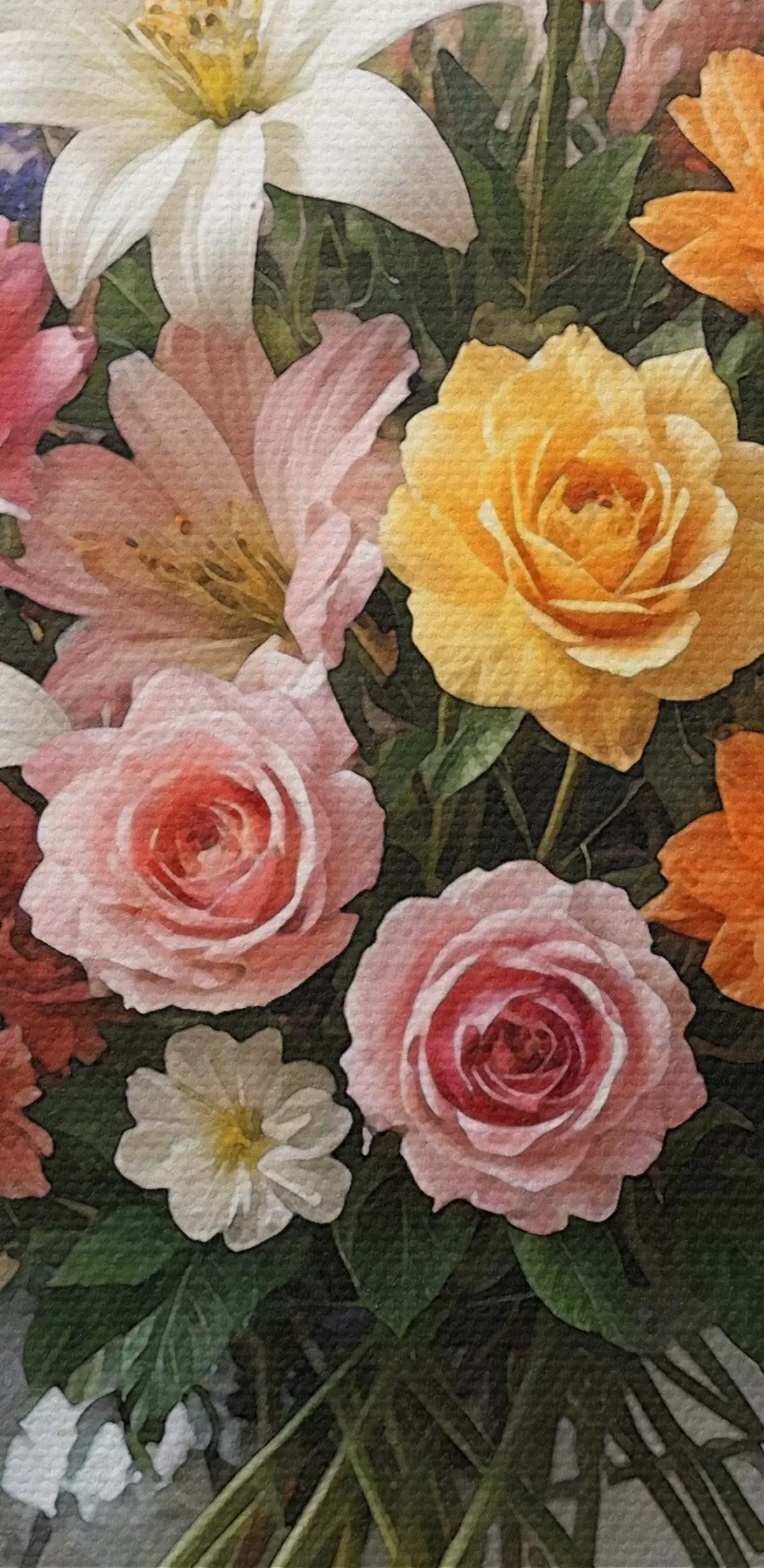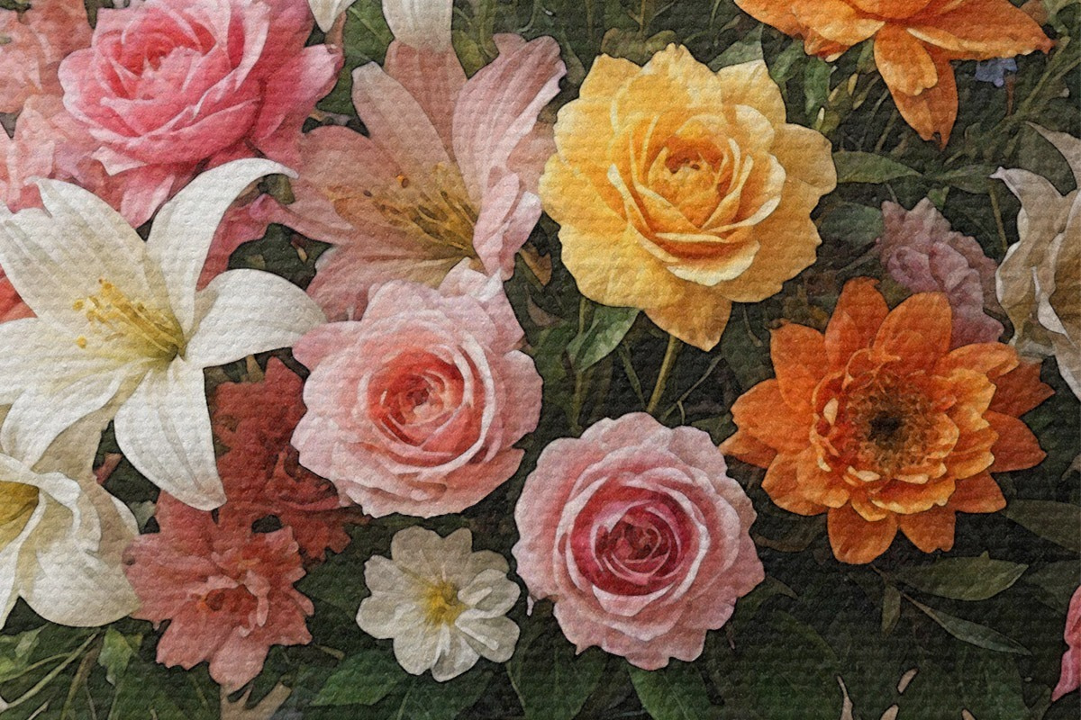 Foto Un vibrante ramo de varias flores de colores en un jarrón de vidrio sobre un mantel blanco, pintura artística vintage Nr r38825