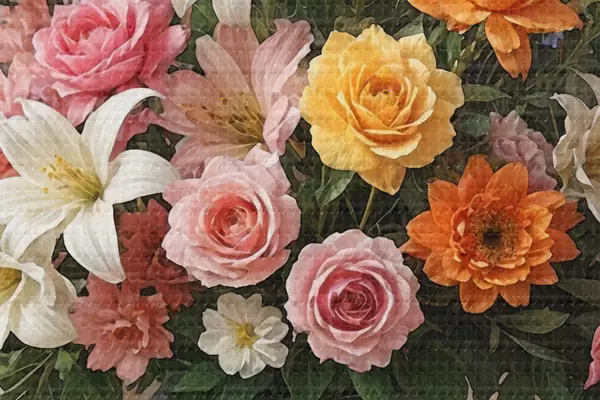 Foto Un vibrante ramo de varias flores de colores en un jarrón de vidrio sobre un mantel blanco, pintura artística vintage Nr r38825
